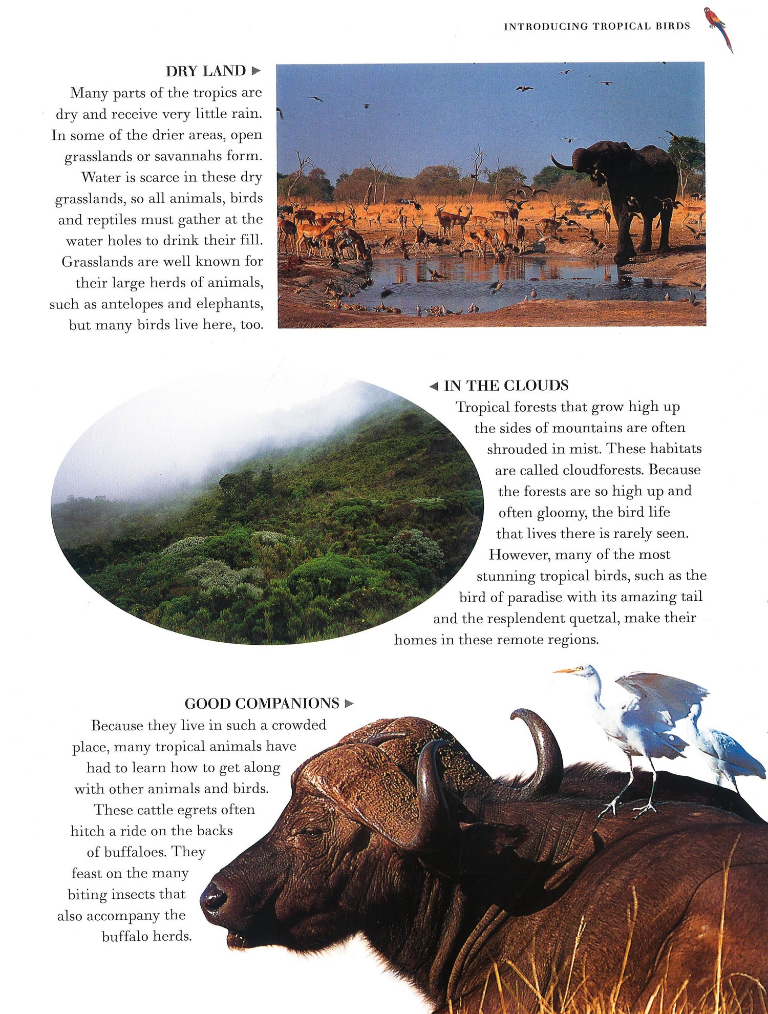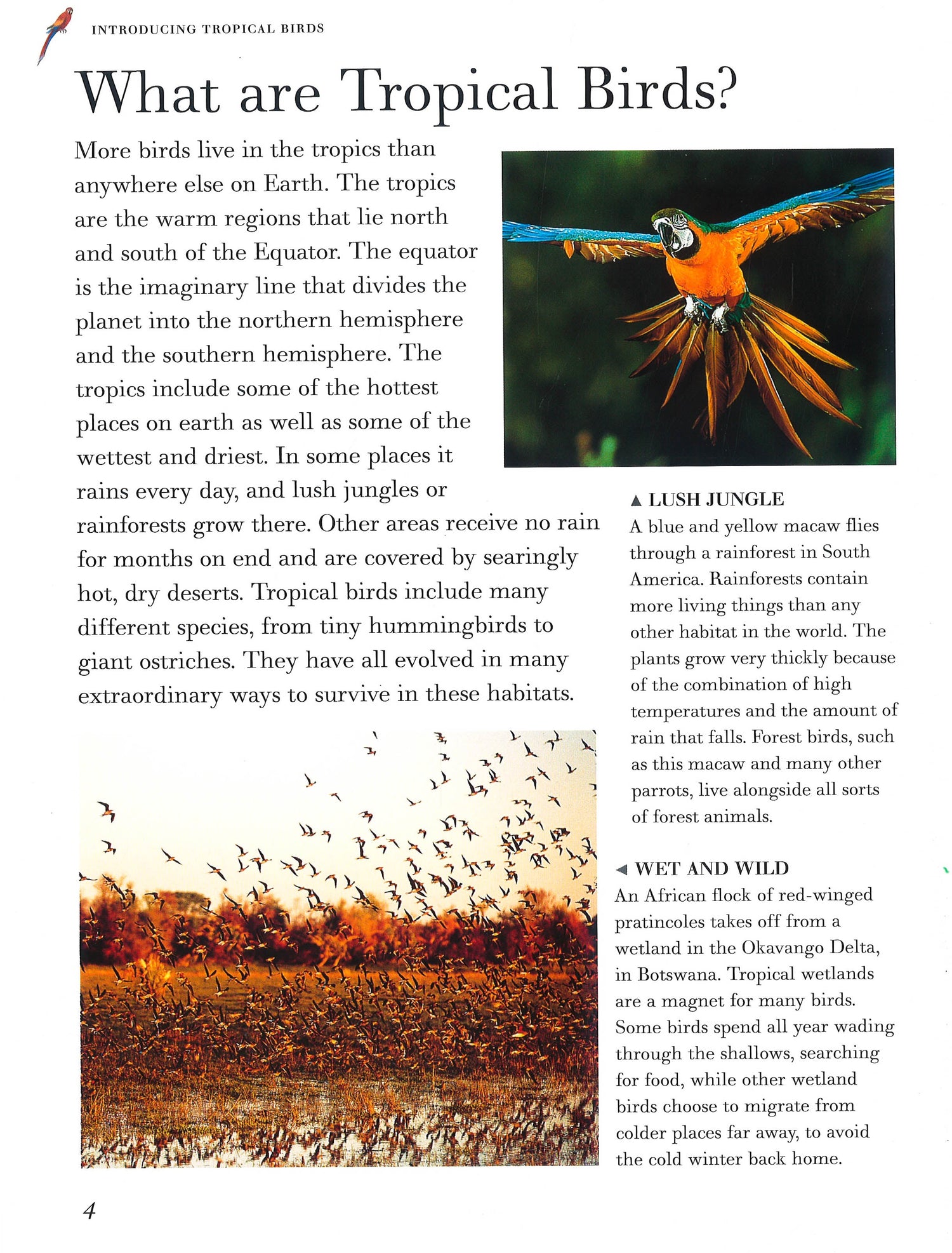 More birds live in the tropics than anywhere else on Earth, and this book reveals every aspect of their lives. Special focus features provide a bird's-eye view - see the courtship dance of the crowned crane, and learn about the many different kinds of parrot, including budgies, cockatoos, macaws, lorikeets and parakeets. 'Did You Know' spotlights provide little-known facts with which you can impress your friends and family. It comes with superb images by top wildlife photographers, as well as detailed illustrations and cross-section diagrams. Young naturalists will be gripped by all the images and information about parrots, tropical and rainforest birds contained in this amazing book. The rainforests and tropics are full of beautiful birds - and this stunning volume reflects and celebrates their exotic world. Some of the most attractive tropical species live high up in the remote cloud forests perched on the sides of lonely mountains. Others live in the open grasslands or savannas, crowded together with different types of animals, in many cases depending upon them for survival.