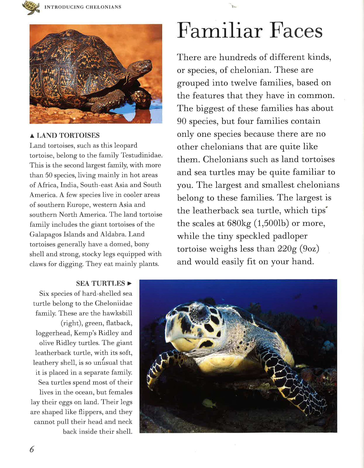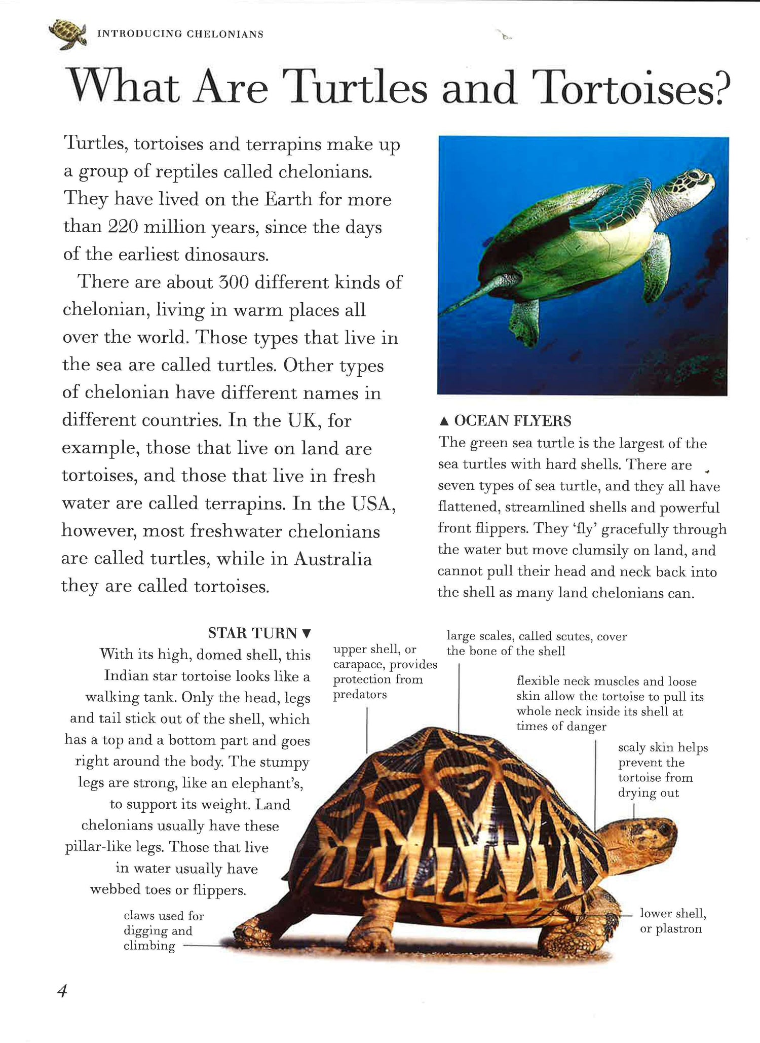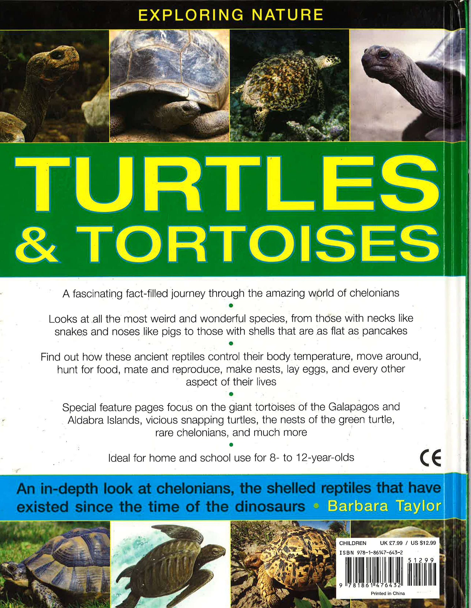 This is an in-depth look at chelonians, the shelled reptiles that have existed since the time of the dinosaurs. Features: a fascinating fact-filled journey through the amazing world of turtles, tortoises and terrapins; looks at all the most weird and wonderful species, from those with necks like snakes and noses like pigs to those with shells as flat as pancakes; special feature pages focus on the giant tortoises of the Galapagos and Aldabra Islands, vicious snapping turtles, the nests of the green turtle, rare chelonians, and more; and, ideal reading for 8- to 12-year-olds. From vast oceans and remote islands to the searing heat of the desert, turtles and tortoises have adapted to almost every environment. There are hundreds of different species of this group of reptiles - known as chelonians - which range in size from the enormous leatherback sea turtle to the tiny speckled Cape tortoise, which is small enough to fit in your hand. Informative, lively text complements more than 180 beautiful images, making this a fascinating reference guide for use both at home and in the classroom.