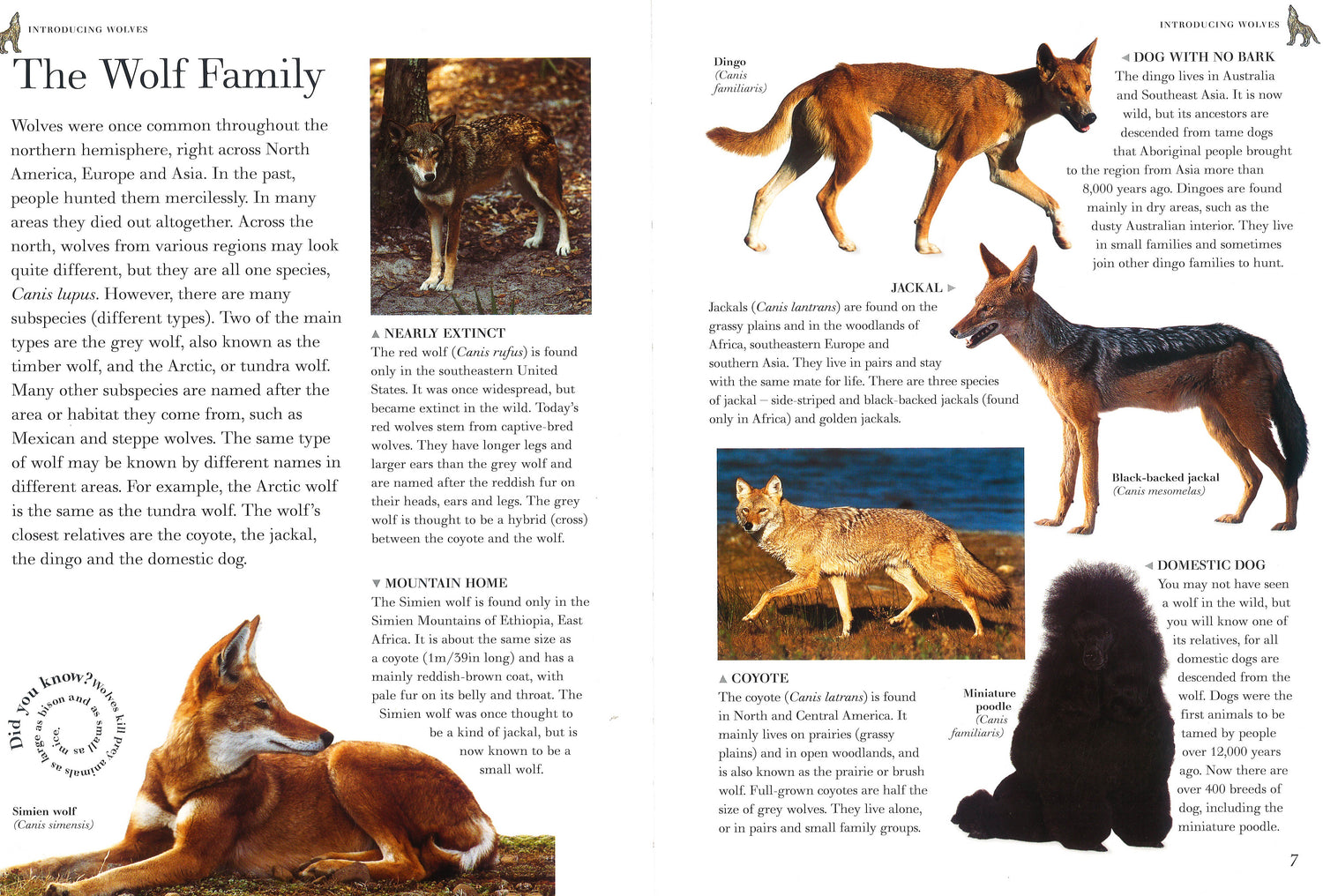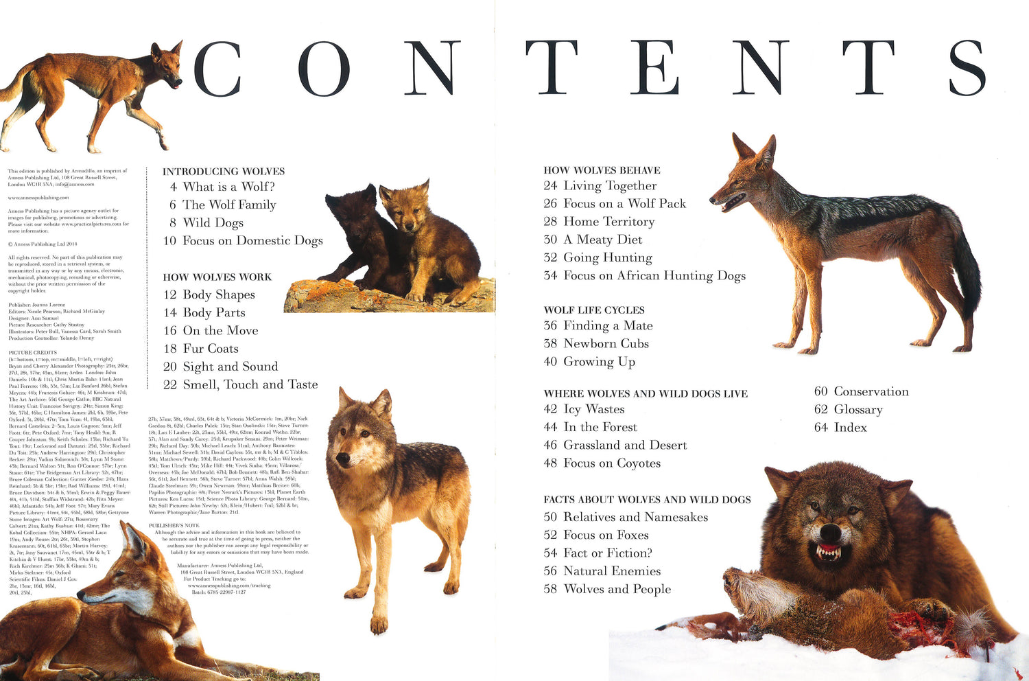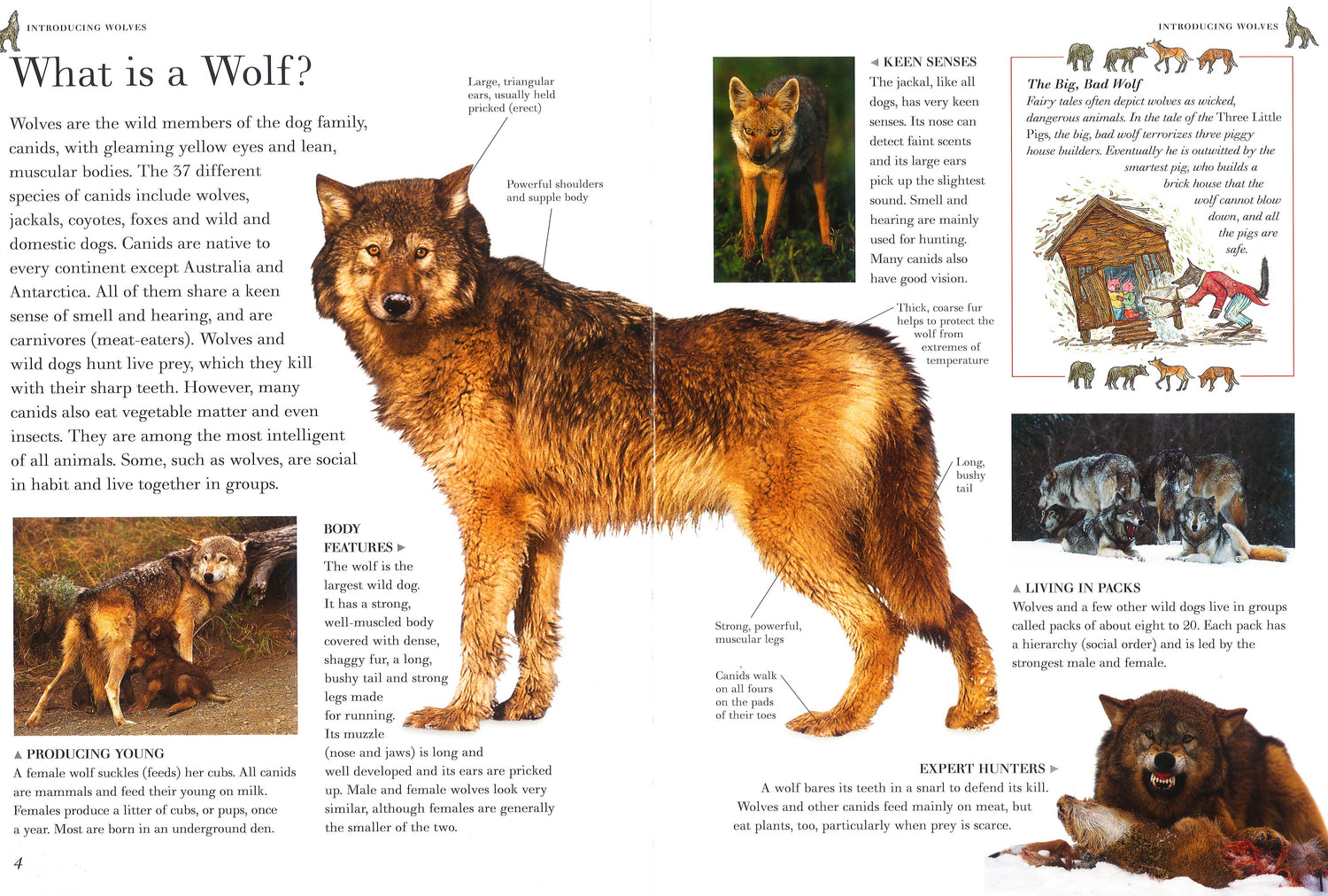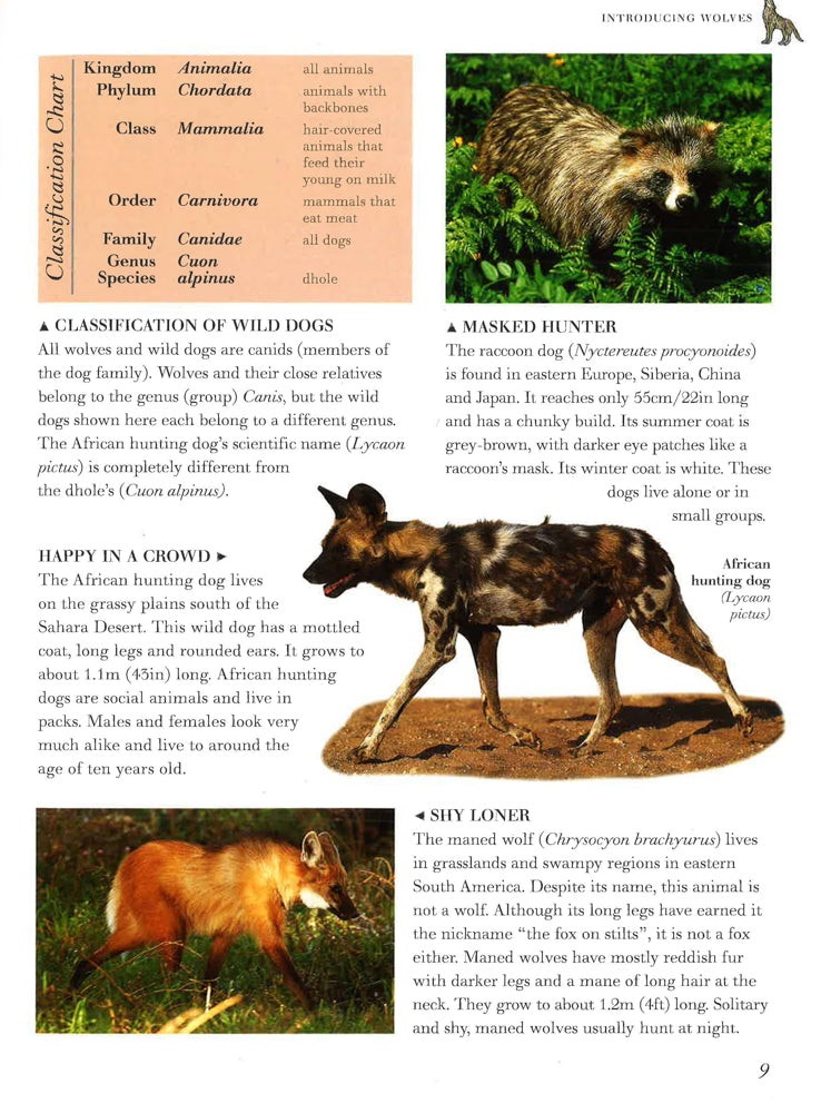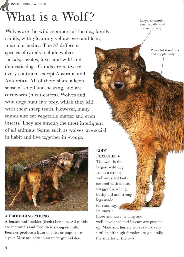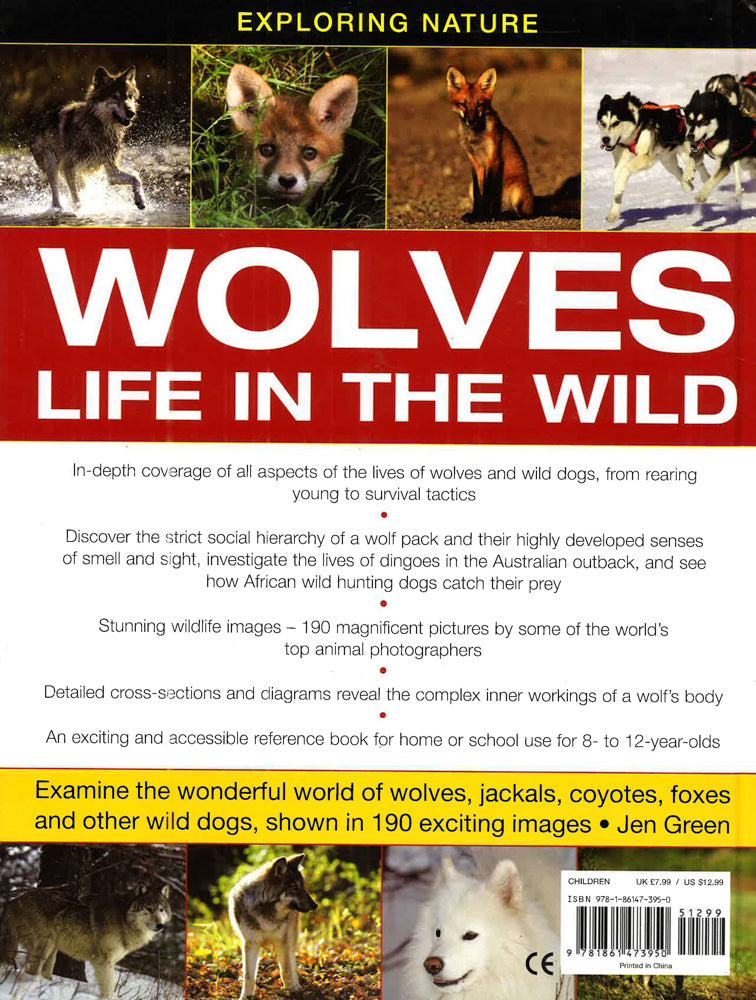 This title lets you examine the wonderful world of wolves, jackals, coyotes, foxes and other wild dogs, shown in 190 exciting images. It offers in-depth coverage of all aspects of the lives of wolves and wild dogs, from rearing young to survival tactics. You can discover the strict social hierarchy of a wolf pack and their highly developed senses of smell and sight. Stunning wildlife images - 190 magnificent pictures by some of the world's top animal photographers. Detailed cross-sections and diagrams reveal the complex inner workings of a wolf's body. Myth and legend boxes highlight the popular stories and beliefs surrounding these fabulous animals. It is an exciting and accessible reference book for home or school use for 8- to 12-year-olds. Wolves are the wild, savage ancestors of all domestic dogs - everything from the German shepherd to the poodle. This fascinating book investigates these highly specialized hunters and also examines their closest relatives, including bush dogs, coyotes, dholes, foxes, jackals and raccoon dogs.Special features concentrate on particular themes, such as the lives of dingoes in the Australian outback and how African wild hunting dogs catch their prey - all conveyed through lively and authoritative text and eye-catching photographs.