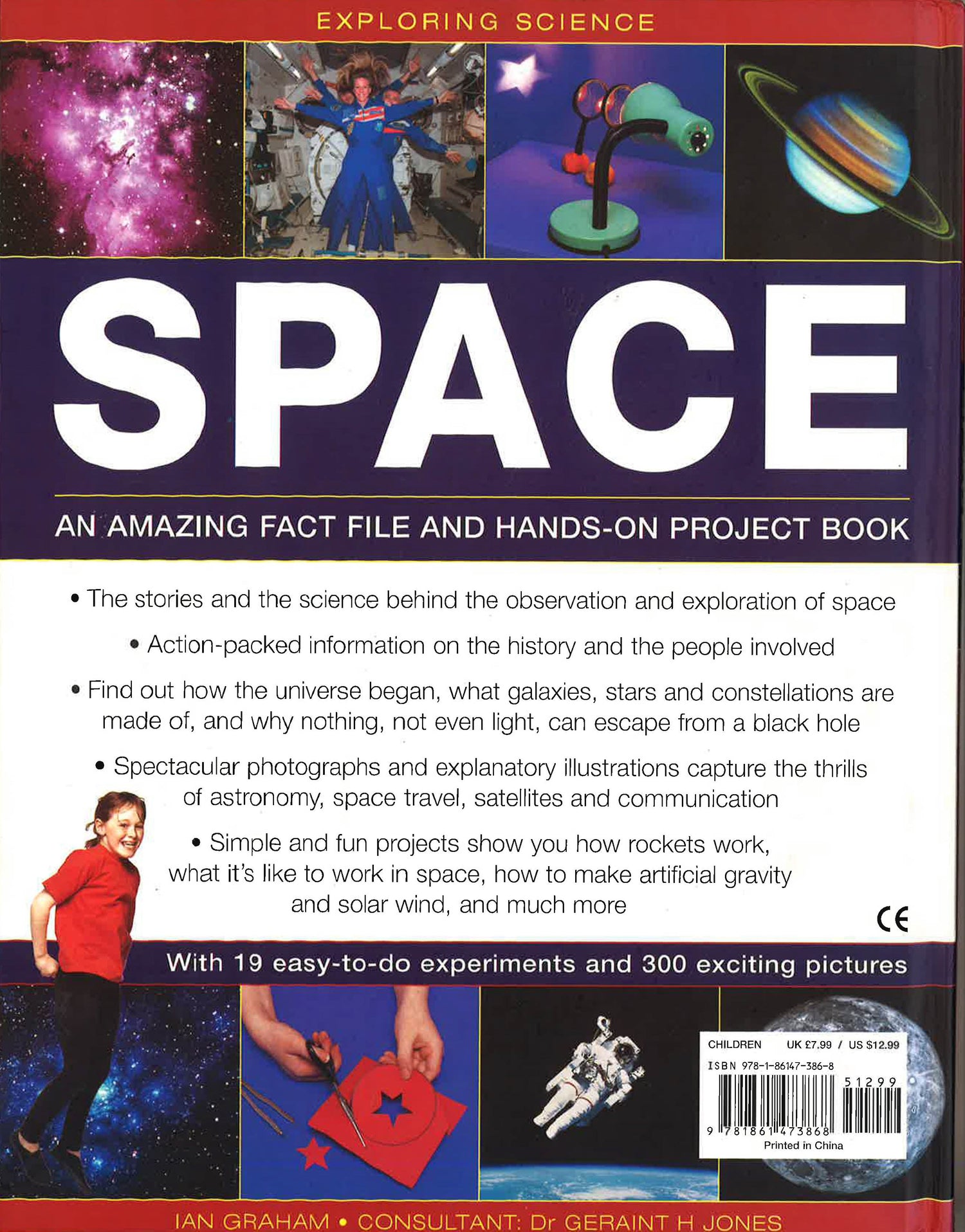This title comes with 19 easy-to-do experiments and 300 exciting pictures. It deals with the stories and the science behind the challenge to explore the cosmos. It offers action-packed information on the history, the people and the science of space. You can find out how the universe began, what galaxies, stars and constellations are made of, and why nothing, not even light, can escape from a black hole. Spectacular photographs and explanatory illustrations capture the thrills of space observation, travel, satellites and communication. Easy-to-do projects show you how rockets work, what it's like to work in space, how to make artificial gravity and solar wind, and much more. Space contains everything there is, from the Earth we live on to the most distant star. This fascinating book takes you on a journey to the Moon, the planets of the solar system and beyond. You can learn about the telescopes astronomers are using to search for extra-terrestrial life among the stars. You can follow the history of space research, from the earliest rockets to the future of space travel. Exciting experiments include making a dish antenna and simulating solar heat. The projects are fun to do and help explain the science and technology of space exploration.