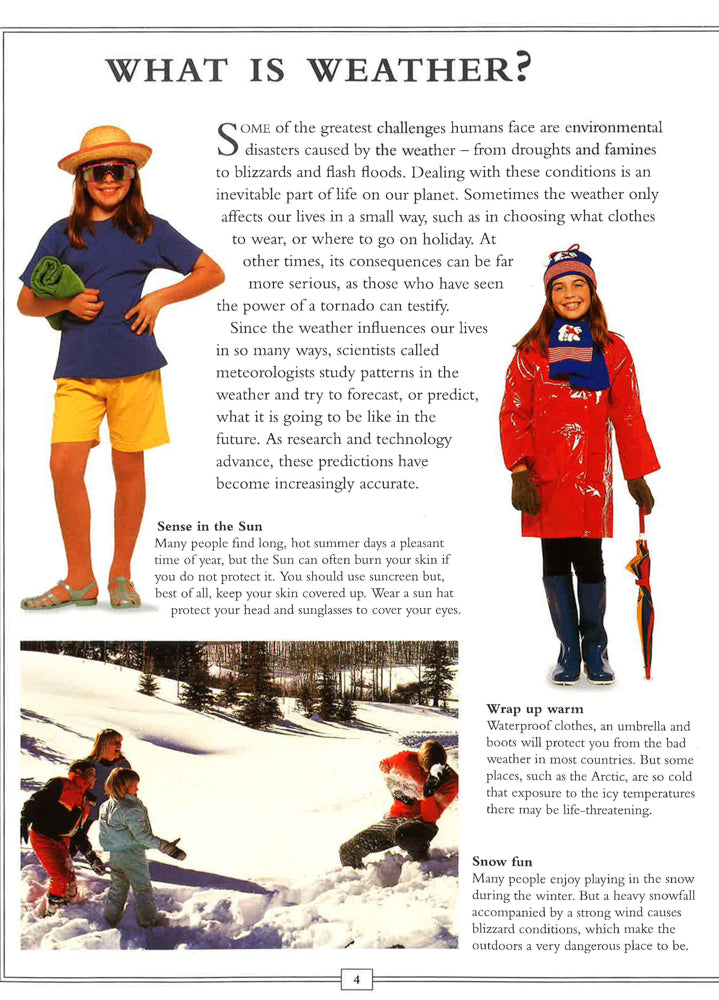 This title helps you learn what makes weather happen - from the deadly threat of a hurricane to a rainbow's delicate play of light. It features over 250 amazing photographs and illustrations that capture the devastation caused by a severe flood, the split-second flash of lightning, and much more. You can see how people, plants and animals cope with searing heat and bitter cold. To make learning even more exciting, there are lots of simple experiments that you can do, such as testing air pressure, creating static electricity, and making your own weather station. It is a stimulating reference for 8- to 12-year-olds to use at home or school. You can discover the catastrophic combination of circumstances that give twisters the power to suck up houses into their deadly vortex, and the forces of nature that create the exquisite structure of a snowflake. You can visit the hottest, wettest and coldest places on the planet - where the ground gets so dry that it cracks, or where ice storms cause electricity pylons to crash to the ground. Dramatic photographs team up with lively and informative text to explore and explain the workings of weather from different climates all around the world.