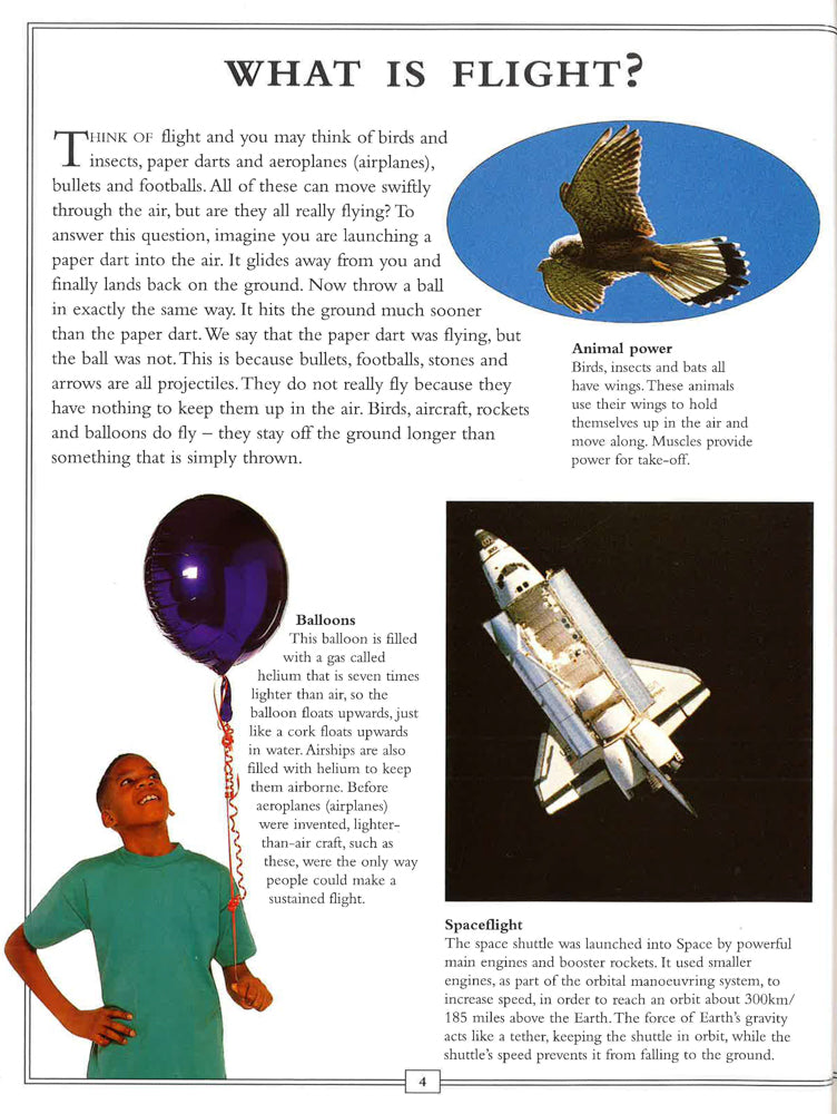 This title comes with 18 easy-to-do experiments and 240 exciting pictures. You can uncover the flight techniques of insects, birds and other flying creatures. You can explore the science that humans have developed to enable them to fly. You can find out how a jumbo jet carrying 500 passengers can stay in the air, and how a hummingbird can hover over a flower with pinpoint precision. Exciting experiments and inside-view diagrams explain the mechanics of drag, lift and thrust. Dramatic photographs and expert text capture the power and mystery of flight. It is an ideal reference source, for use at home or at school. You can follow the history of flying, from the first (disastrous) human attempts to soar like birds, to the creation of a supersonic airliner that flies faster than a bullet. You can explore the techniques of nature's most skilled flyers - from the prehistoric pterosaur to the long-distance albatross. You can share the excitement of the first human flight by Orville and Wilbur Wright, and the challenge of flying a round-the-world hot-air balloon. Step-by-step experiments and projects - including making a balloon jet, a kite and a rocket - will help you to understand how flight works.