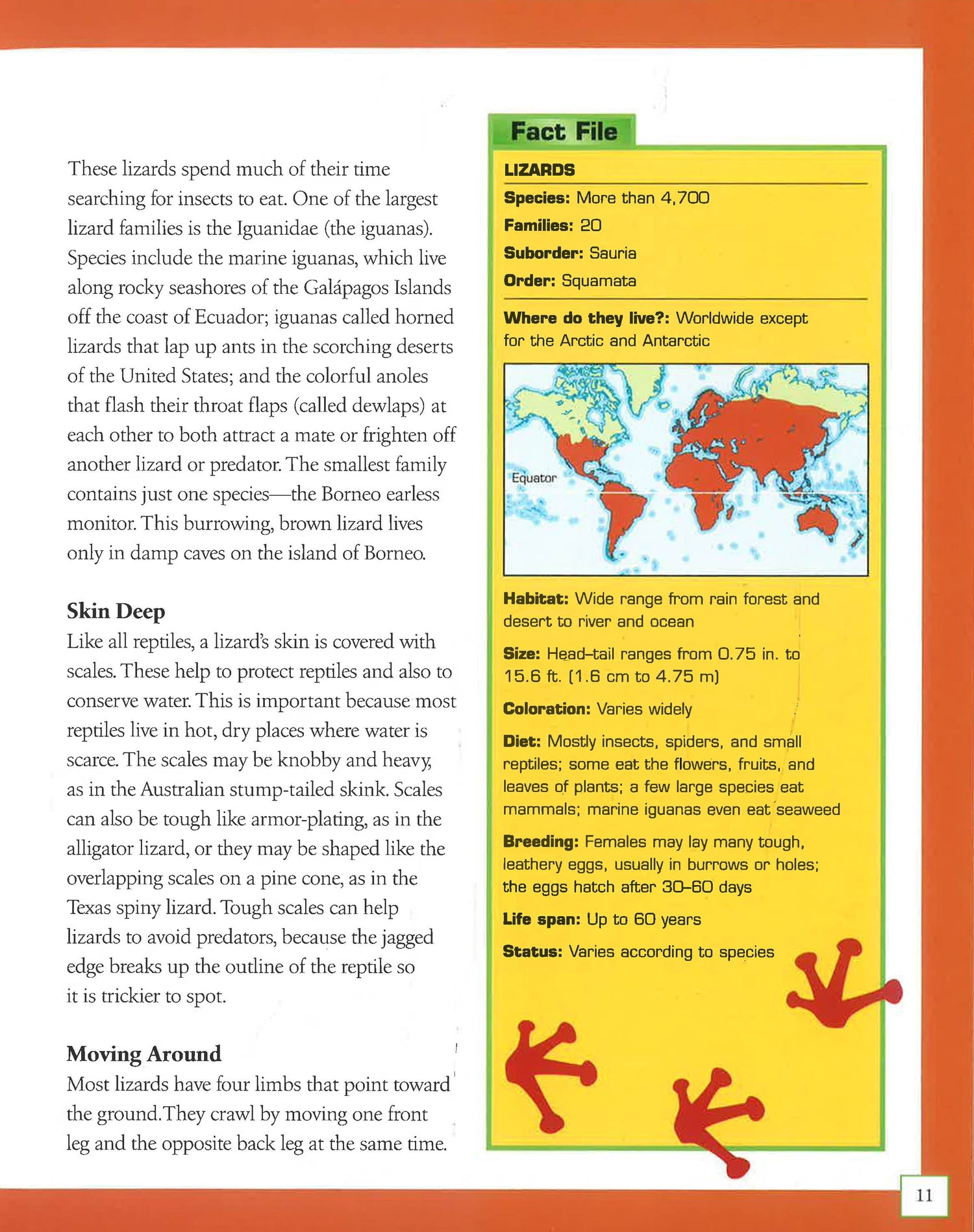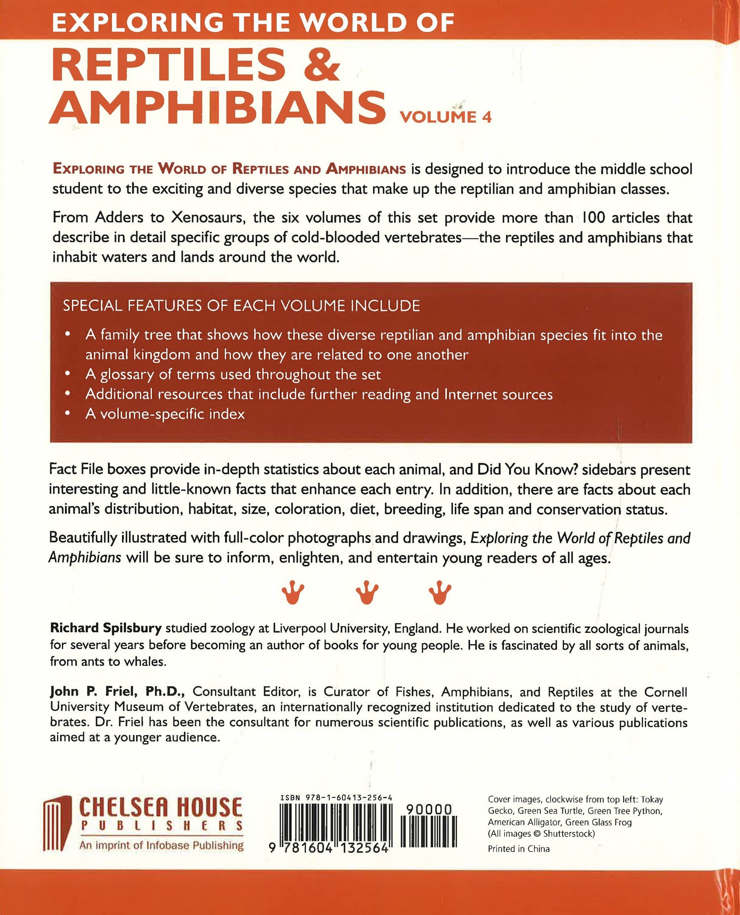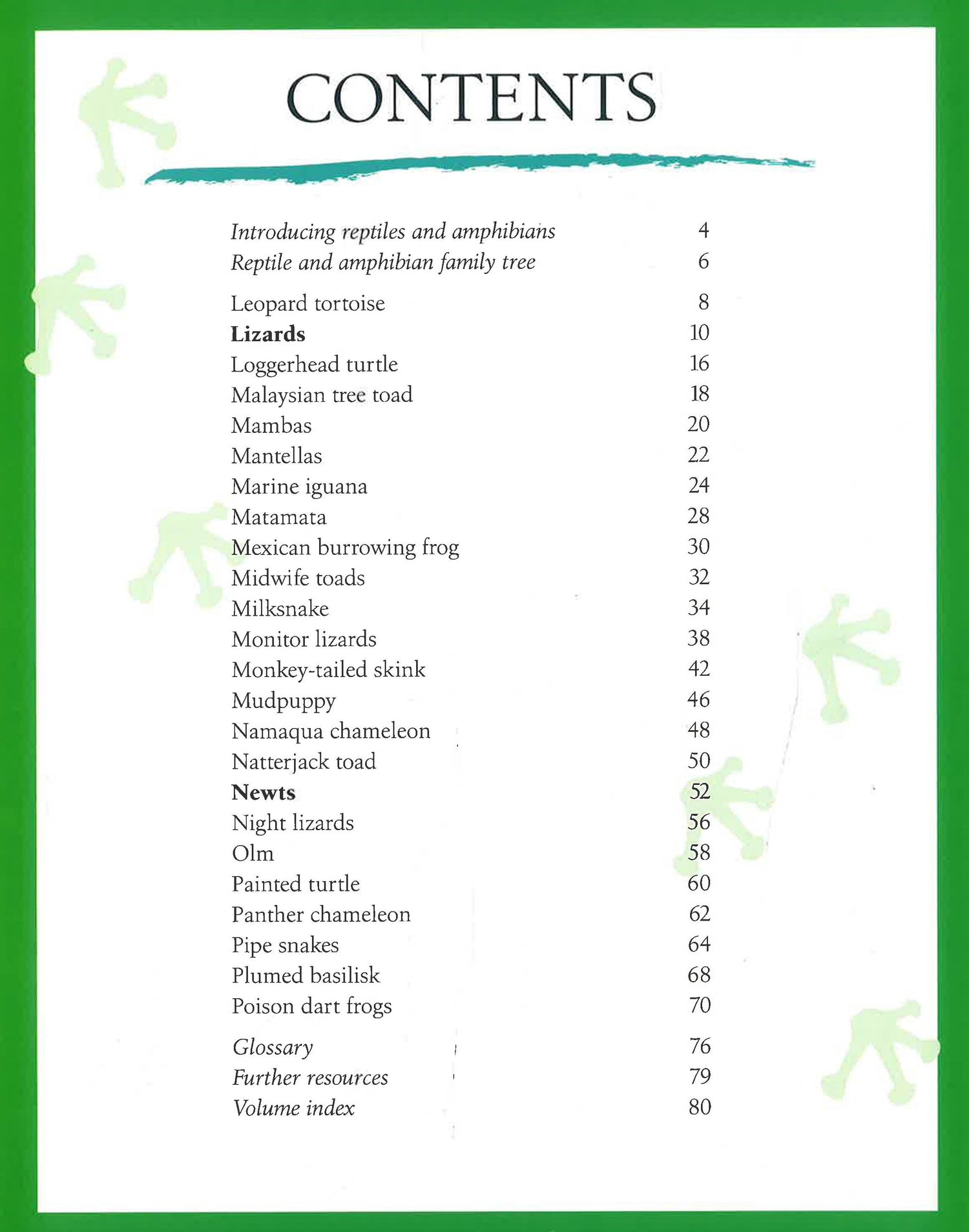 Presents a comprehensive list of worldwide amphibians and reptiles, including information on their breeding rituals, habitats, sizes, diets, and unique characteristics.