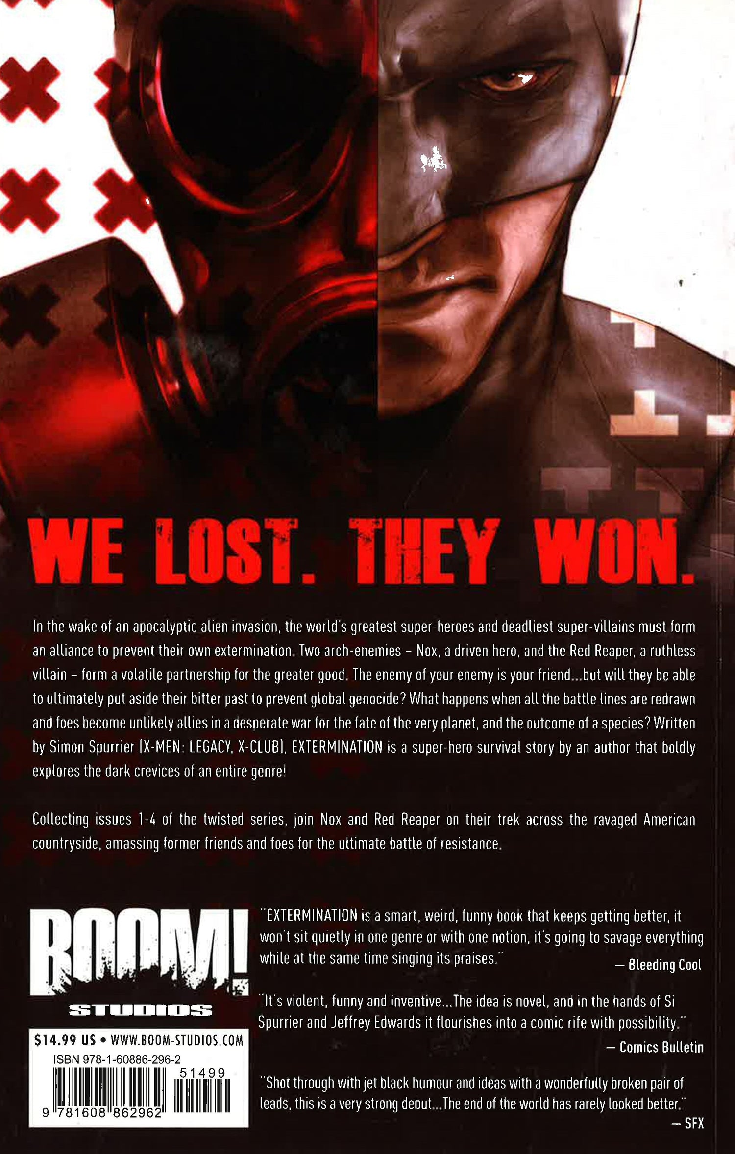 A superhero survival story that boldly explores the dark crevices of an entire genre. WE LOST. THEY WON. In the wake of an apocalyptic alien invasion, the world's greatest super-heroes and deadliest super-villains must form an alliance to prevent their own extermination. Two arch-enemies, Nox, a driven hero, and Red Reaper, a ruthless villain, form a volatile partnership for the greater good. The enemy of your enemy is your friend but will they be able to ultimately put aside their bitter past to prevent global genocide? What happens when all the battle lines are redrawn and foes become unlikely allies in a desperate war for the fate of the very planet and the outcome of a species? Written by Simon Spurrier (X-CLUB, FEAR ITSELF: THE HOME FRONT, WOLVERINE: DANGEROUS GAMES).