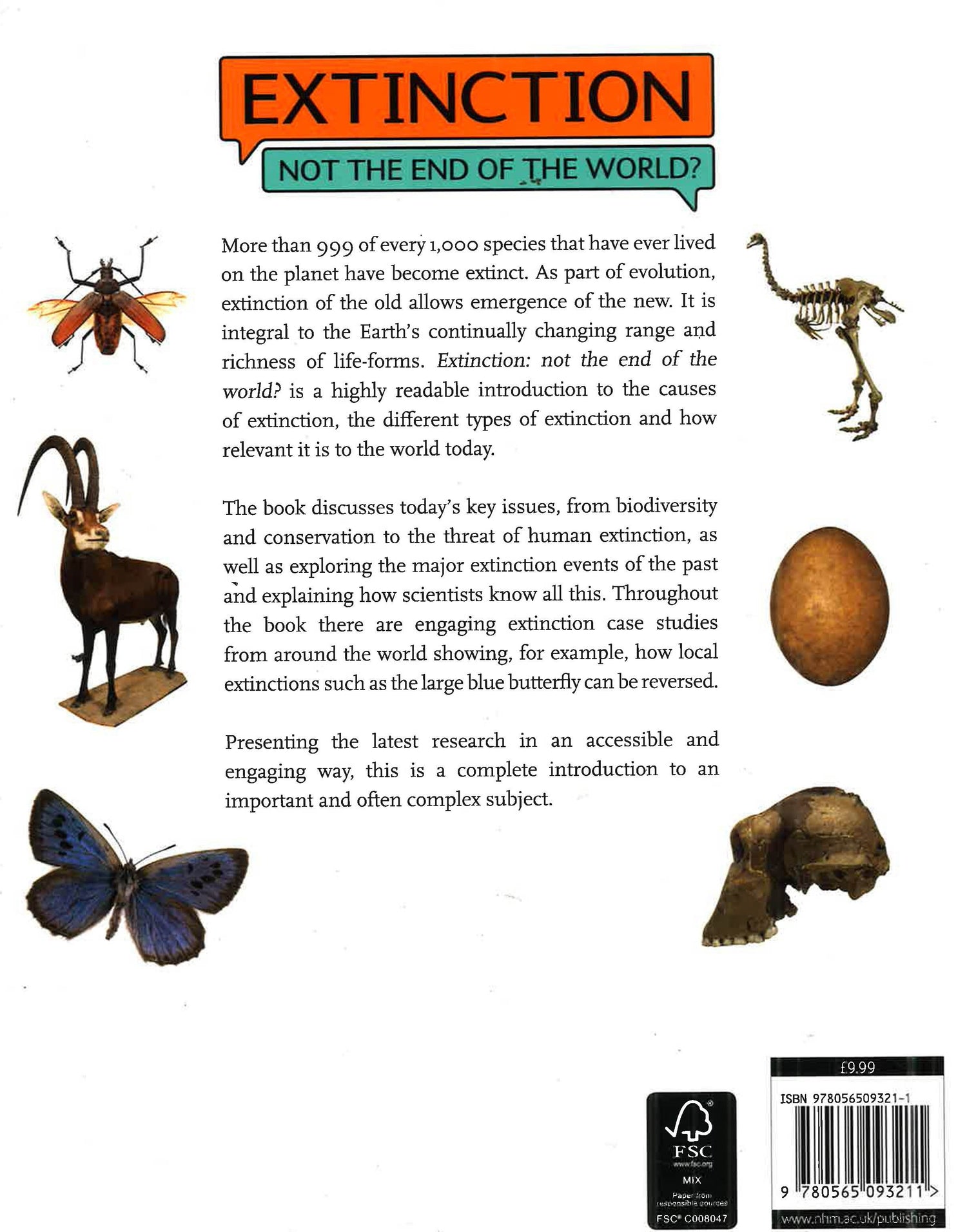 More than 999 of every 1,000 species that have ever lived on the planet have become extinct. As part of evolution, extinction of the old allows emergence of the new. It is integral to the Earth's continually changing range and richness of life-forms. Extinction: not the end of the world? is a highly readable introduction to the causes of extinction, the different types of extinction and how relevant it is to the world today. The book discusses today's key issues, from biodiversity and conservation to the threat of human extinction, as well as exploring the major extinction events of the past and explaining how scientists know all this. Throughout the book there are engaging extinction case studies from around the world showing, for example, how local extinctions such as the large blue butterfly can be reversed. Presenting the latest research in an accessible and engaging way, this is a complete introduction to an important and often complex subject. The book is published to accompany the major new exhibition of the same name which opens at the Natural History Museum, London, in February 2013.