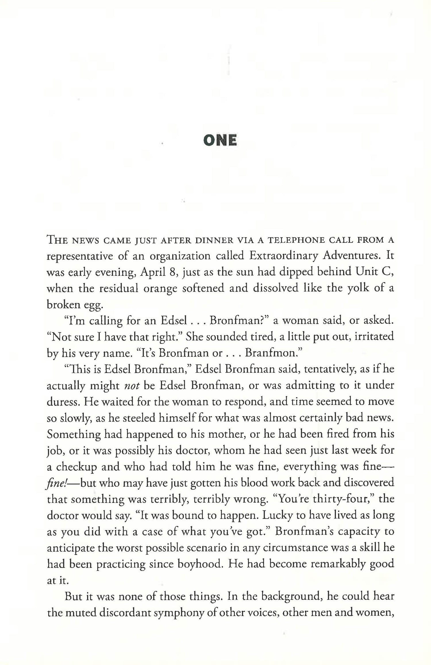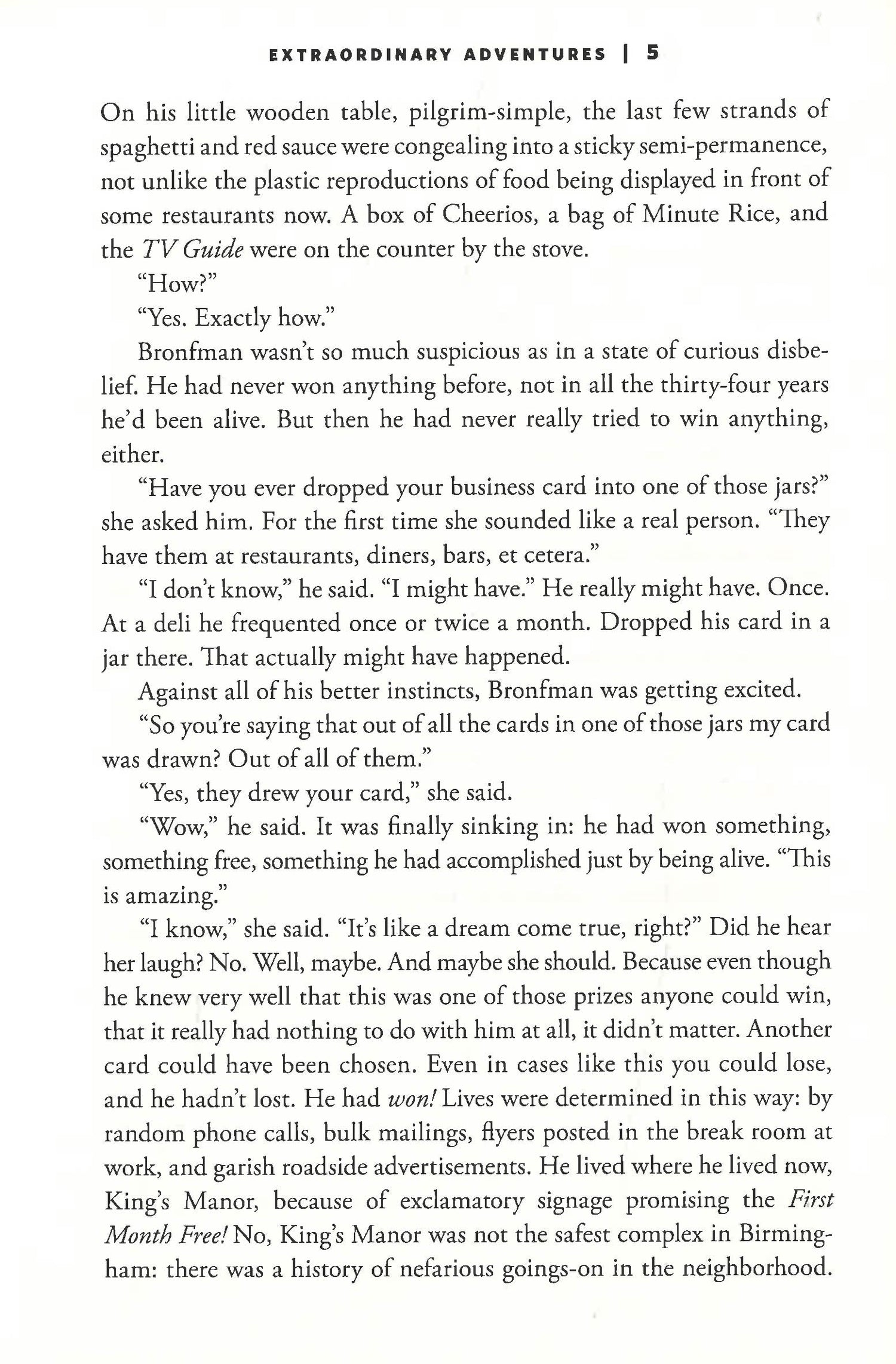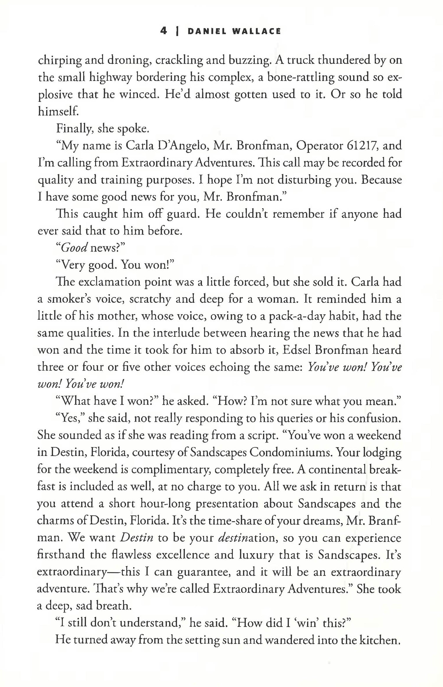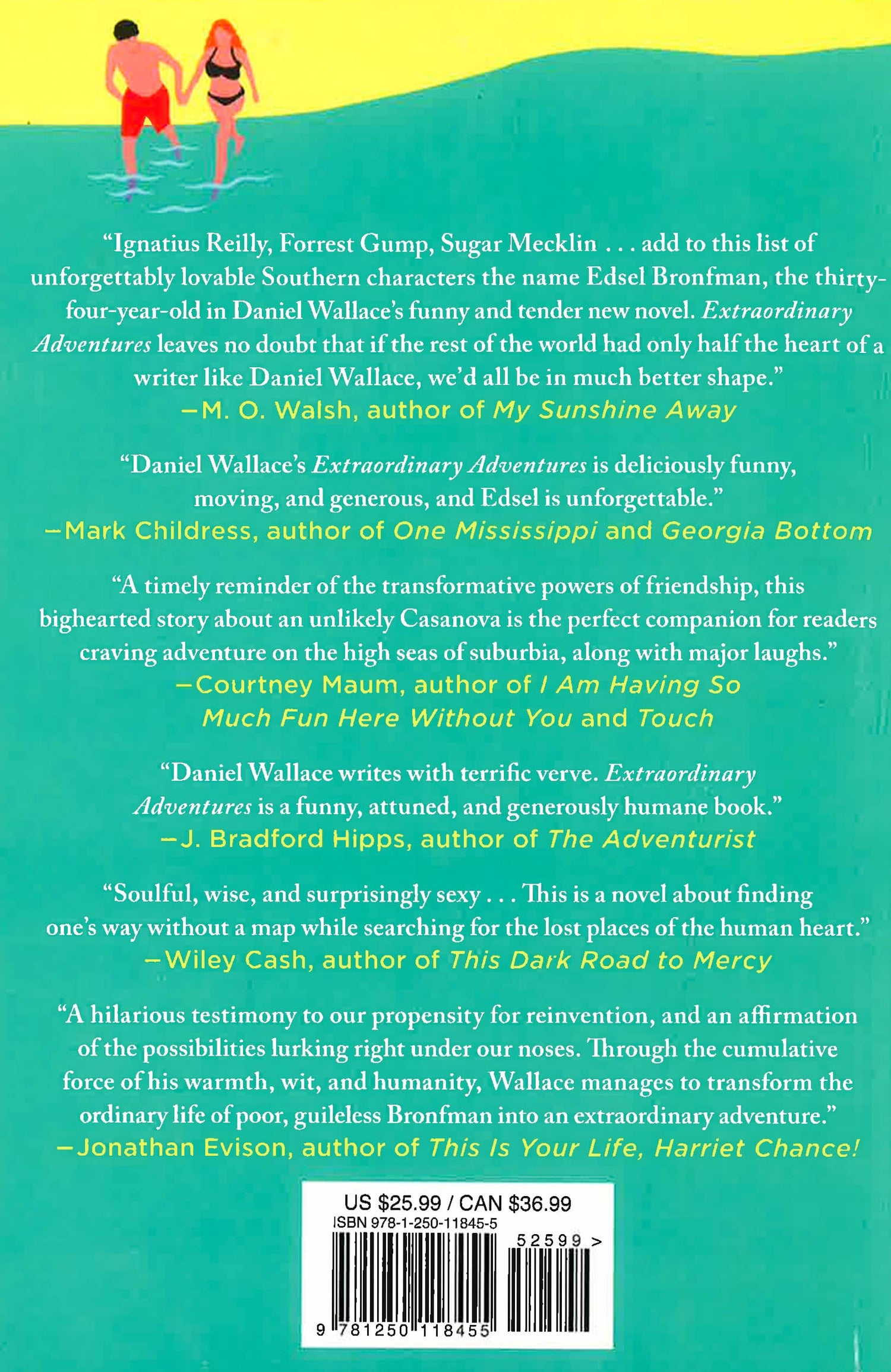 **Wallace named the Harper Lee Award winner for 2019 by the Alabama Writers' Forum** **One of PopSugar's Best 2017 Spring Books for Women** A large-hearted and optimistic novel, Extraordinary Adventures is the latest from the New York Times bestselling Daniel Wallace. Edsel Bronfman works as a junior executive shipping clerk for an importer of Korean flatware. He lives in a seedy neighborhood and spends his free time with his spirited mother. Things happen to other people, and Bronfman knows it. Until, that is, he gets a call from operator 61217 telling him that he's won a free weekend at a beachfront condo in Destin, Florida. But there's a catch: the offer is intended for a couple, and Bronfman has only seventy-nine days to find someone to take with him. The phone call jolts Bronfman into motion, initiating a series of truly extraordinary adventures as he sets out to find a companion for his weekend getaway. Open at last to the possibilities of life, Bronfman now believes that anything can happen. And it does.