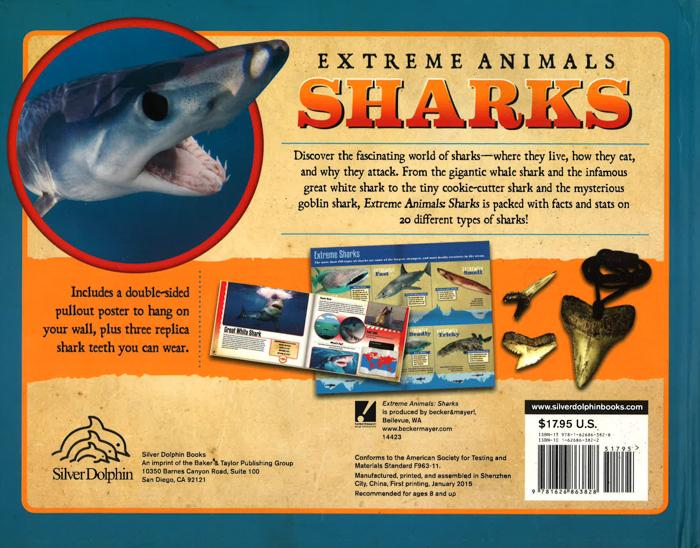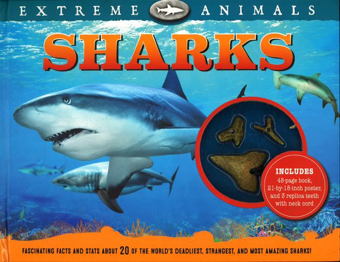Dive beneath the waves--if you dare--to learn about the most extreme sharks that prowl the world's oceans. Venture forth on a journey into the depths of the world's oceans and discover the most extreme sharks that lurk beneath the waves. Extreme Animals: Sharks features 20 fascinating creatures that awe us with their feats of strength, speed, and elusiveness. Detailed facts, statistics, charts, and maps allow the reader to compare and contrast each shark and learn what makes them so extreme. Three replica tooth pendants with a neck cord enable kids to display their favorite beasts after the book is closed, and a double-sided wall poster is the perfect decoration for a budding oceanographer's bedroom.