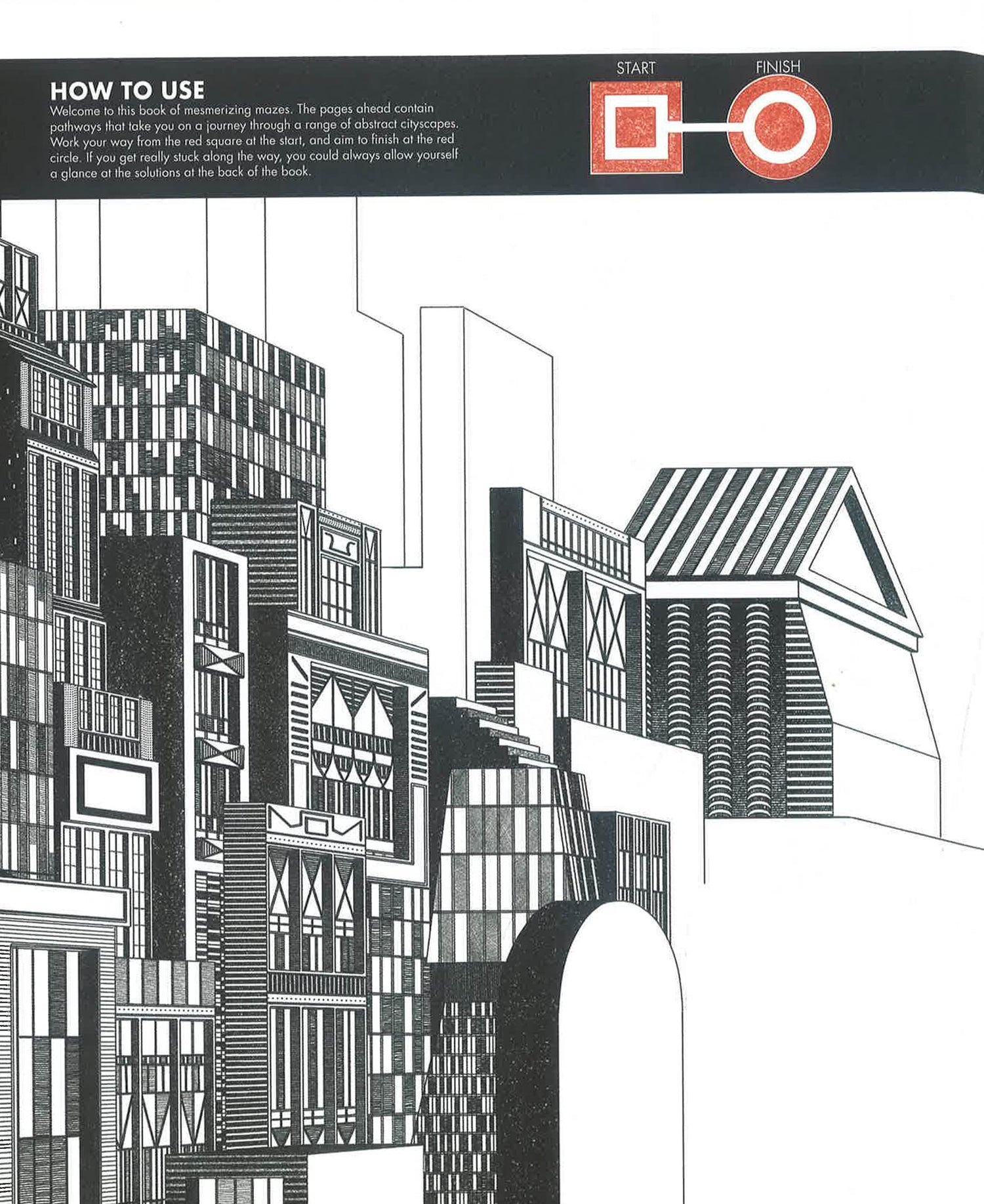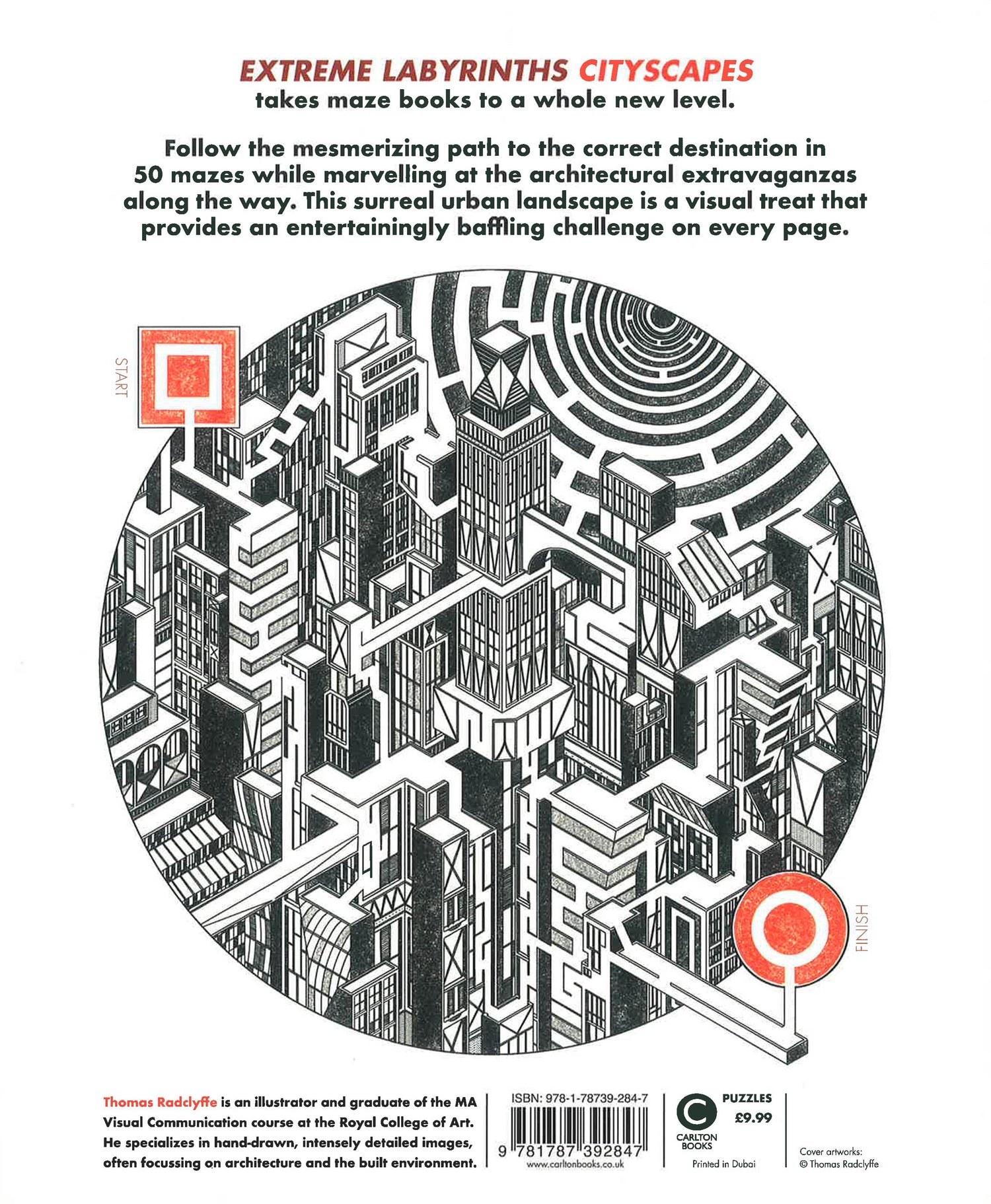Extreme Labyrinths - Cityscapes takes maze books to a new level. Thomas Radclyffe has created 50 mesmerizing mazes all set in a baffling, modern urban landscape. Follow the labyrinthine path to the correct destination while marvelling at the architectural extravaganzas and the unique artwork along the way. Fifty high-quality architectural mazes are included for the reader to find their way through. The illustrations are detailed and complex, providing an artwork to be pored over at the same time as a difficult puzzle challenge.
