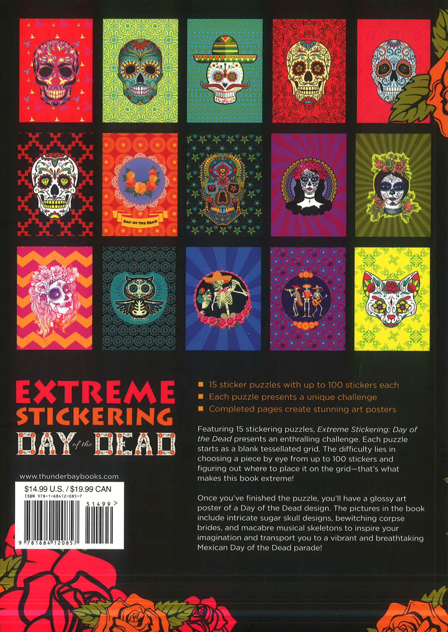 The Day of the Dead is a colorful celebration of loved ones who hold a special place in our hearts. These 15 colorful stickering puzzles will bring hours of enjoyment to those who celebrate the holiday and seek a new way to connect to its rich cultural traditions. Each puzzle consists of a tessellated grid that includes a few clues to get you started, along with up to 100 reusable stickers to complete the design. When the last sticker is placed, you'll have a beautiful glossy art poster that can be framed on the wall. Images include decorative skulls, flower patterns, and other designs associated with the Day of the Dead.