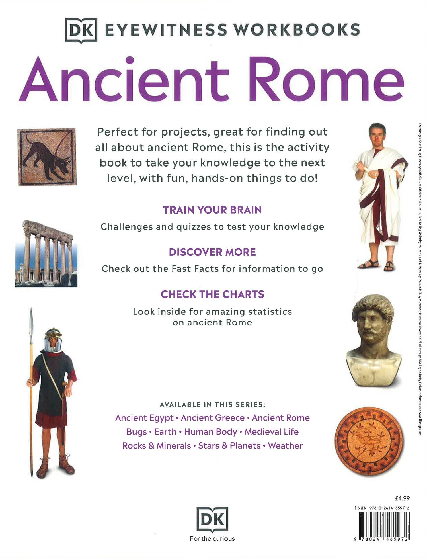 Some subjects are too interesting to be left at school! Carry on your love of history at home with Ancient Rome - an activity-packed exploration of people and places in this early empire. Divided into sections, the book starts with fast facts on topics including the army, religion, emperors, senators, towns, conquests, and architecture; and the book ends with charts of famous structures in Rome and famous rulers. Using this information, you can complete the puzzles in the main part of the book, plus there are hands-on activities such as a Roman recipe, making a Roman toga, and playing the Roman game of knucklebones. Finally, test your new-found knowledge with the quick quizzes (with answers supplied, but no peeking!). You can keep track of your achievements throughout with a star-chart to fill in every time you finish a page.Note to parents: The Eyewitness Project Book series is devised and written with the expert advice of educational and reading consultants and is designed to appeal to children aged 8 years and up. First published in 2007-2009, this series has been fully revised and updated for 2020.