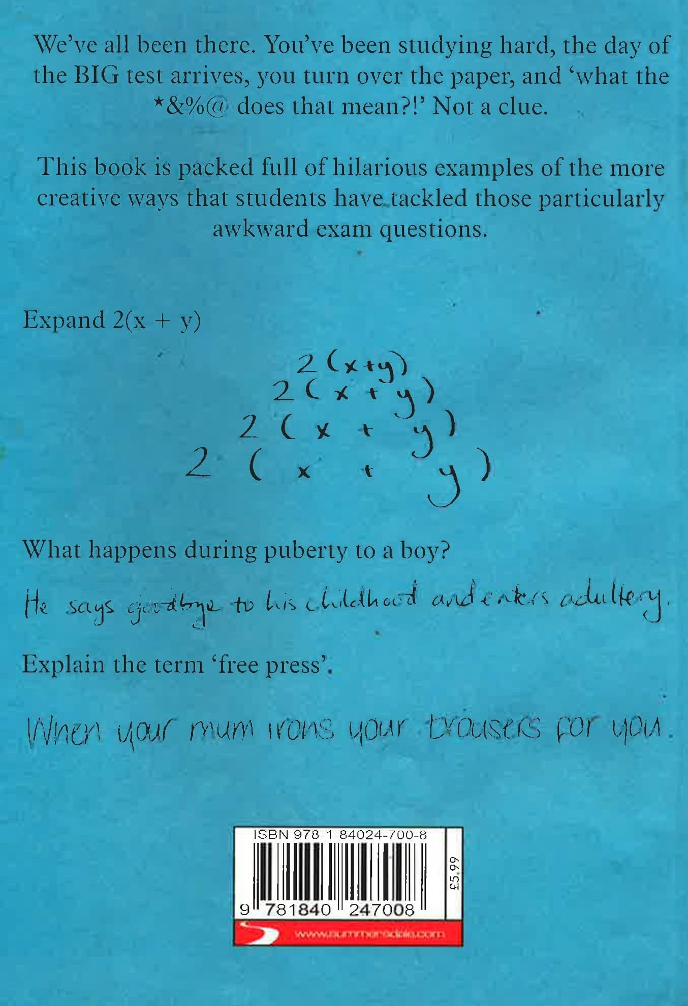 Q: What happens to a boy when he reaches puberty? A: He says goodbye to childhood and enters adultery. Q: How can you prevent milk turning sour? A: Keep it in the cow. We've all been there. You've been studying hard, the day of the BIG test arrives, you turn over the paper, and `what the *&%@ does that mean?!' Not a clue. Some students, rather than admit defeat, choose to adopt a more creative approach to answering those particularly awkward exam questions. Packed full of hilarious examples, this book will bring a smile to the face of teachers, parents and students alike - and anyone who's ever had to sit a test.