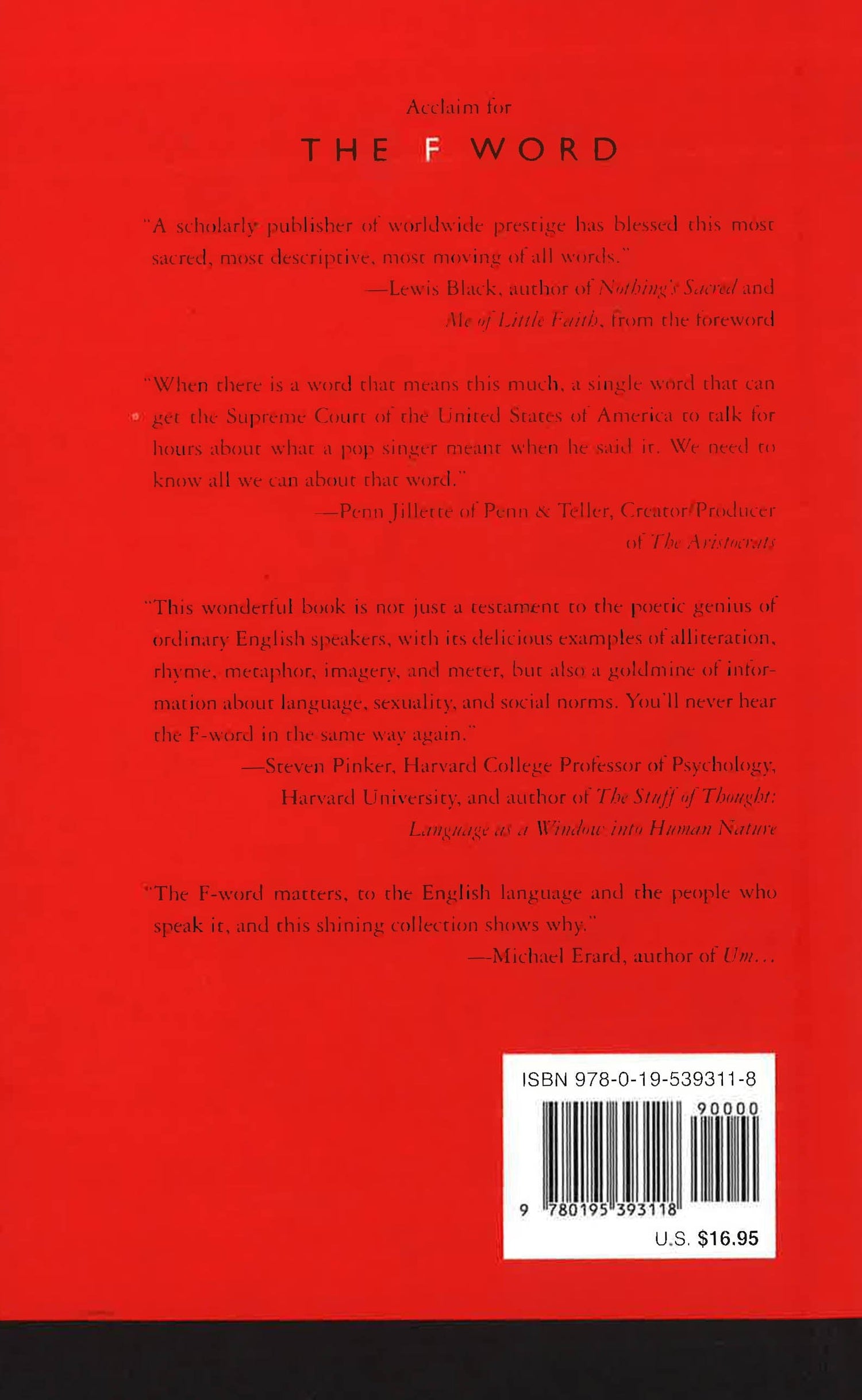 Collectively, these references and the more than one hundred new entries they illustrate double the size of The F-Word since its previous edition. Thousands of added quotations come from newly available electronic databases and the resources of the OED, expanding the range of quotations to cover British, Canadian, Australian, New Zealand, Irish, and South African uses in addition to American ones. Thus we learn why a fugly must hone his or her sense of humor, why Canadian Prime Minister Pierre Trudeau muttered "fuddle duddle" in the Commons, and why Fanny Adams is so sweet. A fascinating introductory essay explores the word's history, reputation, and changing popularity over time. and a new Foreword by comedian, actor, and author Lewis Black offers readers a smart and entertaining take on the book and its subject matter. Oxford dictionaries have won renown for their expansive, historical approach to words and their etymologies. The F-Word offers all that and more in an entertaining and informative look at a word that, while now largely accepted as an integral part of the English language, still confounds, provokes, and scandalizes.