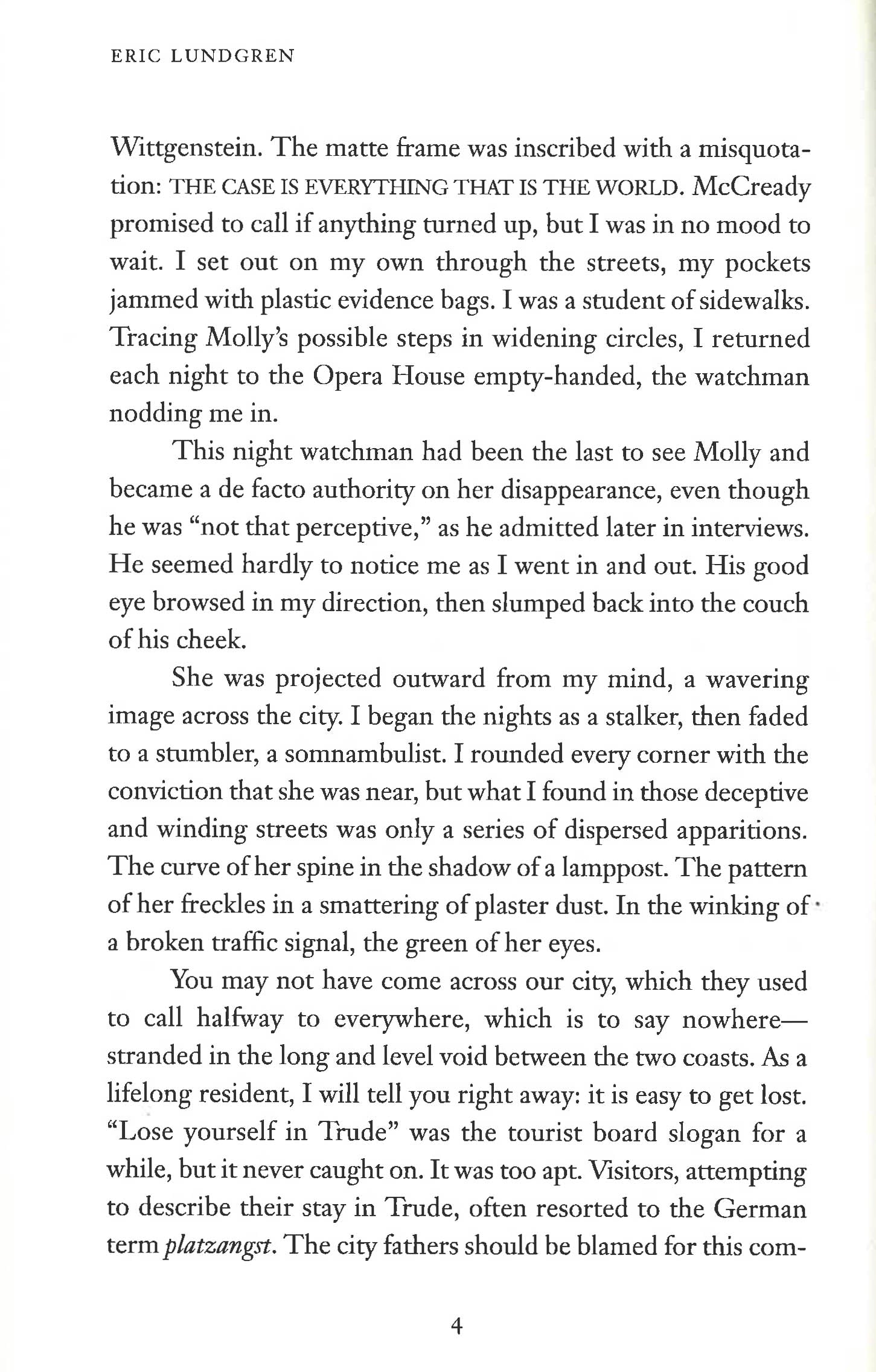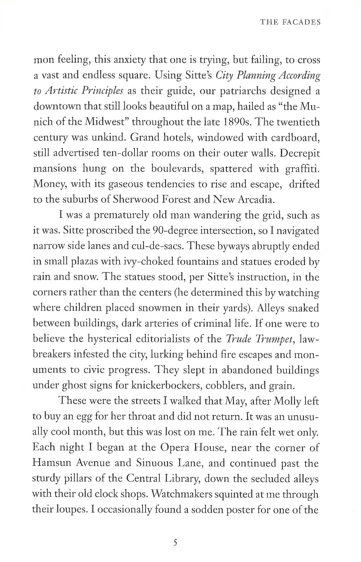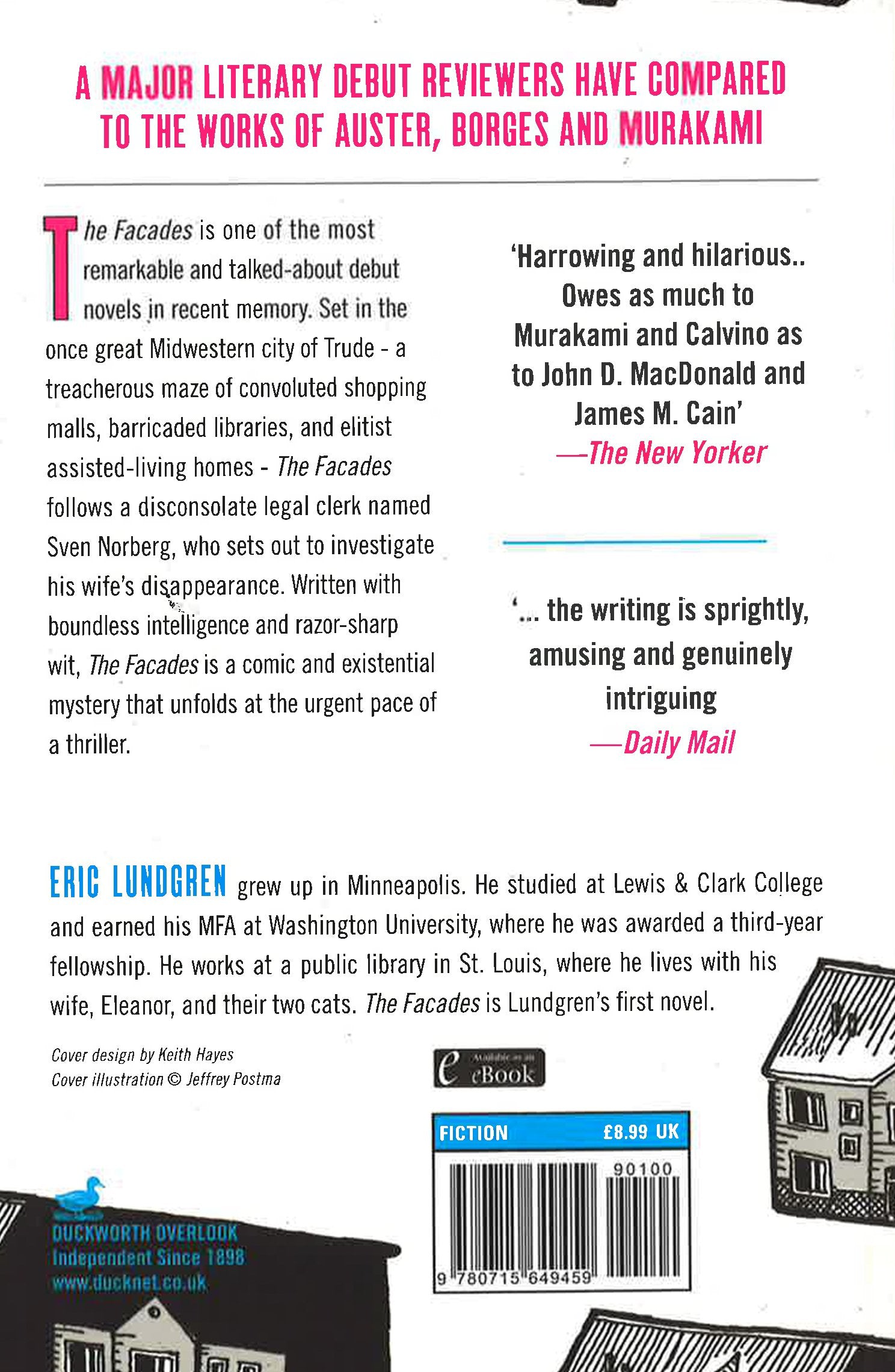 The Facades is one of the most remarkable and talked-about debut novels in recent memory. Set in the once-great Midwestern city of Trude a treacherous maze of convoluted shopping malls, barricaded libraries and elitist assisted-living homes Eric Lundgren s novel follows a disconsolate legal clerk named Sven Norberg, who sets out to investigate the disappearance of his wife, the city s most celebrated mezzo-soprano. To track her down, he must descend into Trude s underworld and confront the menacing and bizarre citizens of his hometown. rebellious librarians, shifty music critics and the minister of an apocalyptic church who has recruited Norberg s teenage son. Written with boundless intelligence and razor-sharp wit, The Facades is a comic and existential mystery that unfolds at the urgent pace of a thriller.