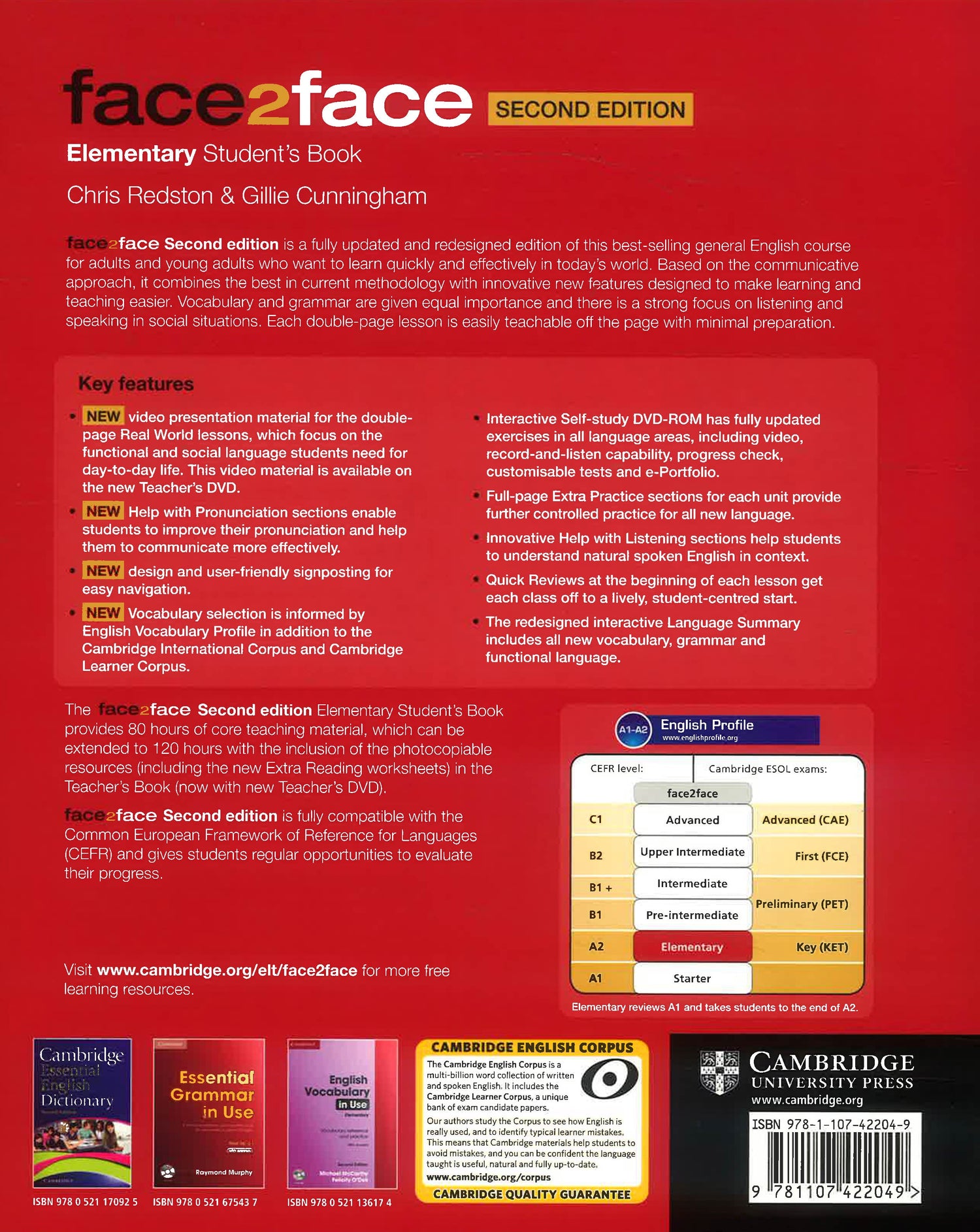 face2face is the flexible, easy-to-teach General English course that helps adults and young adults to speak and listen with confidence. face2face is informed by Cambridge English Corpus and its vocabulary syllabus has been mapped to the English Vocabulary Profile, meaning students learn the language they really need at each CEFR level. The course improves students' listening skills by drawing their attention to the elements of spoken English that are difficult to understand. The free DVD-ROM in the Student's Book includes consolidation activities and electronic portfolio for learners to track their progress with customisable tests and grammar and vocabulary reference sections.