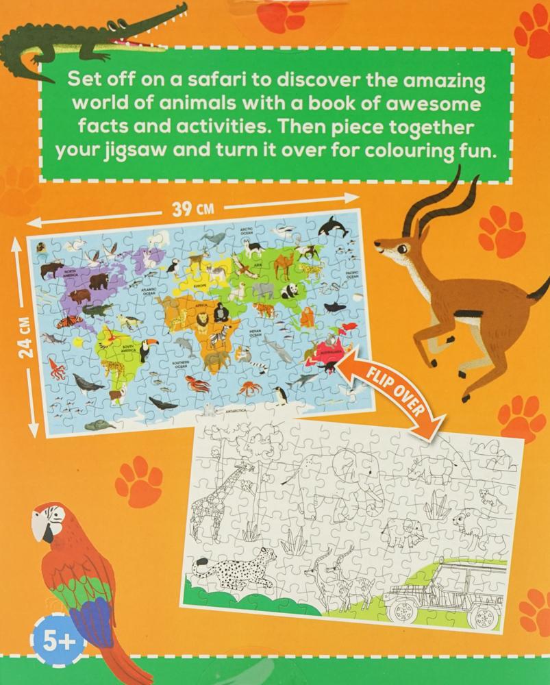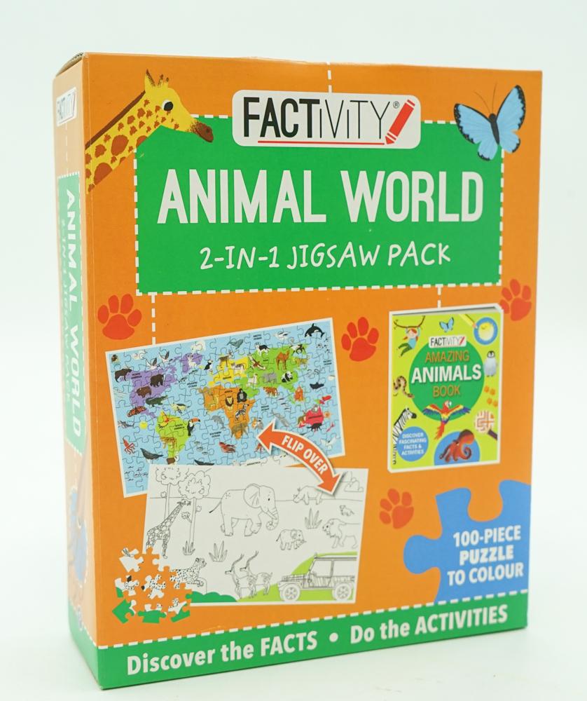 Set off on a safari to discover the amazing world of animals with awesome facts and activities in the Factivity Animal World 2-in-1 Jigsaw Pack! Complete the puzzles, mazes and more as you learn amazing animal facts in the book. Then put together your 100-piece jigsaw puzzle to discover a map showcasing animals of the world and turn it over to colour in the safari scene.