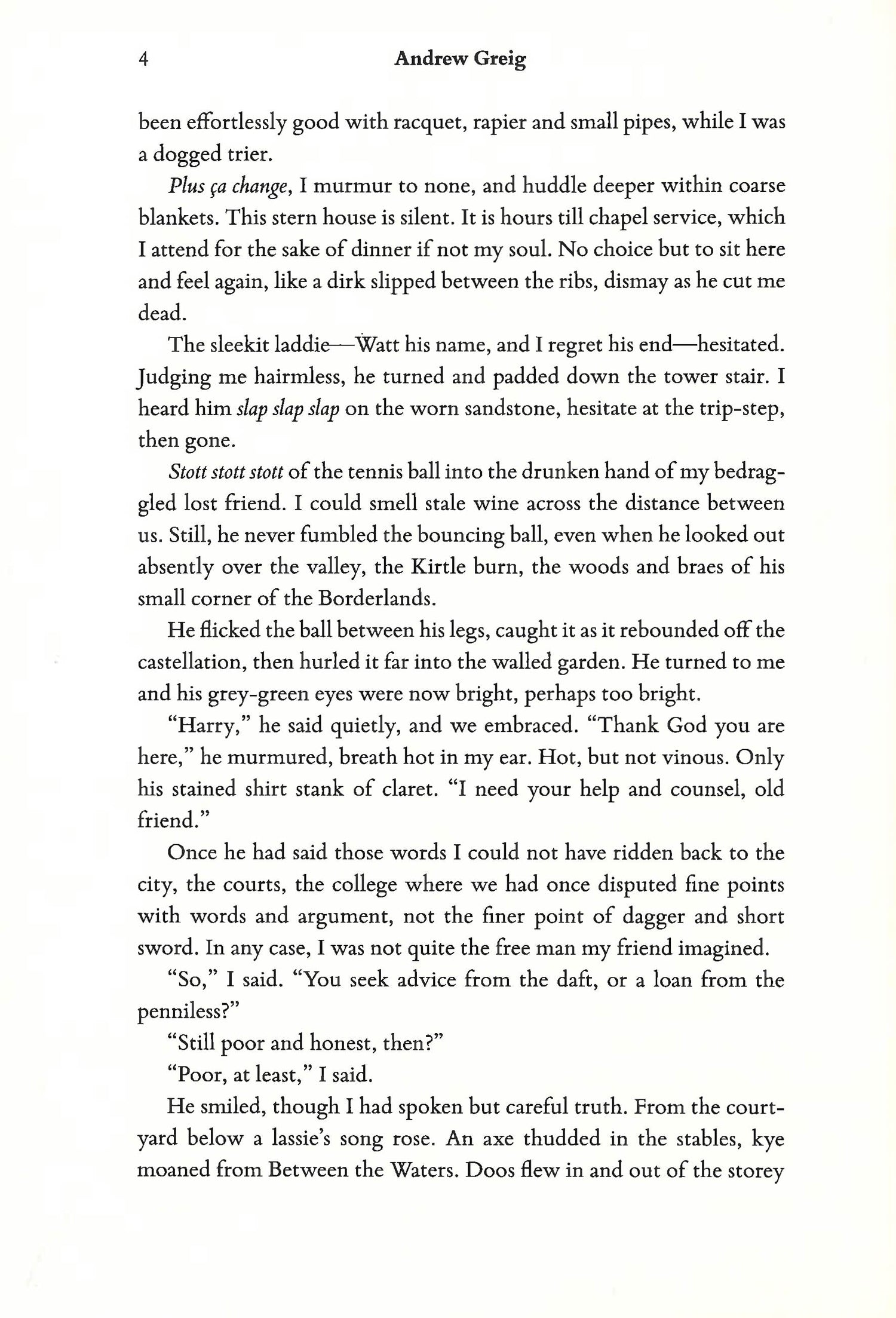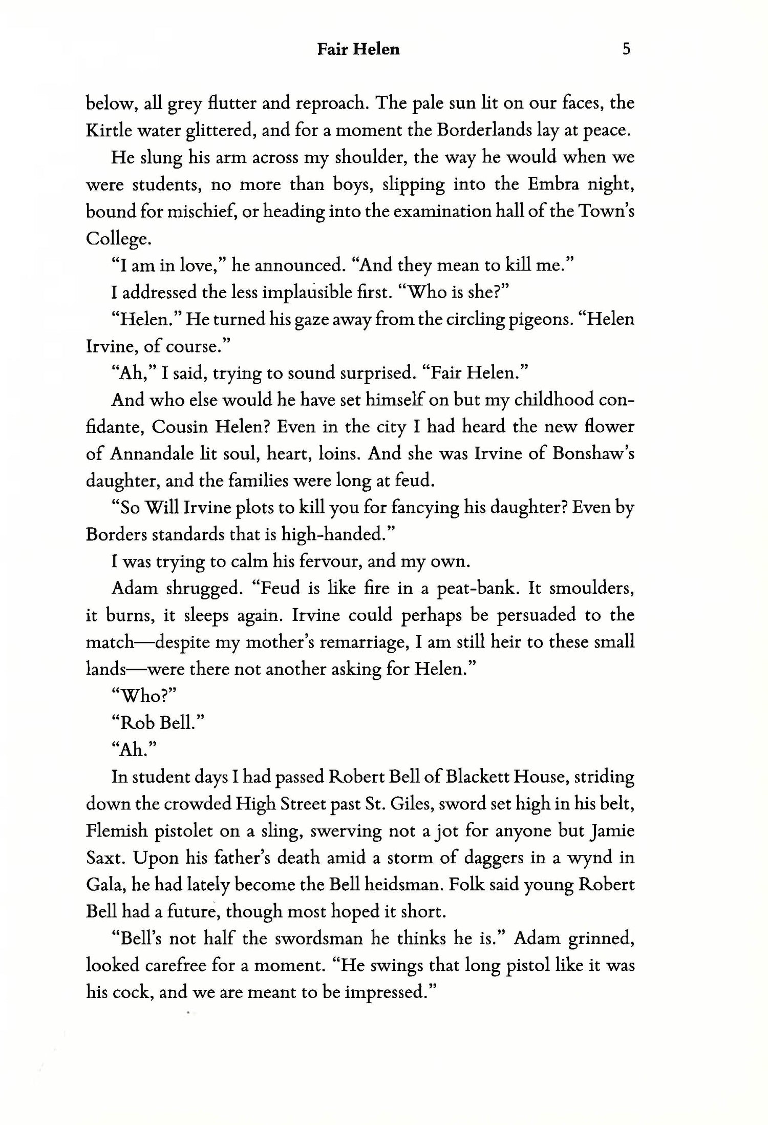Elderly narrator Harry Langton looks back on the adventures and friends of his youth, transporting the reader to the Scottish Borderlands at the end of the 16th century... The much younger Langton returns to his birthplace to aid an old friend, the brash Adam Fleming, who has fallen for legendary beauty Helen of Annandale. He has also, it seems, fallen foul of a rival for her hand, Robert Bell, a man as violent as he is influential. Fleming confesses to Langton that he fears for his life. In a land where minor lairds vie for power and blood feuds are settled by the sword, Fleming faces a battle to win Helen's hand. By virtue of being the lovers' confidant, Langton is thrust into the middle of this dangerous triangle, and discovers Helen is not so chaste as she is fair. But Langton has his own secrets to keep--and other powers to serve. Someone has noticed Langton's connections to the major players in the Border disputes, and has recruited him in their bid to control the hierarchy of the Border families--someone who would use the lovers as pawns in a game of war.