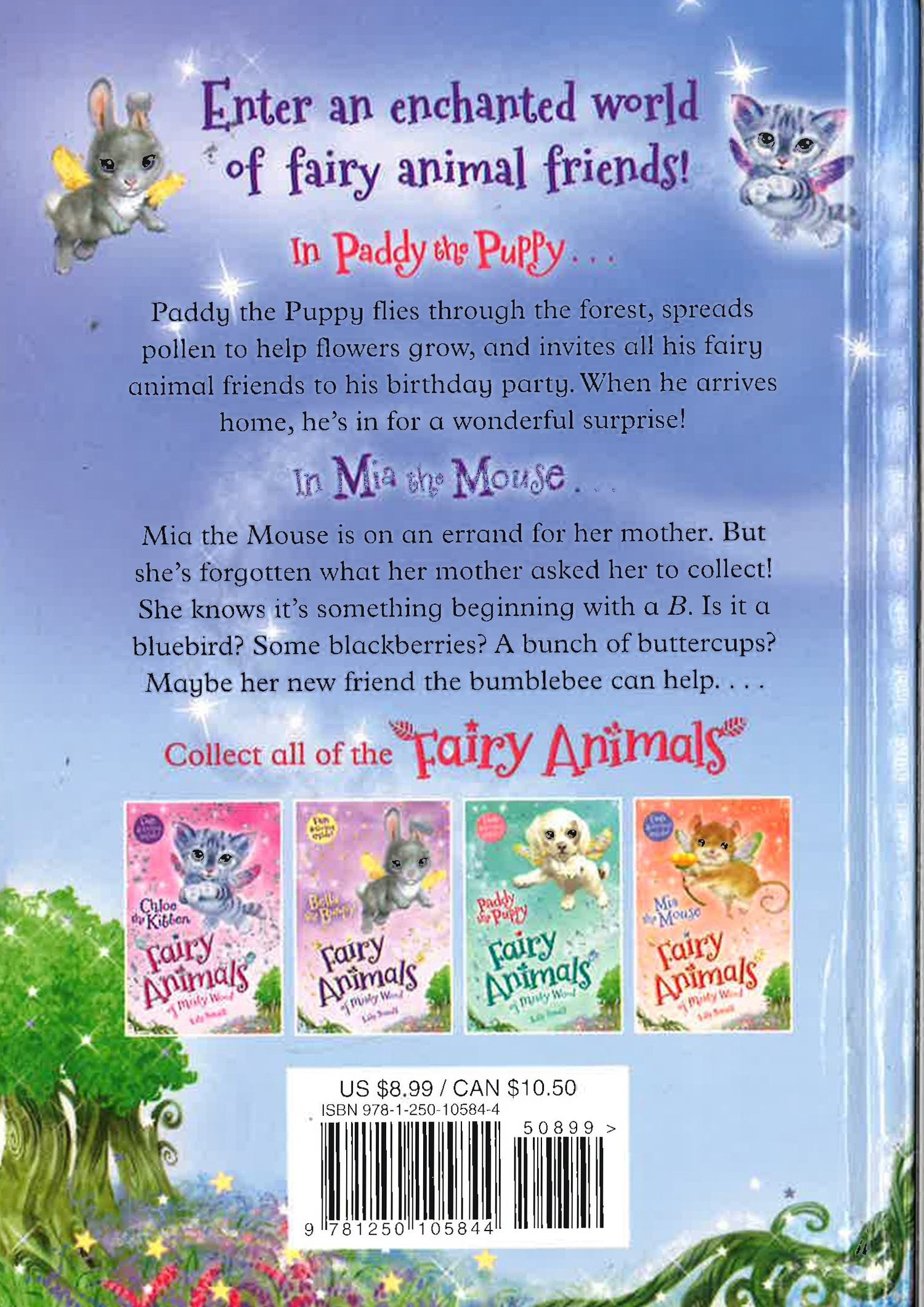 Paddy the Puppy flies through the forest, spreads pollen to help flowers grow, and invites all his fairy animal friends to his birthday party. When he arrives home, he's in for a wonderful surprise! Mia the Mouse is on an errand for her mother. But she's forgotten what her mother asked her to collect! She knows it's something beginning with a B. Is it a bluebird? Some blackberries? A bunch of buttercups? Maybe her new friend the bumblebee can help. *This book may have reminder mark*