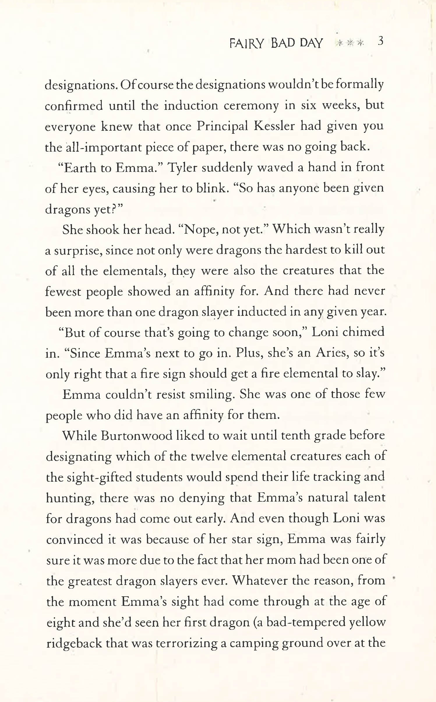 While most students at Burtonwood Academy get to kill demons and goblins, fifteen-year-old Emma gets to rid the world of little annoying fairies with glittery wings and a hipster fashion sense. She was destined to be a dragon slayer, but cute and charming Curtis stole her spot. Then she sees a giant killer fairyNand it's invisible to everyone but her! If Emma has any chance of stopping this evil fairy, she's going to need help. Unfortunately, the only person who can help is Curtis. And now, not only has he stolen her dragon-slayer spot, but maybe her heart as well! Why does she think it's going to be a fairy bad day?