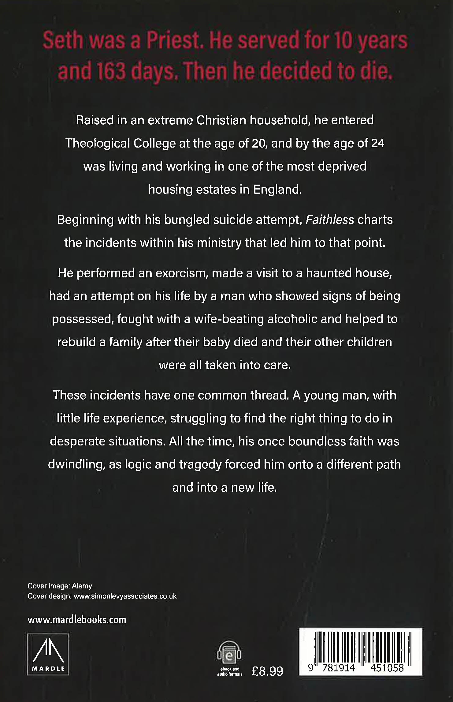 Raised in an extreme Christian household, Seth entered Theological College at the age of 20, and by the age of 24 was living and working in one of the most deprived housing estates in England. He served a a priest for 10 years before attempting suicide. “Have you ever questioned whether you are doing the right thing?” Beginning with his bungled suicide attempt, Faithless charts the incidents within his ministry that led him to that point. He met a cult leader, fought with a wife beating alcoholic, performed an exorcism, made a visit to a haunted house, had an attempt on his life by a man who showed signs of being possessed and helped to rebuild a family after their baby died and their other children were taken into care. These incidents have one common thread. A young man, with little life experience struggling to find the right thing to do in some of the most desperate situations. All the time, his once boundless faith was dwindling, as logic and tragedy forced him to take a different path.