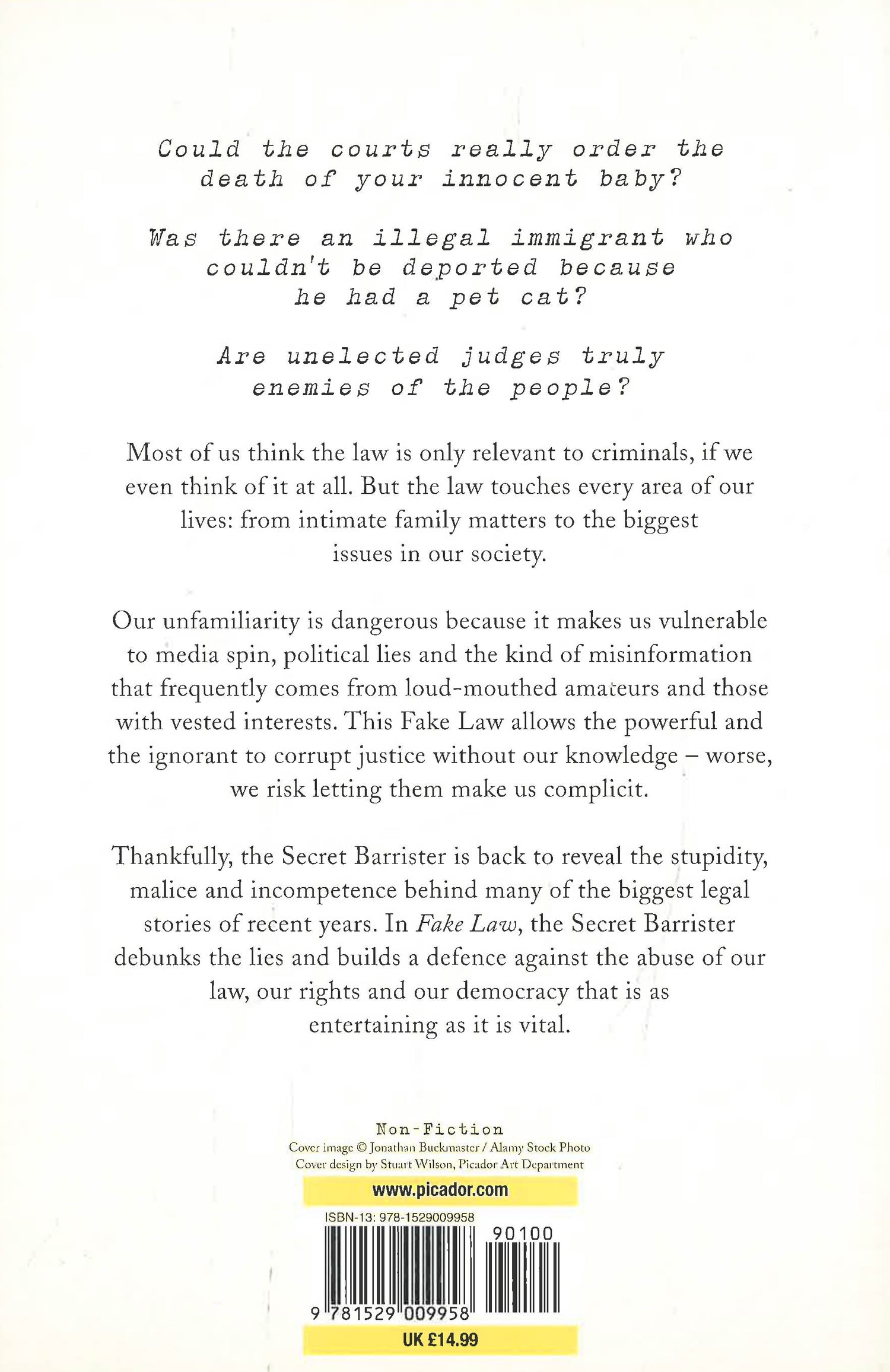 Thankfully, the Secret Barrister is back to reveal the stupidity, malice and incompetence behind many of the biggest legal stories of recent years. In Fake Law, the Secret Barrister debunks the lies and builds a defence against the abuse of our law, our rights and our democracy that is as entertaining as it is vital.