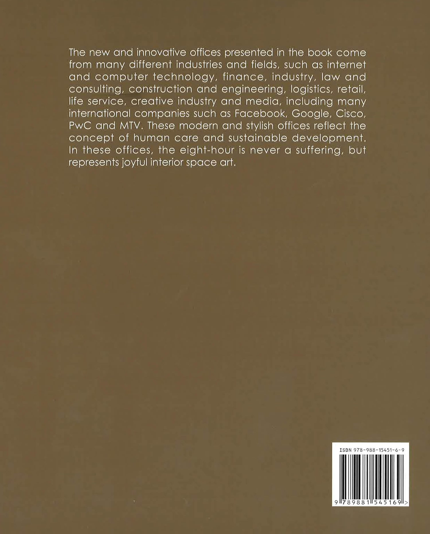 The new and innovative offices that presents In this book come from many different industries and fields, such as internet and computer technology, financial and capital, industry, law and consulting, construction and engineering, logistics, retail, life service, creative industry and media, including many internationalised company such as Facebook, Google, Cisco, PwC, MTV, etc. These modern and stylish offices reflect the concept of human care and sustainable development. In these offices, the eight-hour is never a suffering, but represents joyful interior space art.