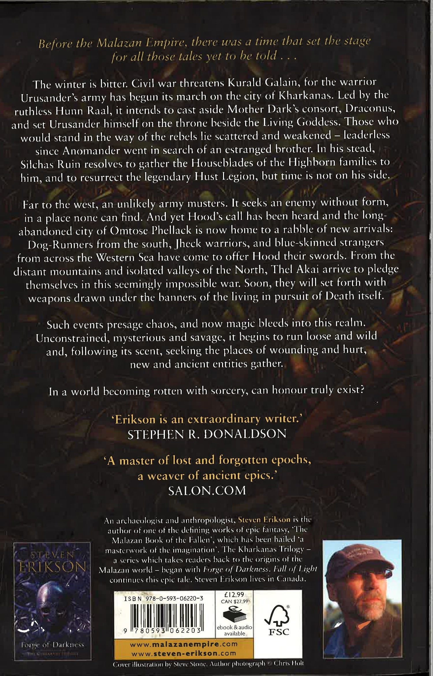 Before the Malazan Empire, there was a time that set the stage for all those tales yet to be told ...The winter is bitter. Civil war threatens Kurald Galain for the warrior Urusander's army has begun its march on the city of Kharkanas. Led by the ruthless Hunn Raal, it intends to cast aside Mother Dark's consort, Draconus, and set Urusander himself on the throne beside the Living Goddess. Those who would stand in the way of the rebels lie scattered and weakened - leaderless since Anomander went in search of an estranged brother. In his stead, Silchas Ruin resolves to gather the Houseblades of the Highborn families to him, and to resurrect the legendary Hust Legion, but time is not on his side. Far to the west, an unlikely army musters. It seeks an enemy without form, in a place none can find. And yet Hood's call has been heard and the long-abandoned city of Omtose Phellack is now home to a rabble of new arrivals: Dog-Runners from the south, Jheck warriors, and blue-skinned strangers from across the Western Sea have come to offer Hood their swords. From the distant mountains and isolated valleys of the North, Thel Akai arrive to pledge themselves in this seemingly impossible war. Soon, they will set forth with weapons drawn under the banners of the living in pursuit of Death itself. Such events presage chaos, and now magic bleeds into this realm. Unconstrained, mysterious and savage, it begins to run loose and wild and following its scent, seeking the places of wounding and hurt - new and ancient entities gather. In a world becoming rotten with sorcery, can honour truly exist?