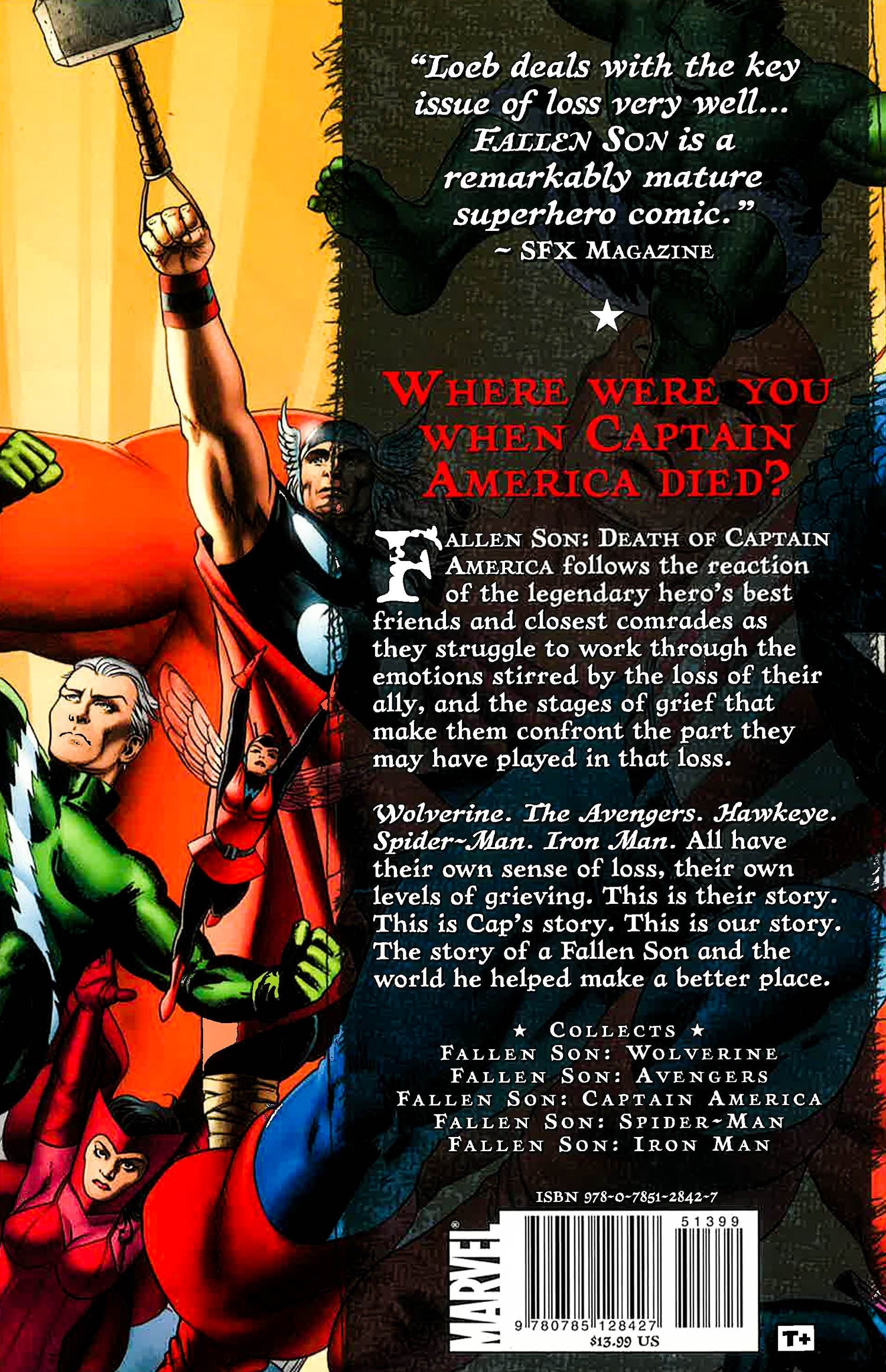 The death of Captain America hits the Marvel Universe - hard! Be there as superstar Jeph Loeb teams with the industry's top artists on a story that will have everyone talking, navigating the turbulent post-Civil War landscape! Can the world accept the death of a true hero? In the wake of a tragedy, we visit the top heroes of the Marvel Universe. How do people with amazing powers face a force that no one can fight? Is more violence coming? Featuring Wolverine, the Mighty Avengers, the New Avengers, Spider-Man and Iron Man! Collects Fallen Son- The Death of Captain America: Wolverine, Avengers, Captain America, Spider-Man, Iron Man