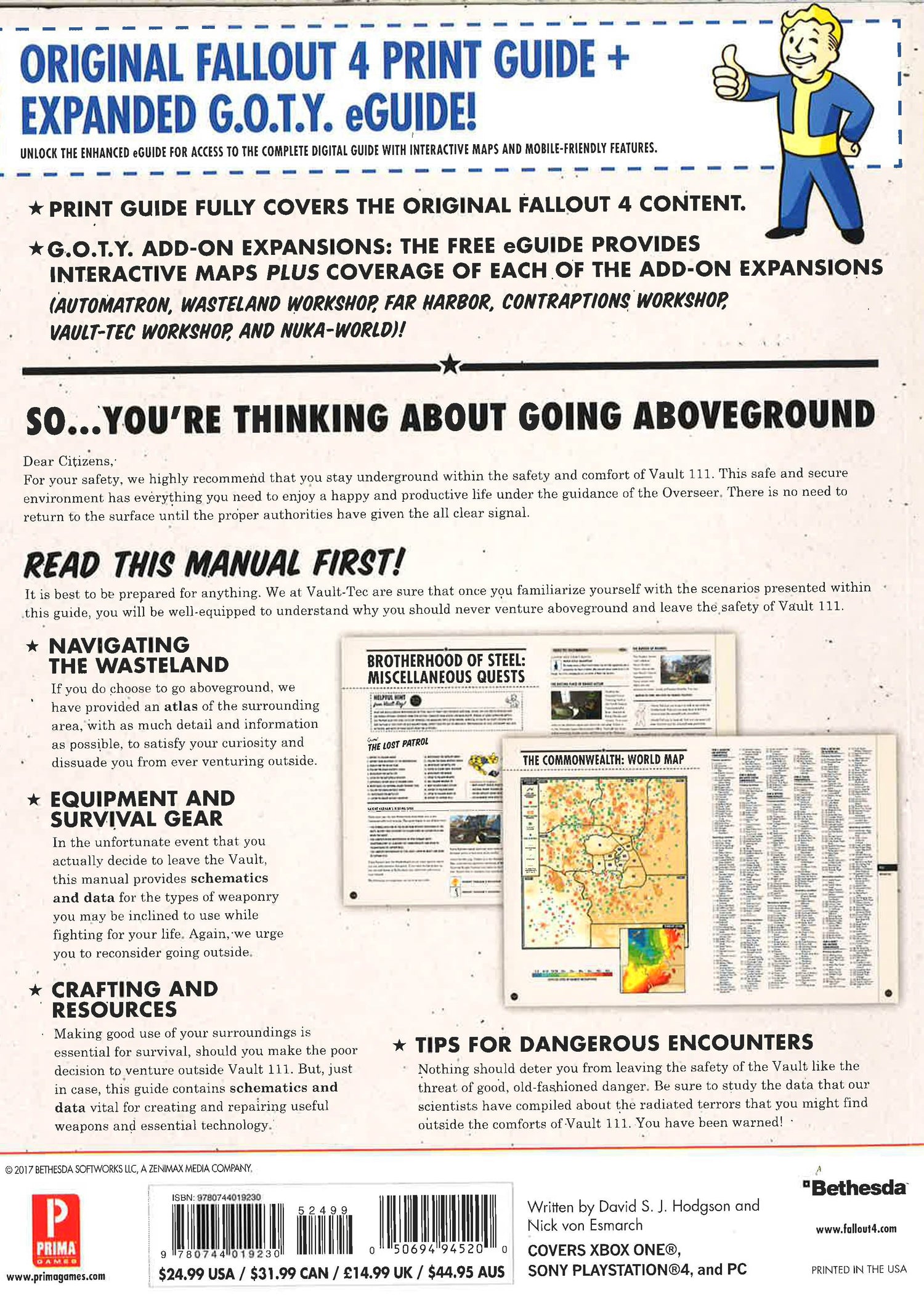 ORIGINAL FALLOUT 4 PRINT GUIDE + EXPANDED G.O.T.Y. eGUIDE!Print Guide: Full coverage of the original Fallout 4 content.G.O.T.Y. DLC Expansions: The free eGuide provides interactive maps plus coverage of each of the DLC expansions—Automatron, Wasteland Workshop, Far Harbor, Contraptions Workshop, Vault-Tec Workshop, and Nuka-World!NAVIGATING THE WASTELAND: If you do choose to go aboveground, we have provided an atlas of the surrounding area, with as much detail and information as possible, to satisfy your curiosity and dissuade you from ever venturing outside.EQUIPMENT AND SURVIVAL GEAR: In the unfortunate event that you actually decide to leave the Vault, this manual provides schematics and data for the types of weaponry you may be inclined to use while fighting for your life. Again, we urge you to reconsider going outside.CRAFTING AND RESOURCES: Making good use of your surroundings is essential for survival, should you make the poor decision to venture outside Vault 111. But, just in case, this guide contains schematics and data vital for creating and repairing useful weapons and essential technology.TIPS FOR DANGEROUS ENCOUNTERS: Nothing should deter you from leaving the safety of the Vault like the threat of good, old-fashioned danger. Be sure to study the data that our scientists have compiled about the radiated terrors that you might find outside the comforts of Vault 111. You have been warned!Free Mobile-Friendly eGuide: Includes a code to access the eGuide, a web-access version of the complete guide optimized for a second-screen experience.