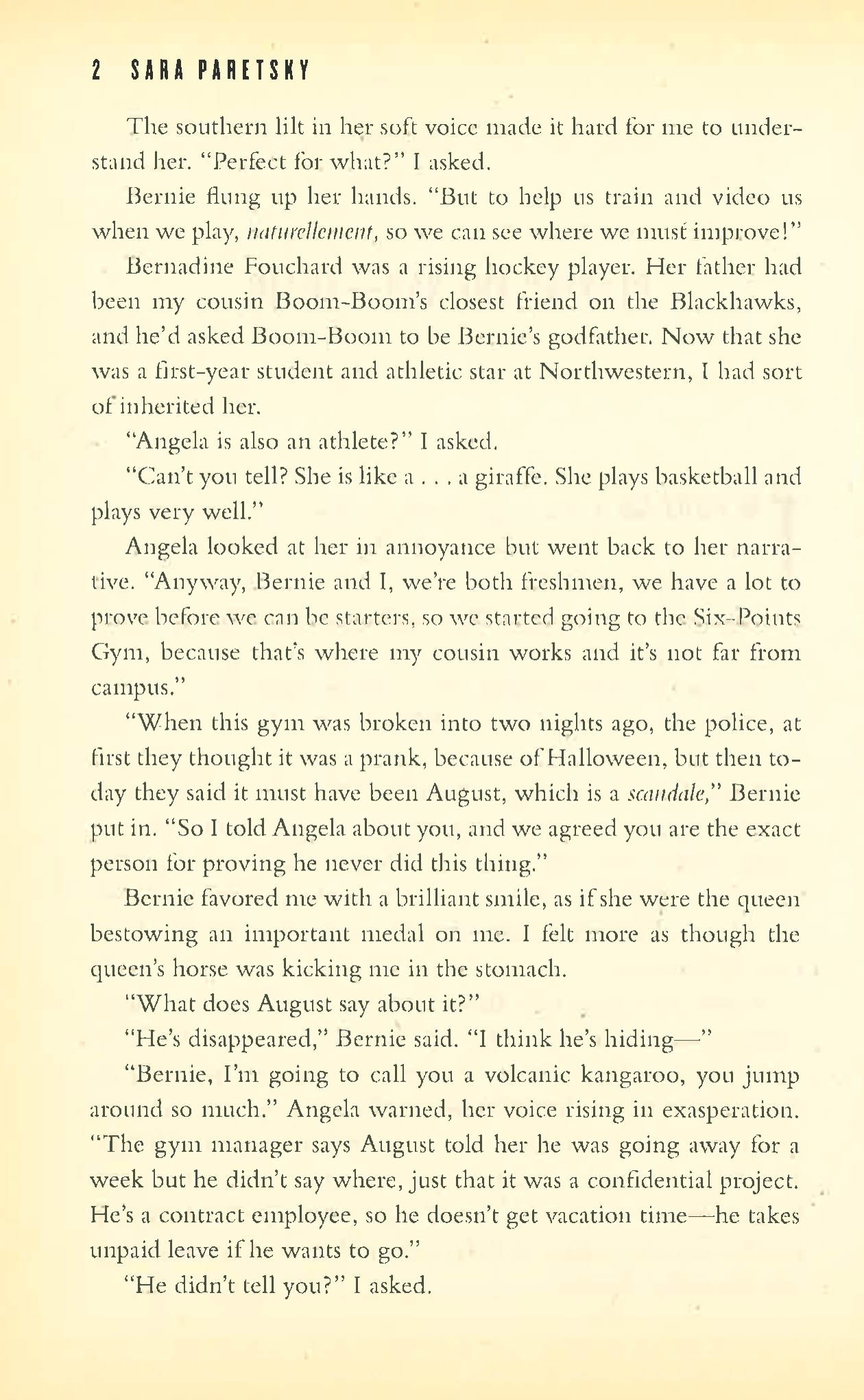 V.I. Warshawski's impossible god-daughter Bernie convinces her to look for August, a young film-maker who has disappeared. The evidence indicates that he has gone to Kansas in the company of Emerald, an older black movie actress who wants to film the story of her life. Her search takes V.I. from the military base Emerald was born on, to the farm where she grew up outside a university town, ploughing up past and present-day secrets as she goes.