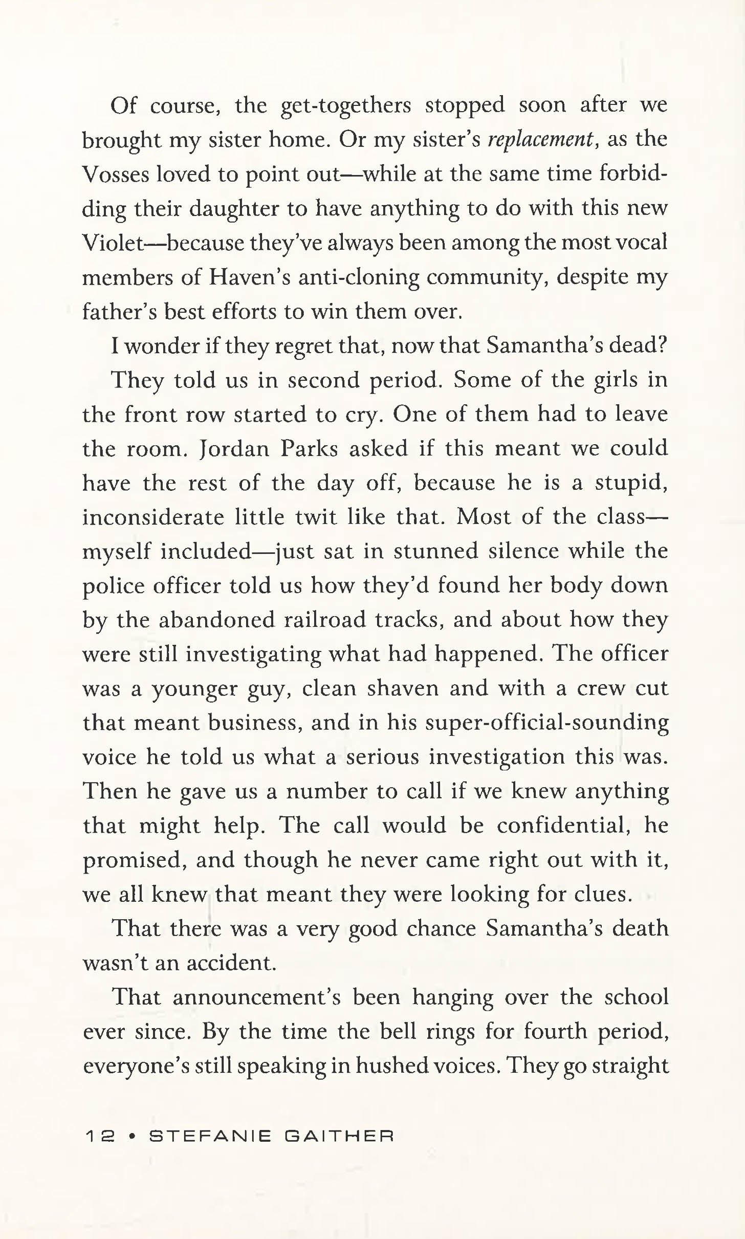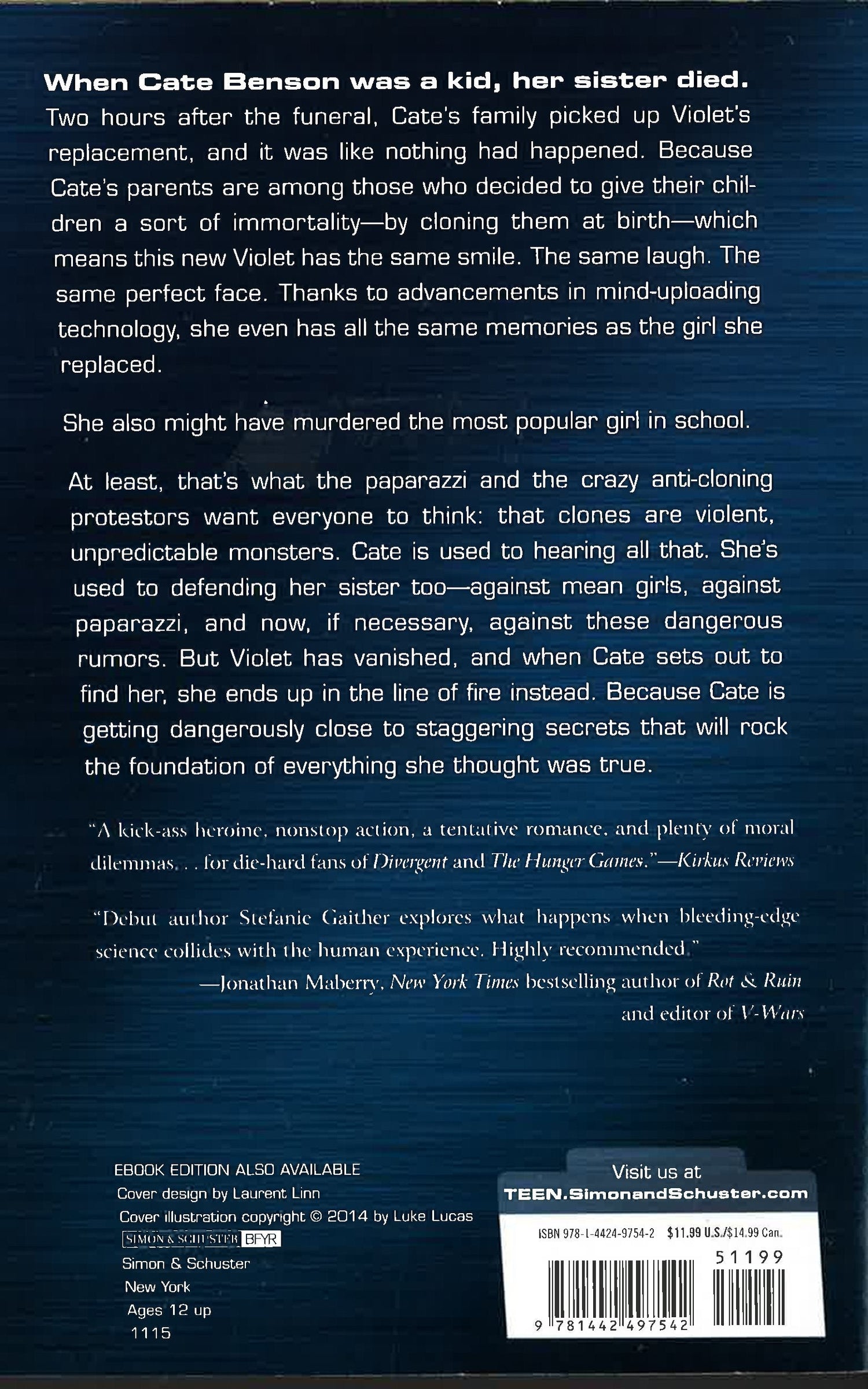 Cate's sister may be a clone, but that doesn't make her a killer. Does it? Murder, morality, and a slow-burning romance fill the pages of this futuristic thriller "for die-hard fans of Divergent and The Hunger Games" (Kirkus Reviews). When Cate Benson was a kid, her sister, Violet, died. Two hours after the funeral, Cate's family picked up Violet's replacement like nothing had happened. Because Cate's parents are among those who decided to give their children a sort of immortality by cloning them at birth--which means this new Violet has the same face. The same perfect smile. She even has all of the same memories as the girl she replaced. She also might have murdered the most popular girl in school. At least, that's what the paparazzi and the anti-cloning protestors want everyone to think: that clones are violent, unpredictable monsters. Cate is used to hearing all that. She's used to defending her sister, too. But Violet has vanished, and when Cate sets out to find her, she ends up in the line of fire instead. Because Cate is getting dangerously close to secrets that will rock the foundation of everything she thought was true.