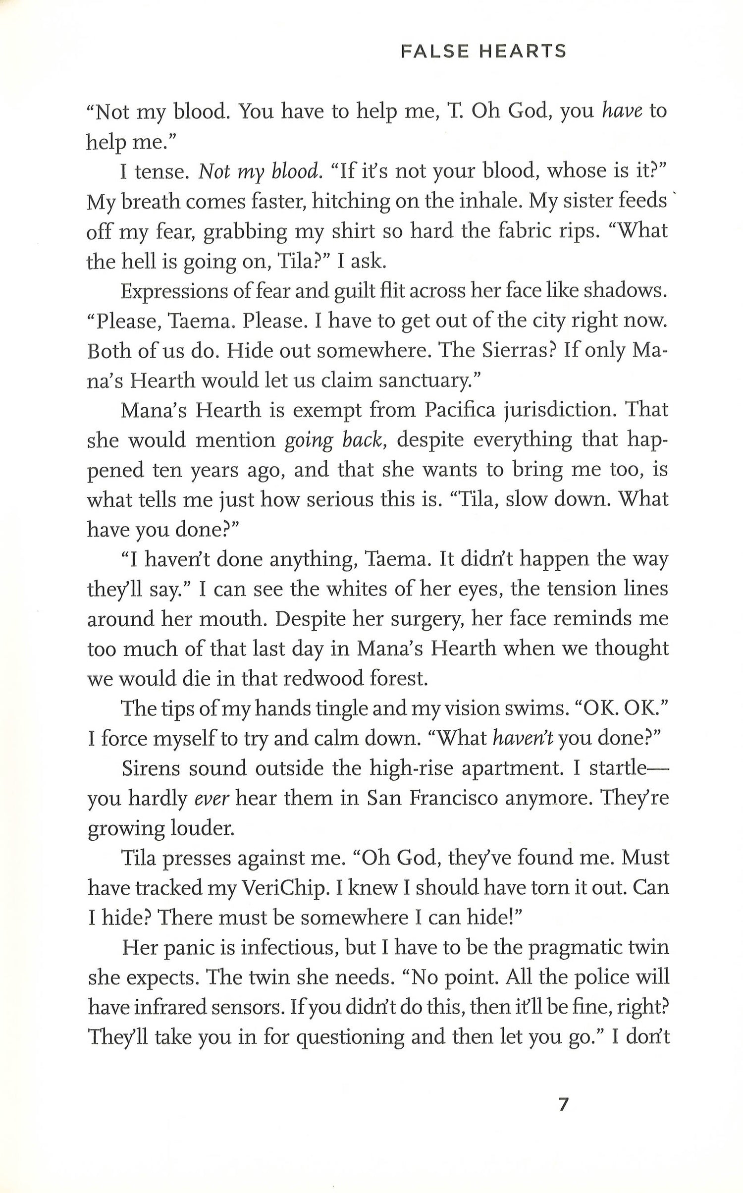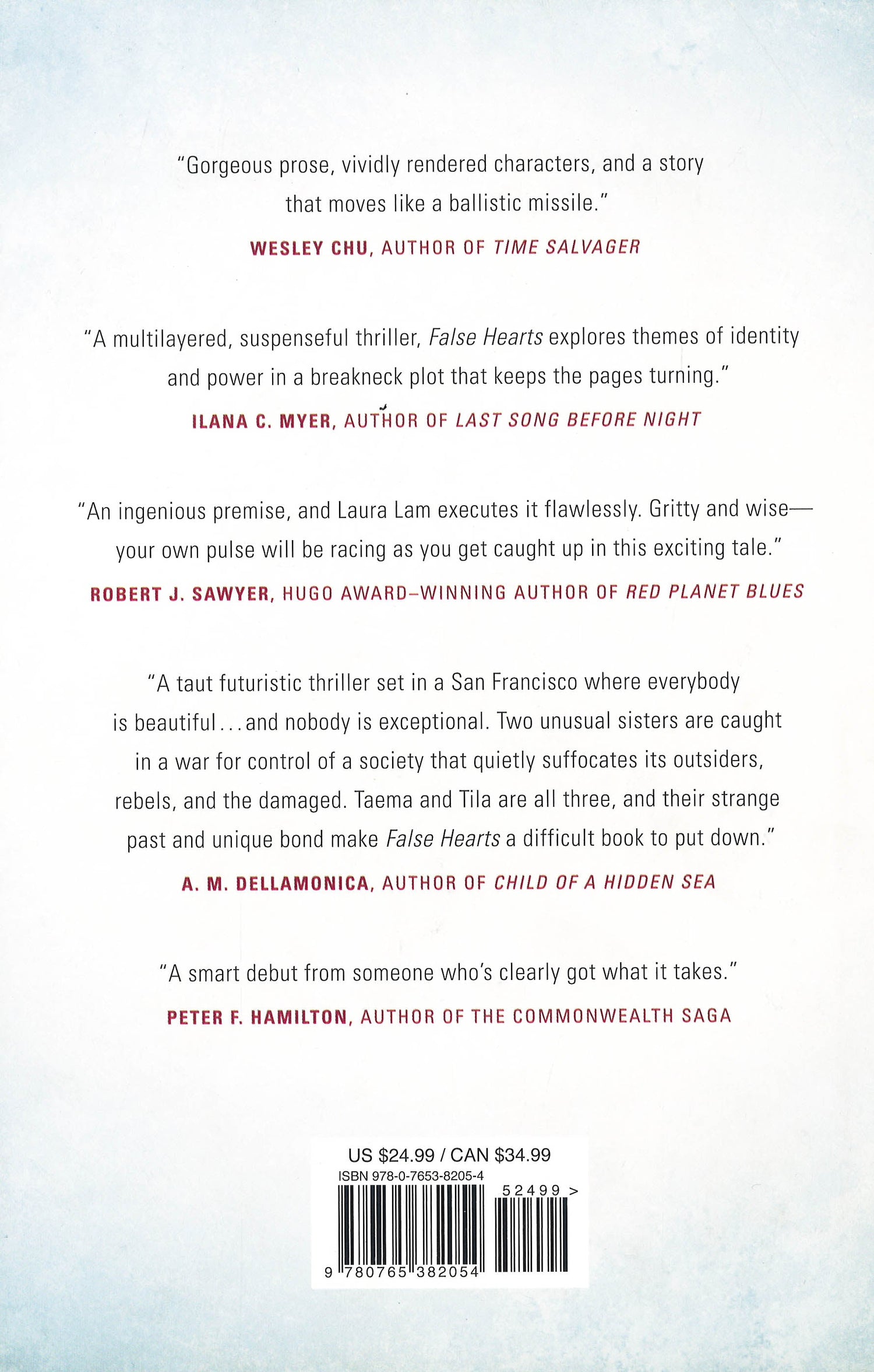 Laura Lam's adult sci-fi debut False Hearts Two formerly conjoined sisters are ensnared in a murderous plot involving psychoactive drugs, shared dreaming, organized crime, and a sinister cult.Raised in the closed cult of Mana's Hearth and denied access to modern technology, conjoined sisters Taema and Tila dream of a life beyond the walls of the compound. When the heart they share begins to fail, the twins escape to San Francisco, where they are surgically separated and given new artificial hearts. From then on they pursue lives beyond anything they could have previously imagined.Ten years later, Tila returns one night to the twins' home in the city, terrified and covered in blood, just before the police arrive and arrest her for murder--the first homicide by a civilian in decades. Tila is suspected of involvement with the Ratel, a powerful crime syndicate that deals in the flow of Verve, a drug that allows violent minds to enact their darkest desires in a terrifying dreamscape. Taema is given a proposition: go undercover as her sister and perhaps save her twin's life. But during her investigation Taema discovers disturbing links between the twins' past and their present. Once unable to keep anything from each other, the sisters now discover the true cost of secrets.