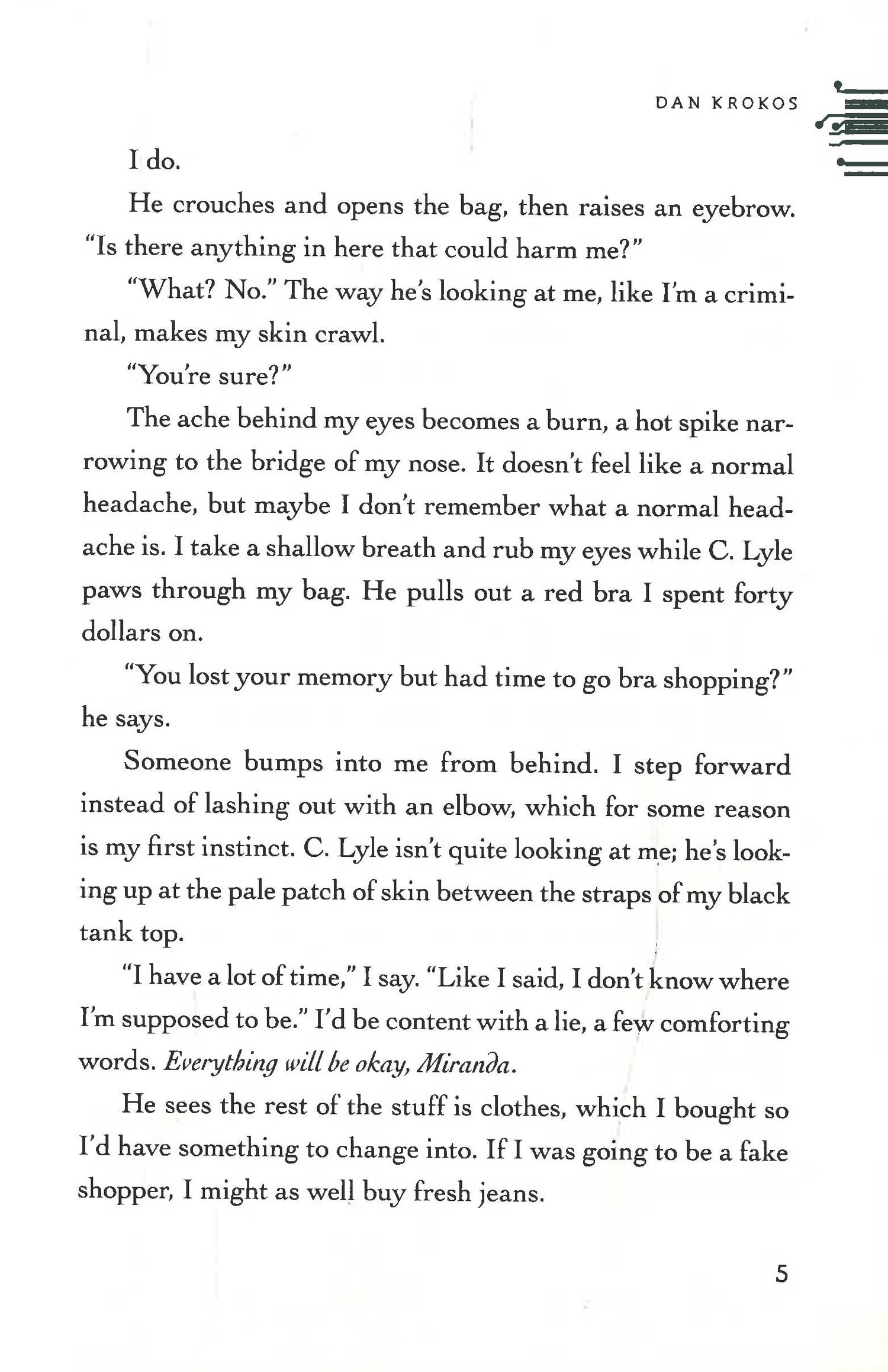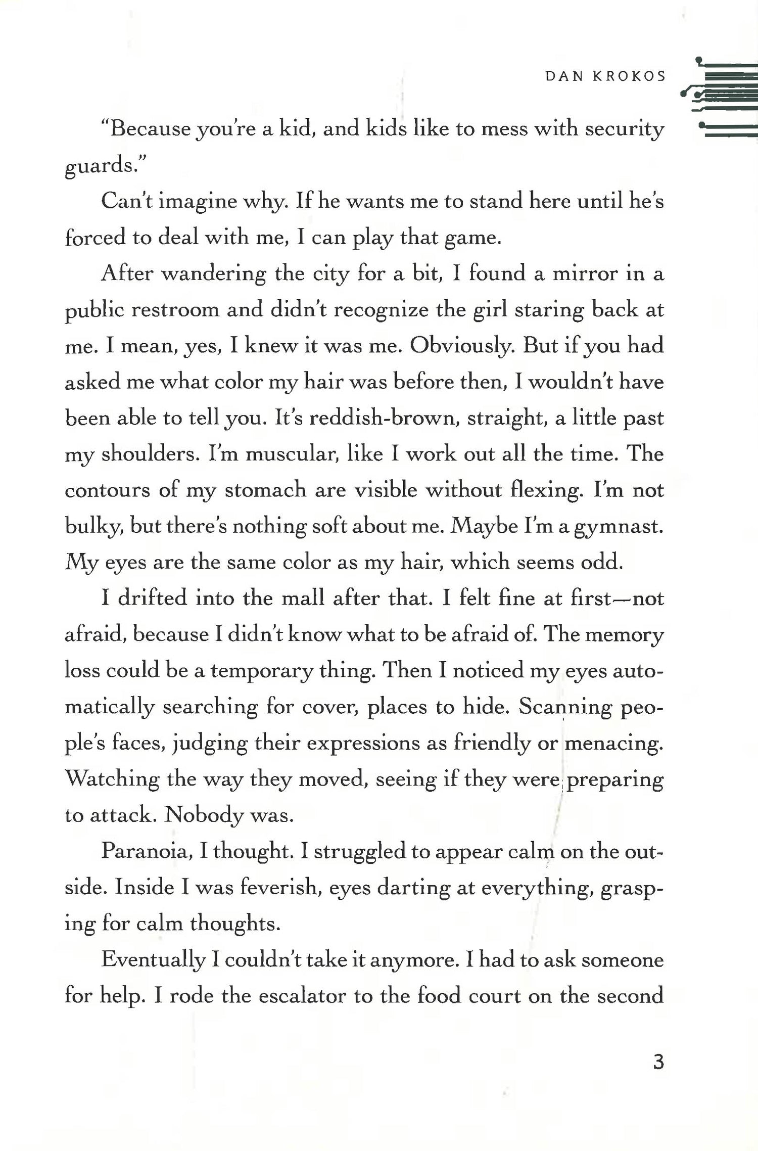 Miranda wakes up alone on a park bench with no memory. In her panic, she releases a mysterious energy that incites pure terror in everyone around her. Except Peter, a boy who isnt at all surprised by Mirandas shocking ability. Left with no choice but to trust this stranger, Miranda discovers she was trained to be a weapon and is part of an elite force of genetically-altered teens who possess flawless combat skills and powers strong enough to destroy a city. But adjusting to her old life isnt easy—especially with Noah, the boyfriend she can't remember loving. Then Miranda uncovers a dark truth that sets her team on the run. Suddenly her past doesnt seem to matter...when there may not be a future. Dan Krokos' debut is a tour-de-force of non-stop action that will leave readers begging for the next book in this bold and powerful new series.