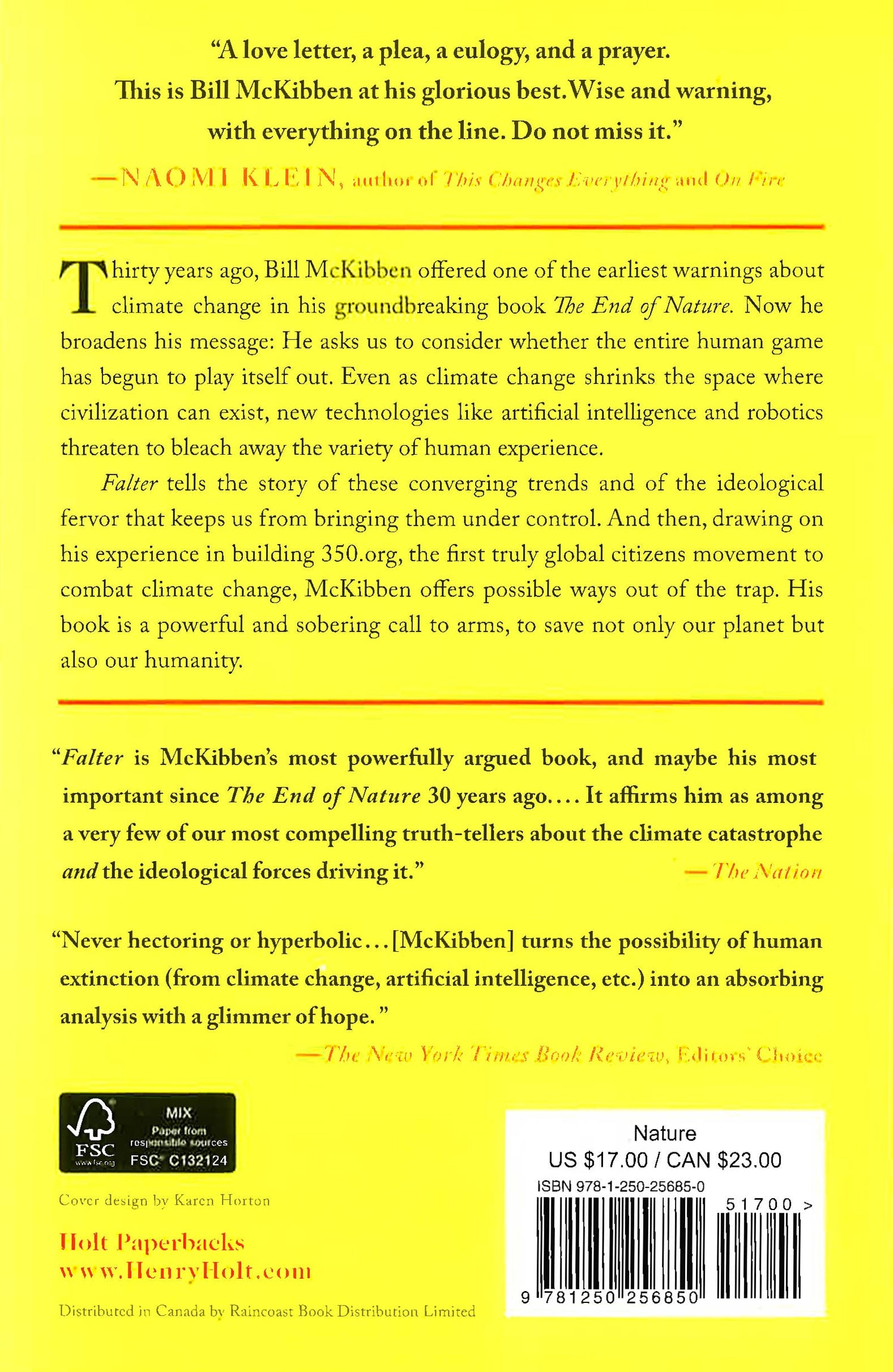 Falter tells the story of these converging trends and of the ideological fervor that keeps us from bringing them under control. And then, drawing on McKibben's experience in building 350.org, the first truly global citizens movement to combat climate change, it offers some possible ways out of the trap. We're at a bleak moment in human history -- and we'll either confront that bleakness or watch the civilization our forebears built slip away.