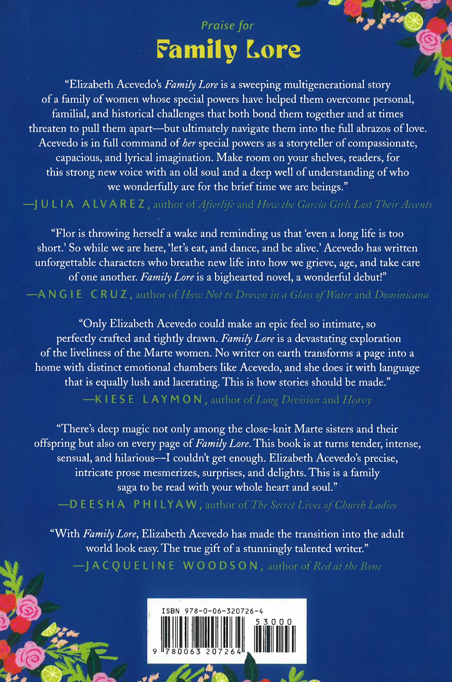Spanning the three days prior to the wake, Family Lore traces the lives of each of the Marte women, weaving together past and present, Santo Domingo and New York City. Told with Elizabeth Acevedo's inimitable and incandescent voice, this is an indelible portrait of sisters and cousins, aunts and nieces--one family's journey through their history, helping them better navigate all that is to come.