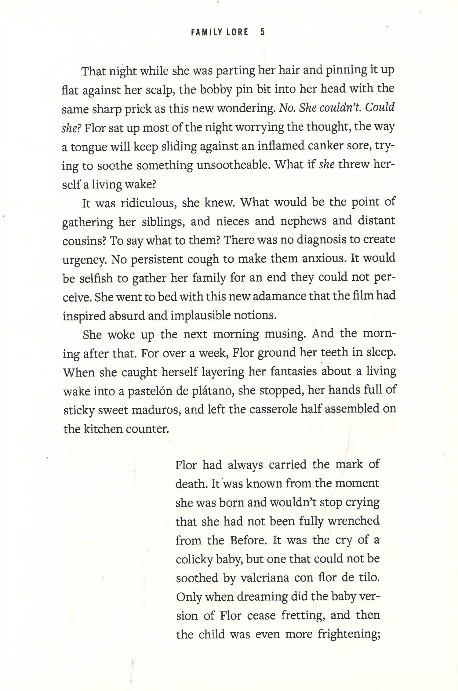 Flor has a gift: she can predict, to the day, when someone will die. So when she decides she wants a living wake--a party to bring her family and community together to celebrate the long life she's led--her sisters are surprised. Has Flor foreseen her own death, or someone else's? Does she have other motives? She refuses to tell her sisters, Matilde, Pastora, and Camila.