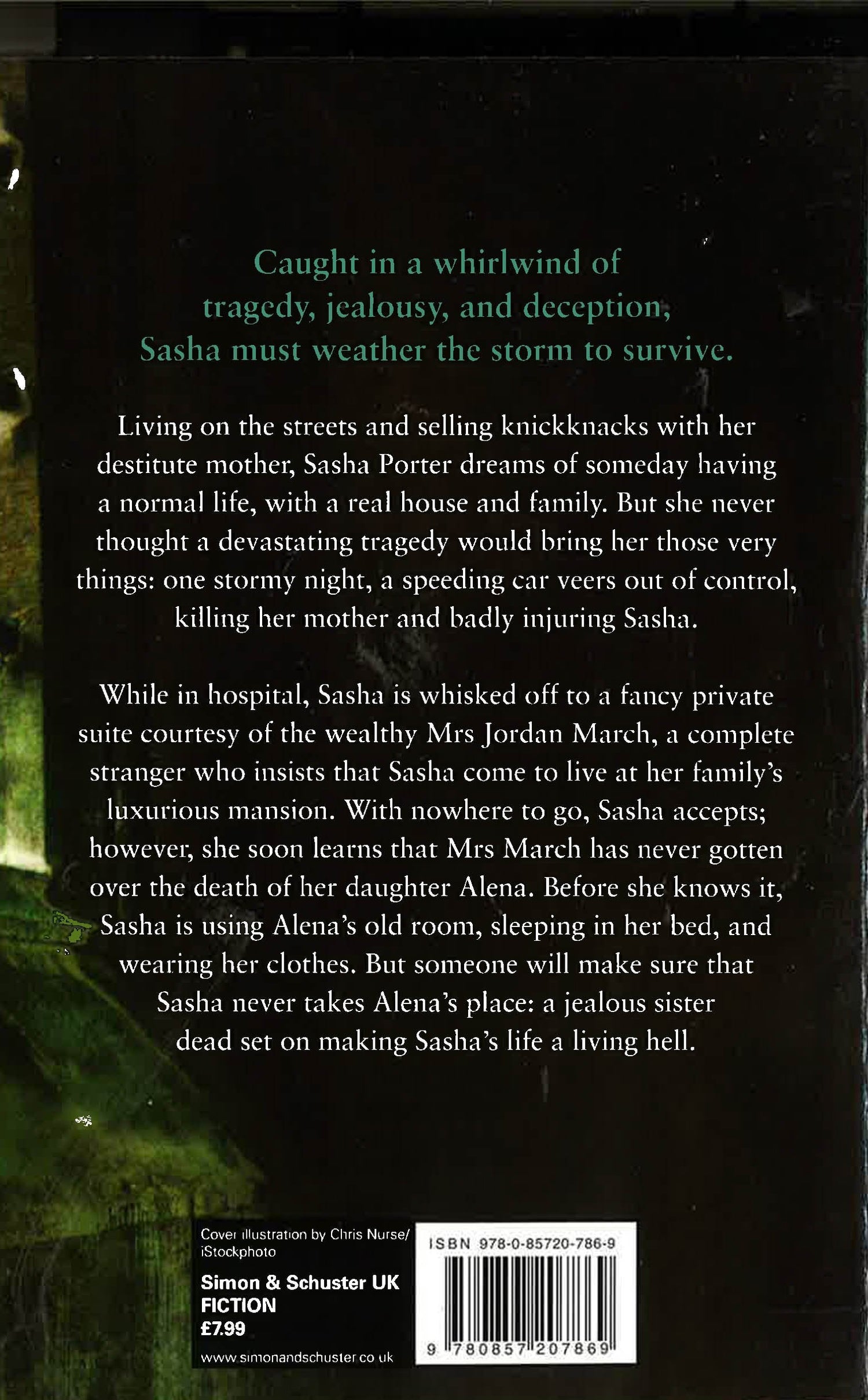 Living on the streets and selling knickknacks with her destitute mother, Sasha Porter dreams of someday having a normal life, with a real house and family. But she never thought a devastating tragedy would bring her those very things: one stormy night, a speeding car veers out of control, killing her mother and badly injuring Sasha. While in hospital, Sasha is whisked off to a fancy private suite courtesy of the wealthy Mrs Jordan March, a complete stranger who insists that Sasha come to live at her family's luxurious mansion. With nowhere to go, Sasha accepts; however she soon learns that Mrs March has never gotten over the death of her daughter Alena. Before she knows it, Sasha is using Alena's old room, sleeping in her bed and wearing her clothes. But someone will make sure that Sasha never takes Alena's place: a jealous sister dead set on making Sasha's life a living hell.