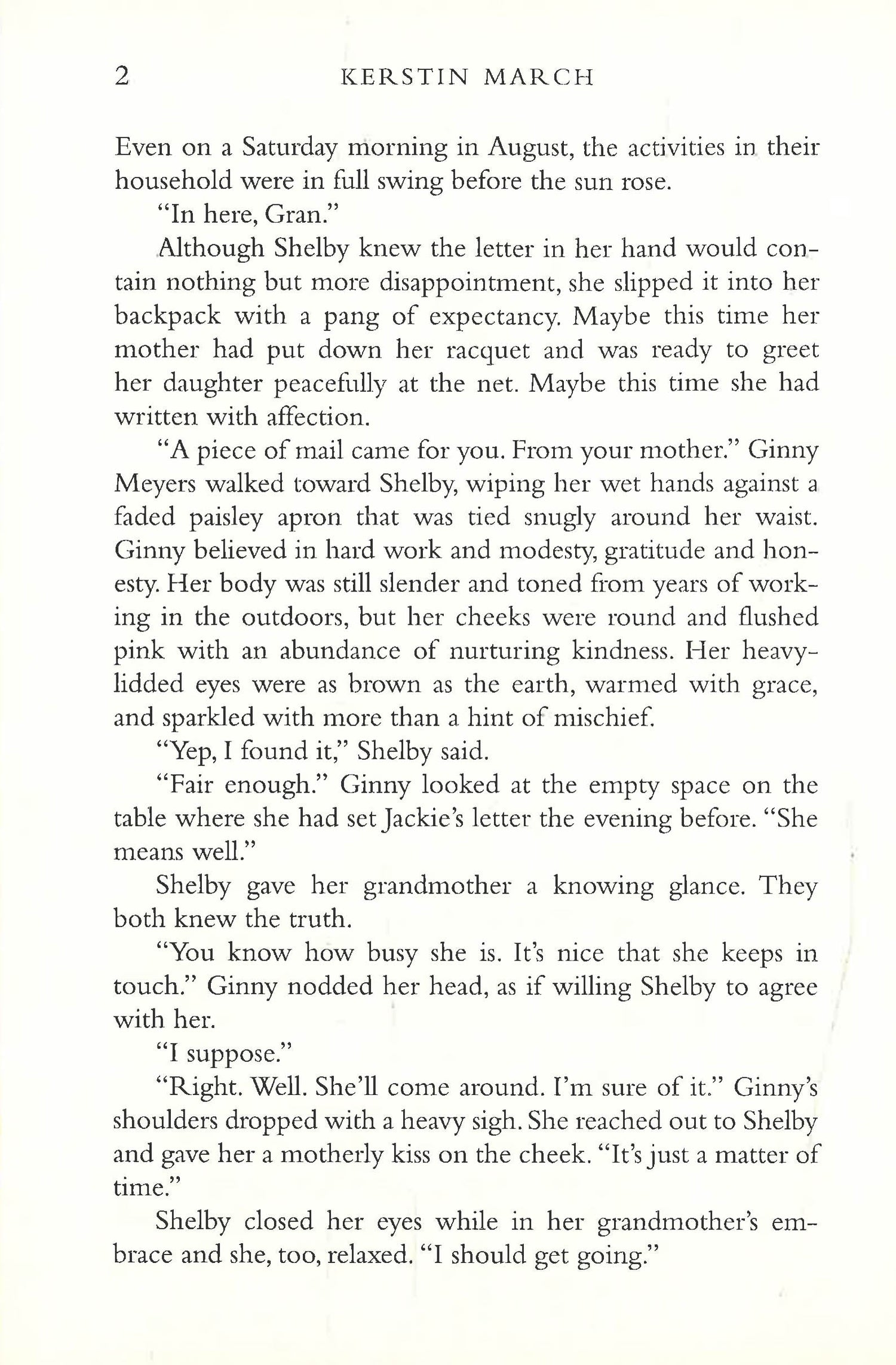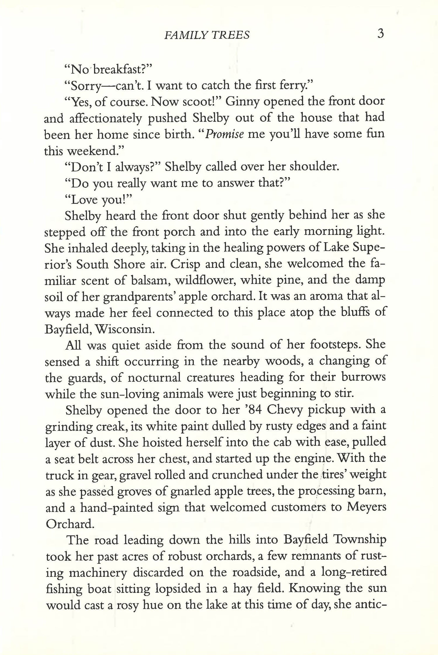 In this moving and insightful debut novel set along the breathtaking shores of the Great Lakes, a young woman must decide which dreams are worth fighting for, and which roots to keep firmly in place... Sensible and self-reliant, Shelby Meyers knows exactly what she wants. She'll never again depend on her errant mother, Jackie, who abandoned Shelby when she was a baby--and is forever searching for an elusive, glittering life. All Shelby needs is her beautiful, windswept Lake Superior, her loving grandparents, and the treasured-but-struggling family apple orchard she helps run--until a new love, Ryan Chambers, opens her heart to chance, and her eyes to a wider world than she ever imagined. But just as Shelby is looking toward an exciting future, Jackie unexpectedly returns--determined to make up for the past and "help" her daughter get everything she never could. Her confidence shaken, Shelby finds herself at odds with Ryan, and with his wealthy family's overbearing expectations. Now, through wrenching change and sudden loss, Shelby must find a way to see herself, and her mother, in a new light, forge an all-too-fragile understanding--and risk the kind of freedom that brings its own unexpected, enduring rewards...