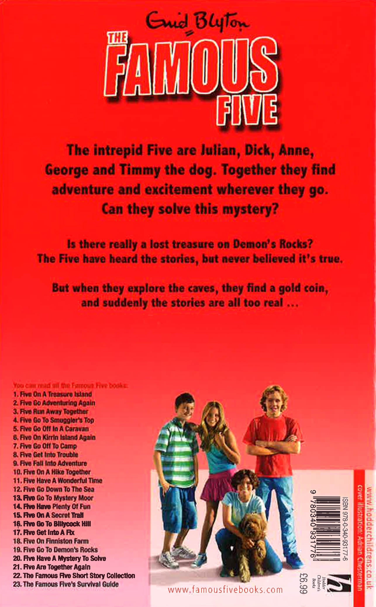 Julian, Dick, Anne, George and Timmy the dog find excitement and adventure wherever they go in Enid Blyton's most popular series.In book nineteen, the Famous Five travel to Demon's Rocks and discover a very old and valuable gold coin. Demon's Rocks is famous for its stories of bountiful treasure, but if the myth is reality, who does the treasure belong to? The Five are determined to find out, but first they need to know who else is exploring Demon's Rocks for the treasure...The text in this edition has been sensitively edited for today's reader and is unillustrated.