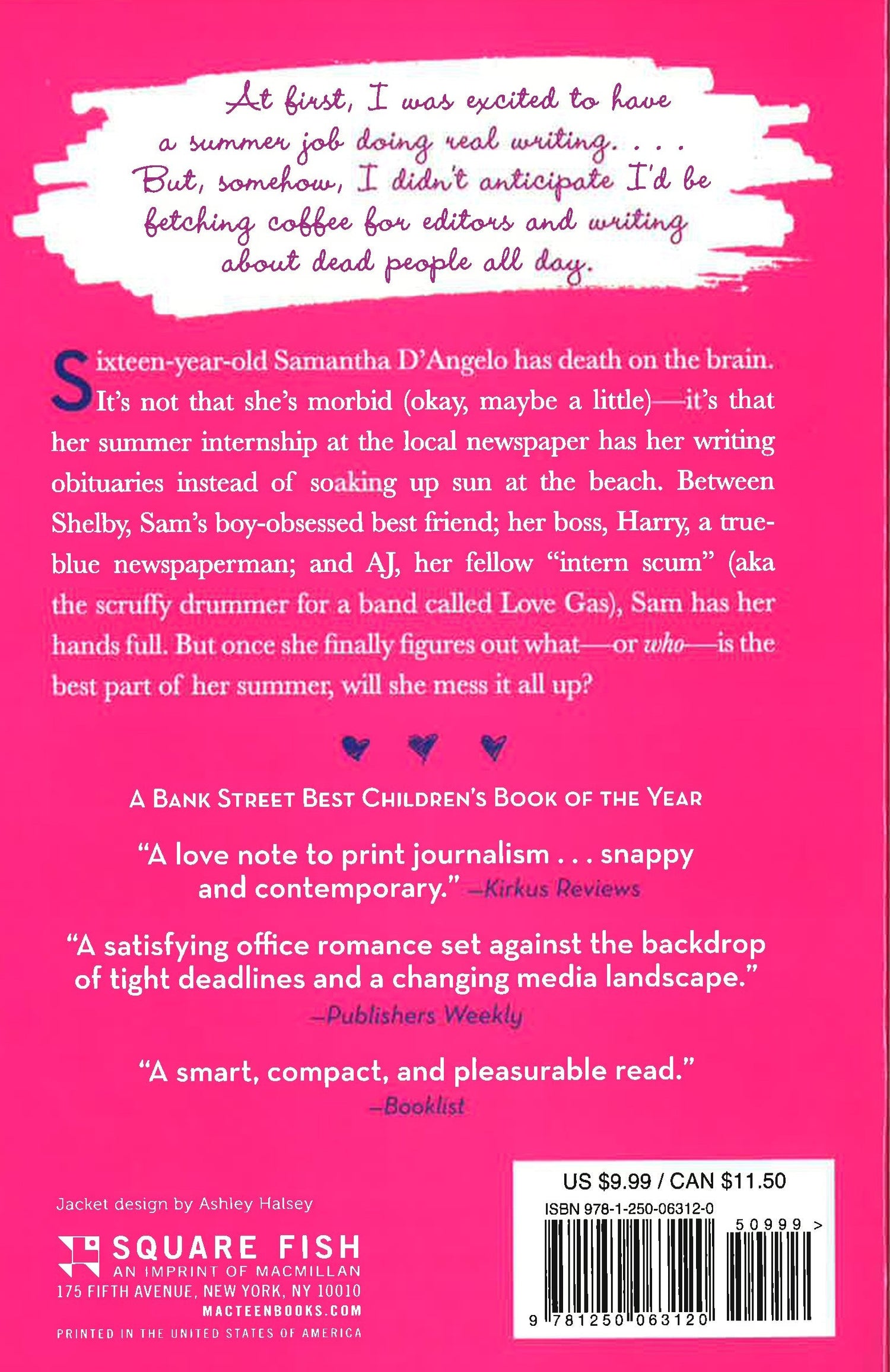 Sixteen-year-old Samantha D'Angelo has death on the brain. Her summer internship at the local newspaper has her writing obituaries instead of soaking up the sun at the beach. Between Shelby, Sam's boy-crazy best friend; her boss Harry, a true-blue newspaper man; and AJ, her fellow "intern scum" (aka the cute drummer for a band called Love Gas), Sam has her hands full. But once she figures out what - or who - is the best part of her summer, will she mess it all up? As Sam learns her way around both the news room and the real world, she starts to make some momentous realizations about politics, ethics, her family, romance, and most important - herself.