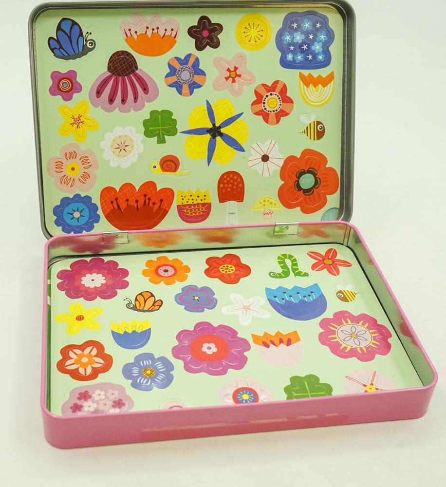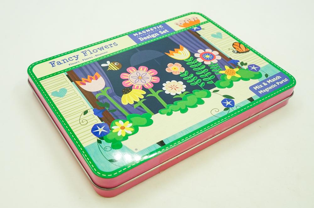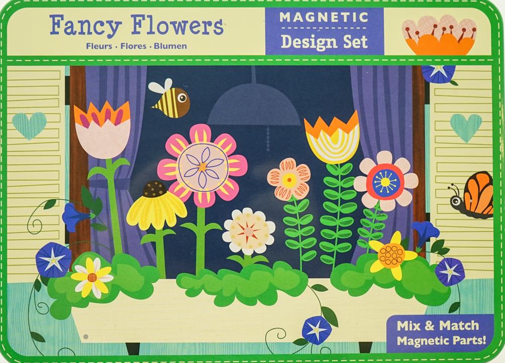 Mudpuppy Fancy Flowers Magnetic Design Sets provide hours of portable fun. Jenn Ski has illustrated background scenes of a window box, a large vase, a garden trellis with vine, and a garden path with a three-tiered fountain. - 3 sheets of interchangeable magnets with 4 illustrated scenes on 2 double-sided cards - Hinged tin measures 8-3/4 x 6-3/8 x 1" (22 x 16 x 2.5 cm)- Product is phthalate free and printed with nontoxic ink.