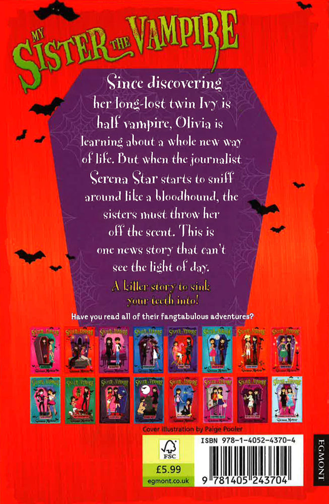 Perfect for fans of Goth Girl, this addictive supernatural series is ideal for girls of 9+ to sink their fangs into... Olivia is a vegetarian. Ivy is a vampire. And they're twins?!? Ever since Olivia discovered that her long-lost twin sister, Ivy, is a vampire, she's been soaking up everything Ivy will tell her about Franklin Grove's vampire community. It's all top secret, and Olivia's sworn that she'll never tell another soul. But now, nosy tabloid reporter Serena Star is sniffing around like a bloodhound. As she gets closer and closer to the truth, it's up to Ivy and Olivia to throw her off the scent. This is one fangtastic news story that can't see the light of day! These kinds of situations only happen in My Sister the Vampire. A vampire book for girls who want to read about young love and innocent paranormal romance. Ideal for fans of Jacqueline Wilson, Meg Cabot, and Zoe (Zoella) Sugg. Have you collected the whole `My Sister the Vampire' series? Switched Fangtastic! Revamped! Vampalicious! Take Two Love Bites Lucky Break Star Style Twin Spins! Date with Destiny Flying Solo Stake Out! Double Disaster! Flipping Out! Secrets and Spies Fashion Frightmare Spooktacular! Fangs for the Memories Look out for Sienna Mercer's other great series, `My Brother the Werewolf'. Sienna Mercer grew up in Toronto, Canada. She was an only child, and always wanted a brother or sister - especially a twin. A twin would have been awesome! Sadly, she never got that sister so, when she was grown up, she did the next best thing - she wrote stories for girls about a girl who reminded her of herself, and gave her the most fun, fabulous twin she could imagine . . . a vampire twin.