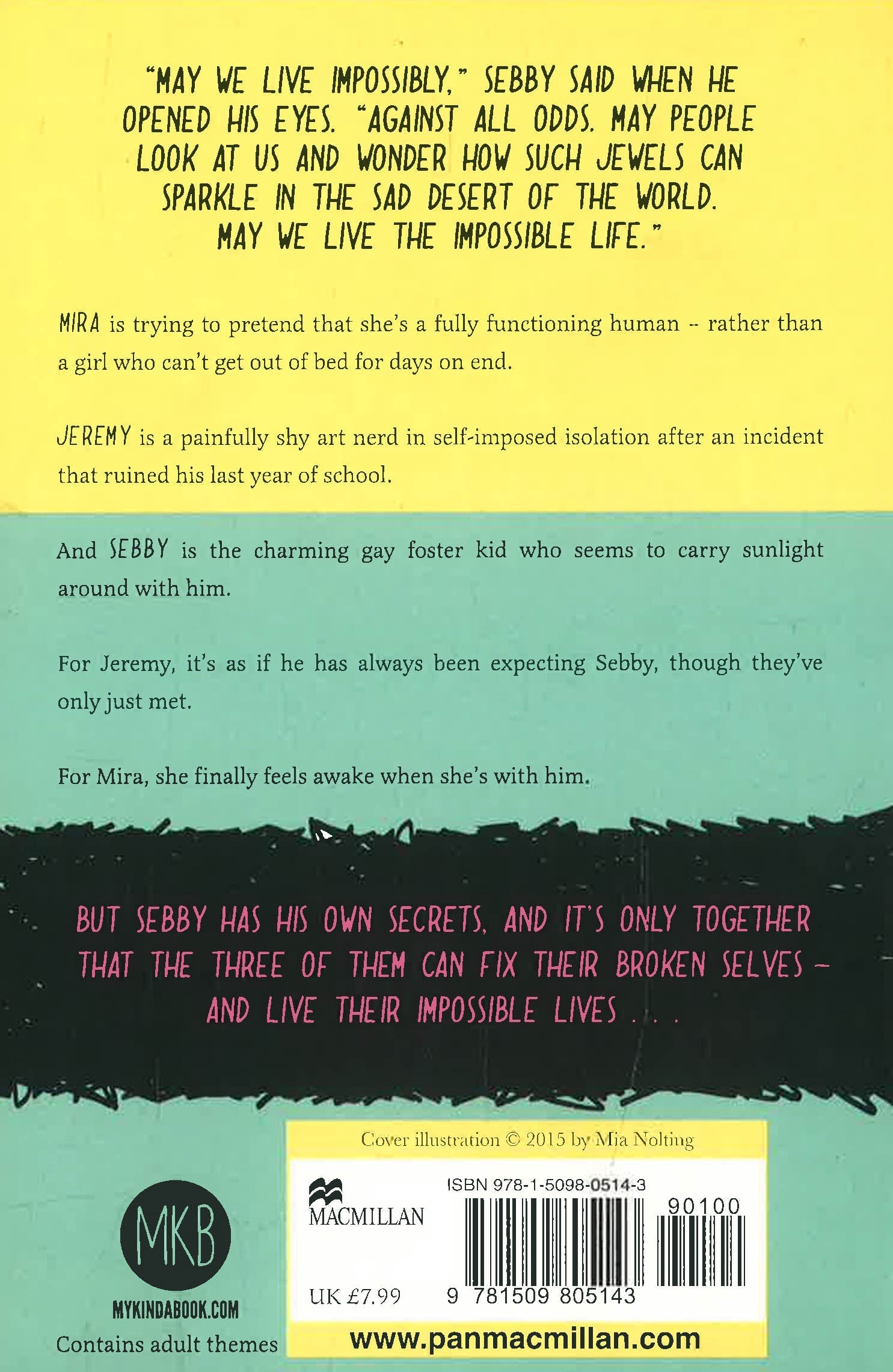 As Jeremy finds himself drawn into Sebby and Mira's world, he begins to understand the secrets that they hide in order to protect themselves, to keep each other safe from those who don't understand their quest to live for the impossible.