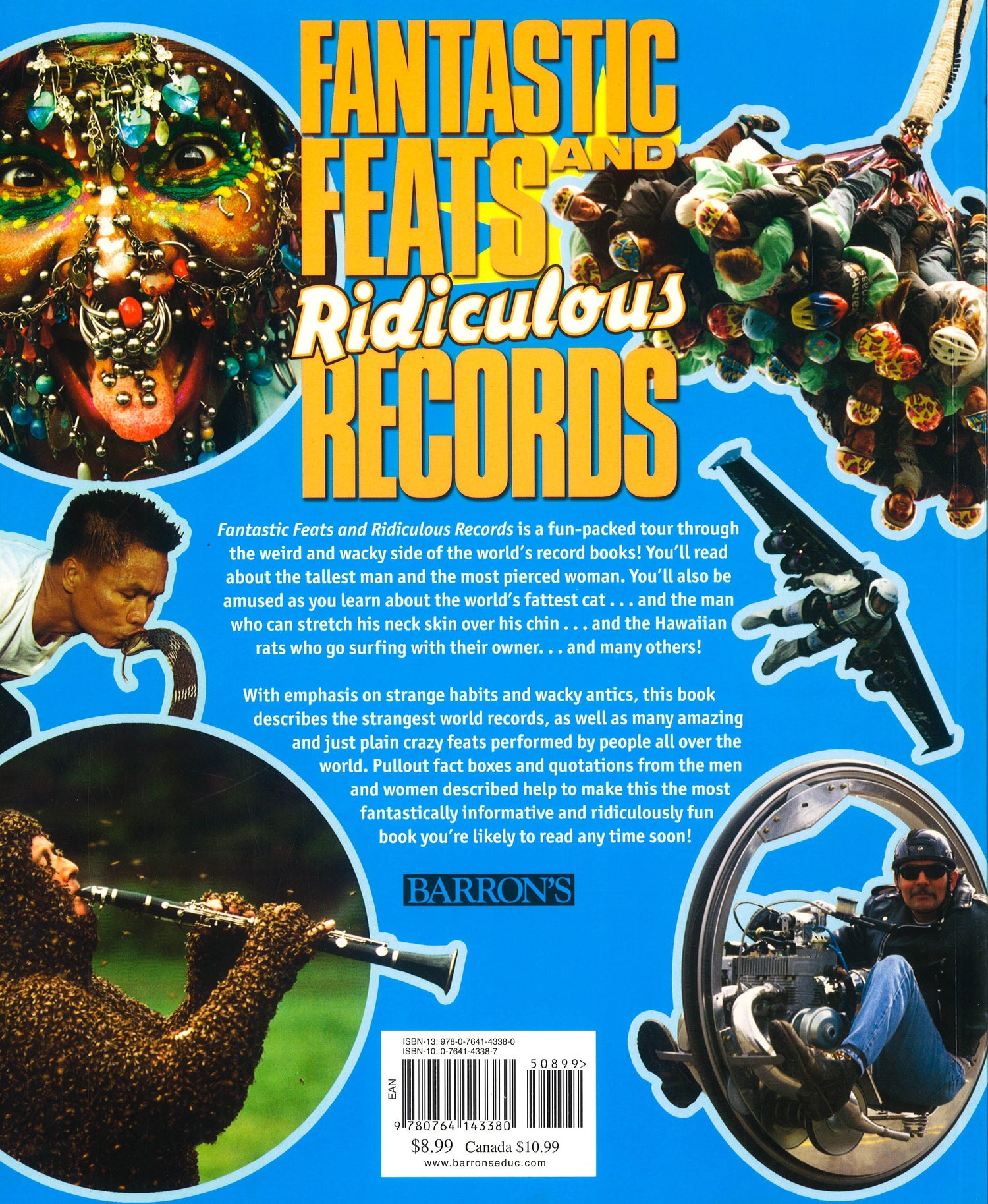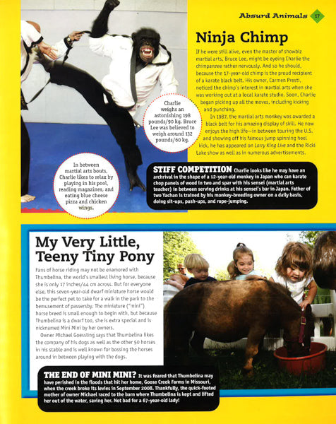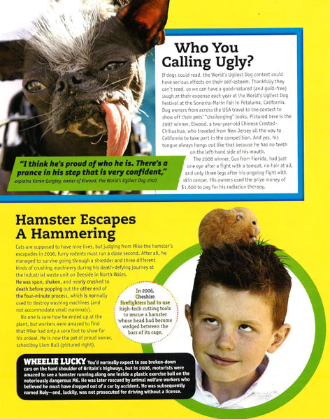 People are funny--and so are many animals when they're encouraged by their human keepers! Here's a tour of the weird and wacky side of life around the world, with surprises and laughs for older boys and girls. They'll read about people with unusual bodies, including the tallest and the shortest, as well as the man with the most tattoos, a woman with the longest fingernails, an 80-year-old body builder, and a studs-and-rings-decorated woman who calls herself The Human Pincushion. Among the world's most preposterous pastimes and silliest sports recounted here are cheese rolling contests, a crying baby competition, and so-called Underwater Olympics. Just two among the dozens of animal antics recounted include a report on Olympic games for pigs, held in Moscow in 2006, and the story of Fin and Tofu, a pair of New Zealand rats who go surfing with their owner. They're all reported in detail, with color photos as supporting evidence and amusing pull-out features that add crazy details to the stories. All entries come with funny quotations from the zany people whose feats are recorded in this book. This collection of ridiculous achievements will keep kids laughing every time they turn a page. Includes 160 color photos.