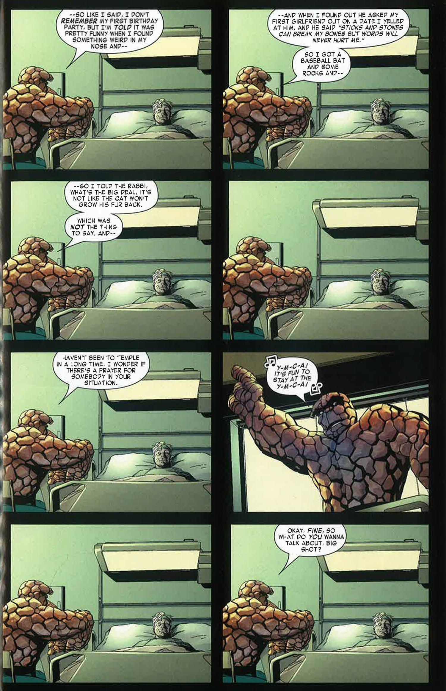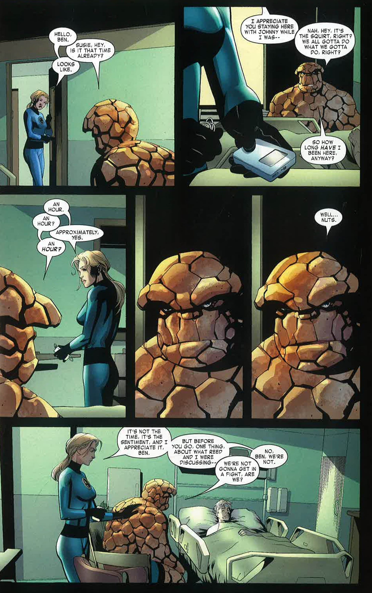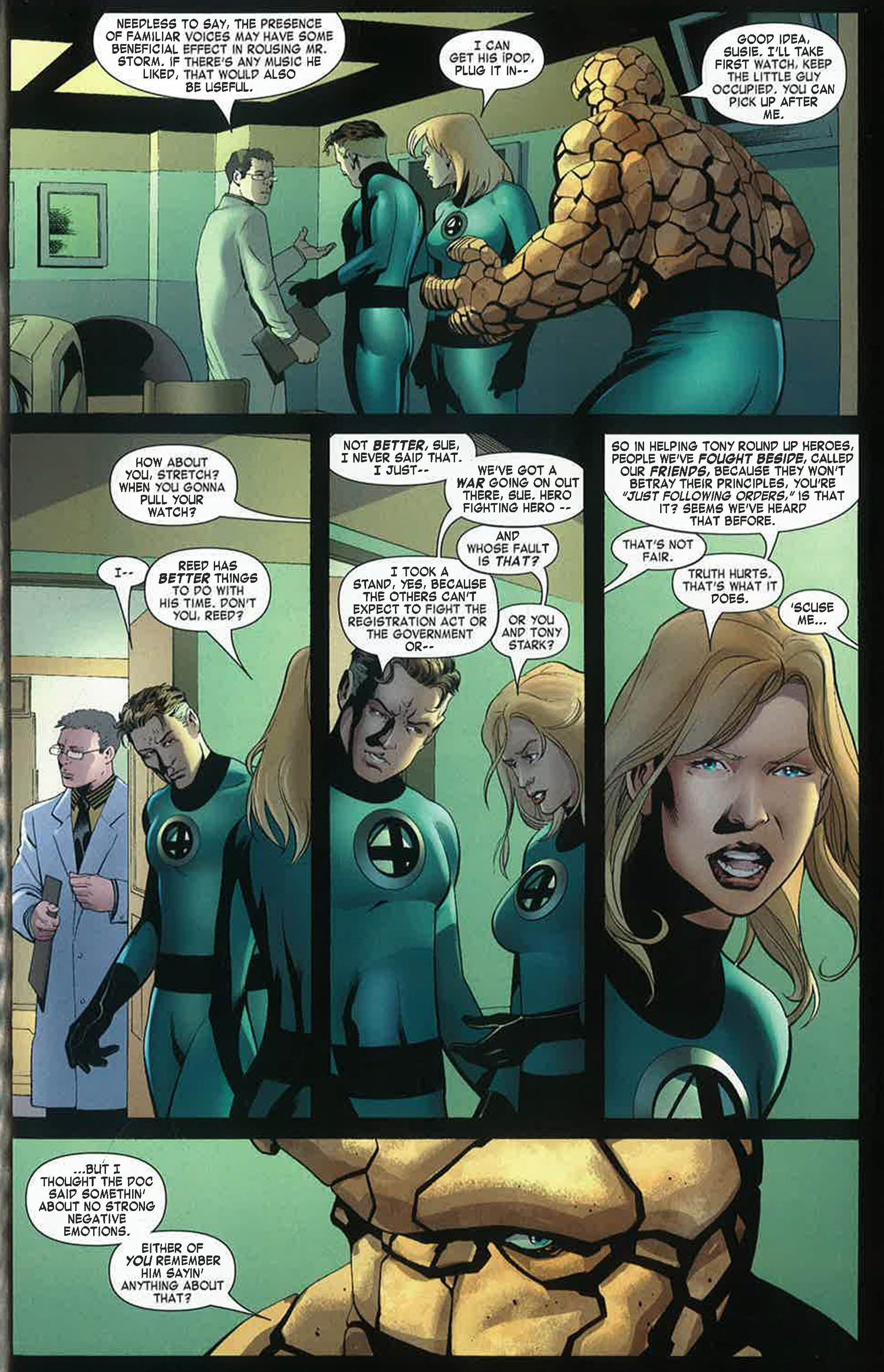 One member of the Fantastic Four lies hospitalised, a casualty of the Civil War that has fragmented the superhuman community. Another member is secretly helping the opposition. Who will toe the line, who will join the resistance, and who will leave the battlefield altogether?
