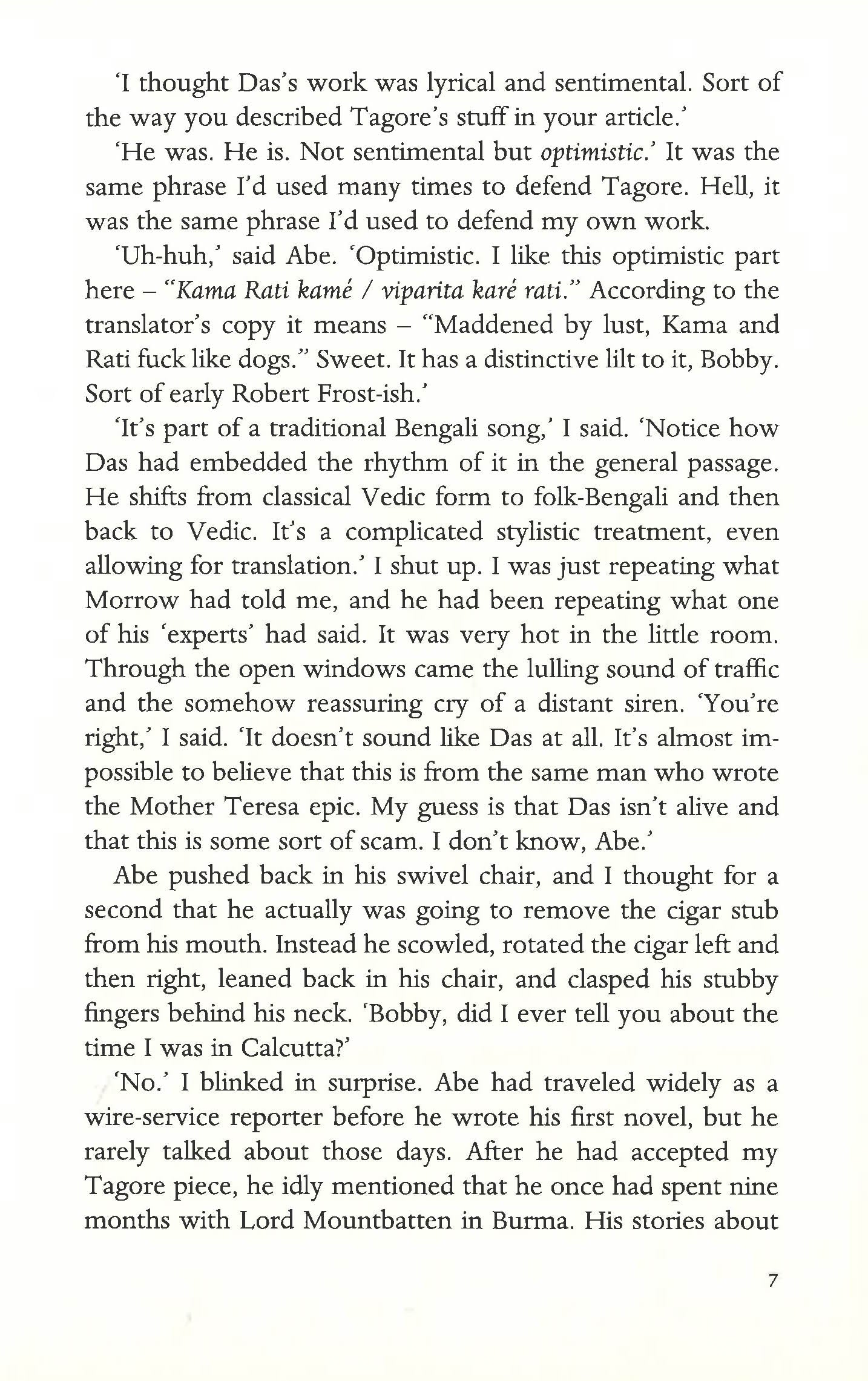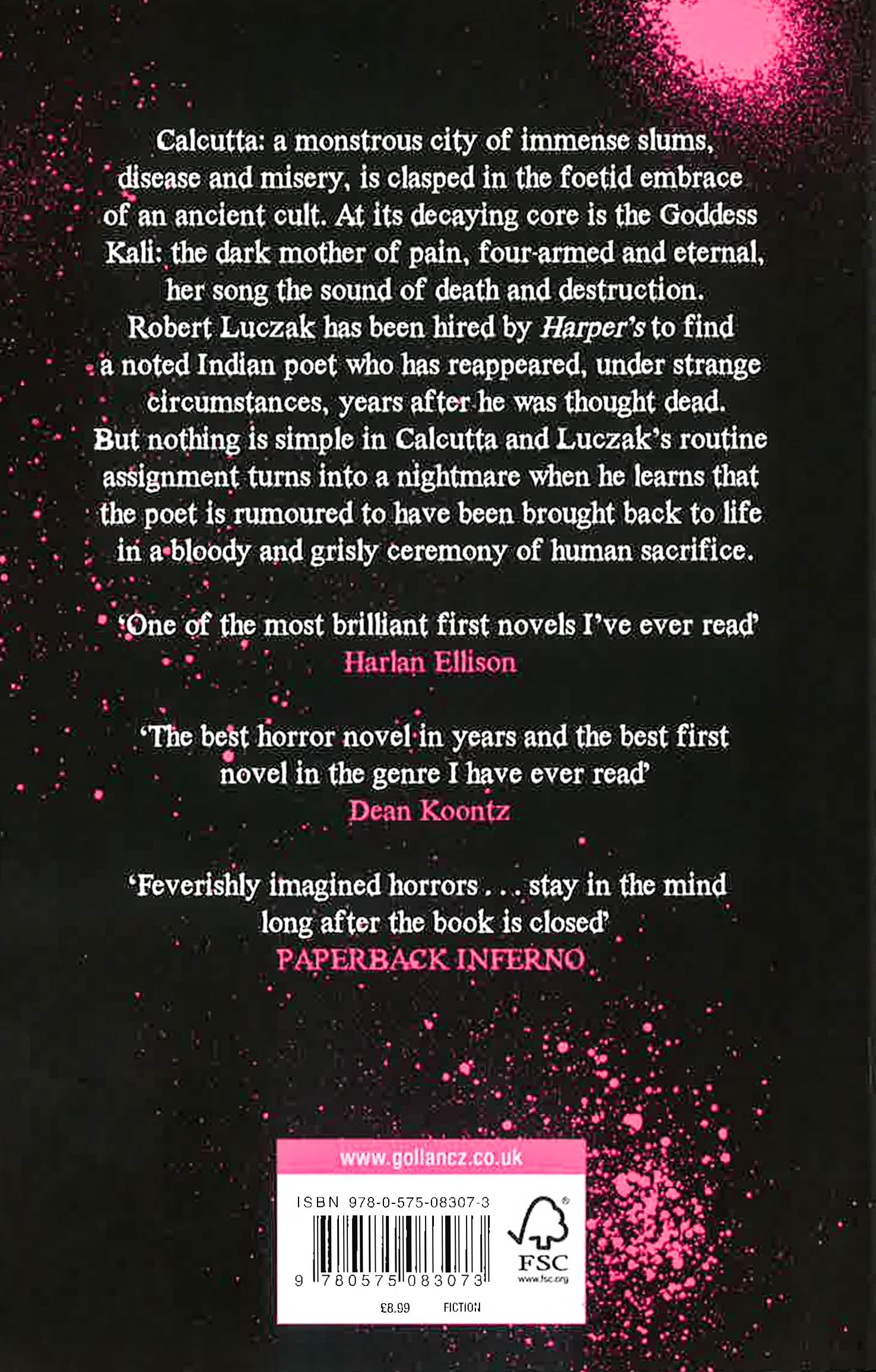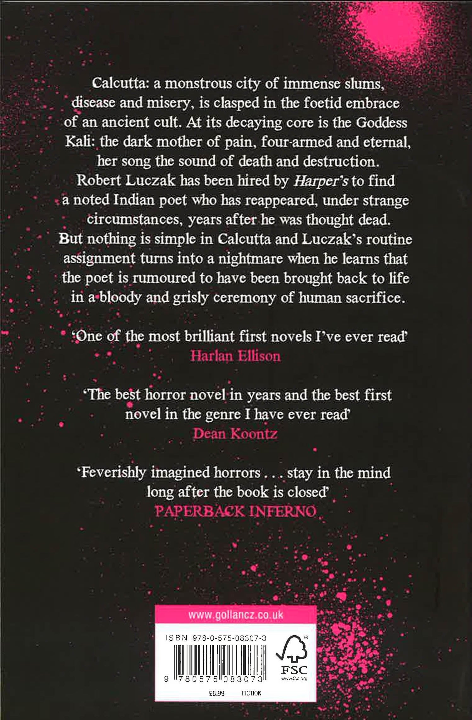 Calcutta, a monstrous city of immense slums, disease and misery, is clasped in the foetid embrace of an ancient cult. At its decaying core is the Goddess Kali: the dark mother of pain, four-armed and eternal, her song the sound of death and destruction. Robert Luczak has been hired by a New York magazine to find a noted Indian poet who has reappeared, under strange circumstances, years after he was thought dead. But nothing is simple in Calcutta, and before long Luczak's routine assignment turns into a nightmare ... it is rumoured that the poet has been brought back to life, in a bloody and grisly ceremony of human sacrifice.