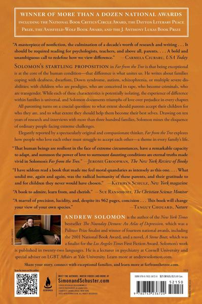 Solomon?s startling proposition in Far from the Tree is that being exceptional is at the core of the human condition?that difference is what unites us. He writes about families coping with deafness, dwarfism, Down syndrome, autism, schizophrenia, or multiple severe disabilities; with children who are prodigies, who are conceived in rape, who become criminals, who are transgender. While each of these characteristics is potentially isolating, the experience of difference within families is universal, and Solomon documents triumphs of love over prejudice in every chapter. All parenting turns on a crucial question: to what extent should parents accept their children for who they are, and to what extent they should help them become their best selves. Drawing on ten years of research and interviews with more than three hundred families, Solomon mines the eloquence of ordinary people facing extreme challenges. Elegantly reported by a spectacularly original and compassionate thinker, Far from the Tree explores how people who love each other must struggle to accept each other?a theme in every family?s life. This book has remainder mark
