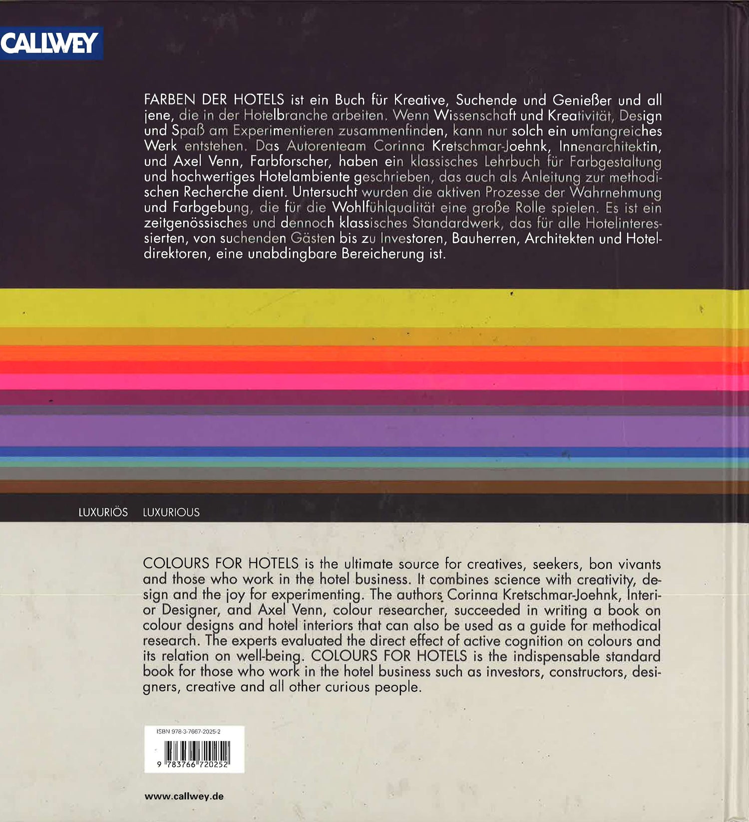 COLORS OF HOTELS, is a book for creative minds, seekers, and connoisseurs, as well as all those working in the hotel industry. Only when science and creativity, design and the joy of experimentation come together can such a captivating work emerge. The author team, Corinna Kretschmar-Joehnk, interior designer, and Axel Venn, color researcher, have written a classic textbook for color design and high-quality hotel ambiance, which also serves as a guide to methodical research. They examined the active processes of perception and color, which play a major role in the quality of well-being.
