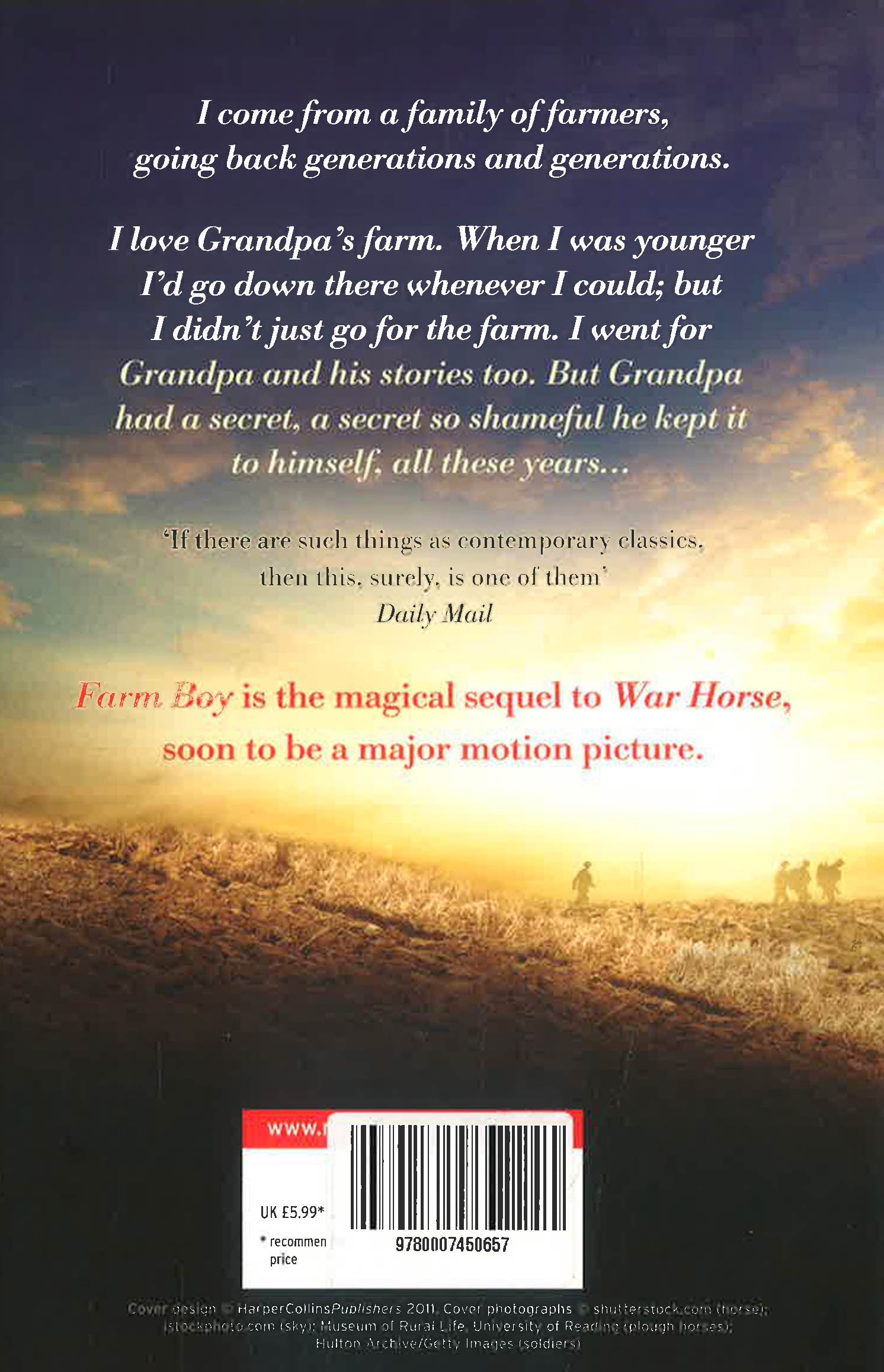 Joey was the last working horse on the farm, and the apple of Grandpa’s eye. In War Horse, Joey was sent away from the farm to be a warhorse in WWI. Grandpa had joined the cavalry in order to find, and fight, with Joey. Farm Boy brings us forward fifty years with Grandpa not only telling his grandson, Joey’s story but also a ‘shameful secret’ which he has held for years…
