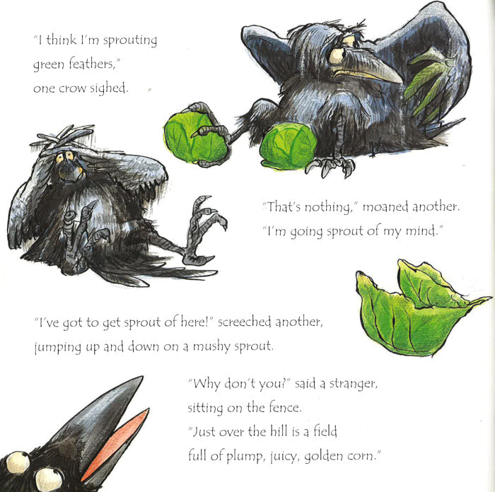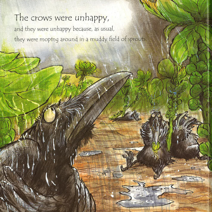 Having been frightened away by Farmer Ham, the crows are growing bored with sprouts... Two enterprising crows turn up and soon all the crows are back in Farmer Ham's field, having discovered that the sinister scarecrow is harmless.