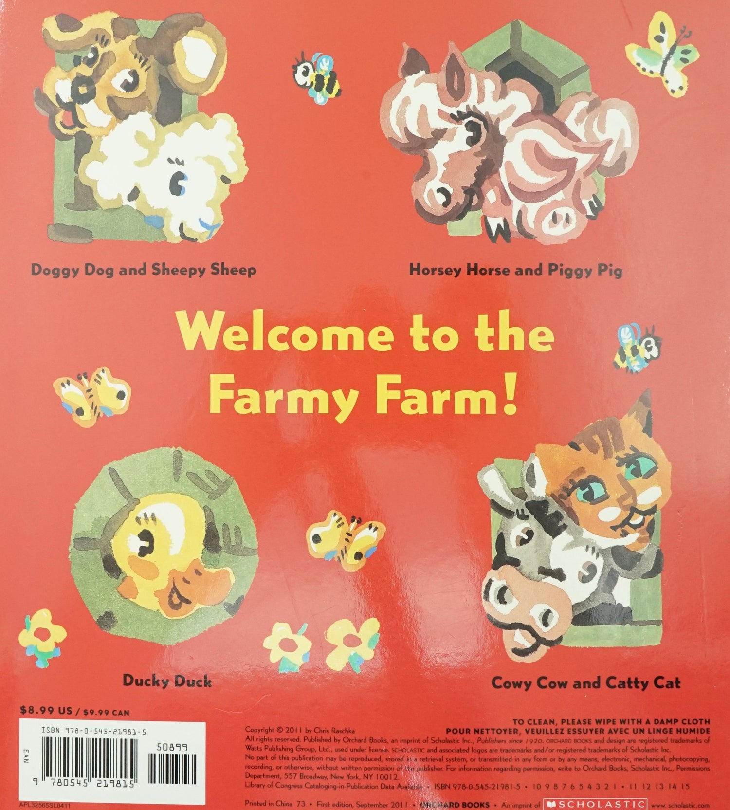 Touch and feel the animals on the farm in Chris Raschka's new felt book! Come on the farm with the horse, dog, cow, cat, pig, duck, and sheep for some touch-and-feel fun in a brand-new felt board book! FARMY FARM is a board book. FARMY FARM is a felt book. FARMY FARM is both. The book features sturdy, touch-and-feel felt pages paired with a fun rhyming text and animal sounds by Caldecott Award winner Chris Raschka. "Ducky Duck, how about a snack? Ducky Duck, now you say Quack!